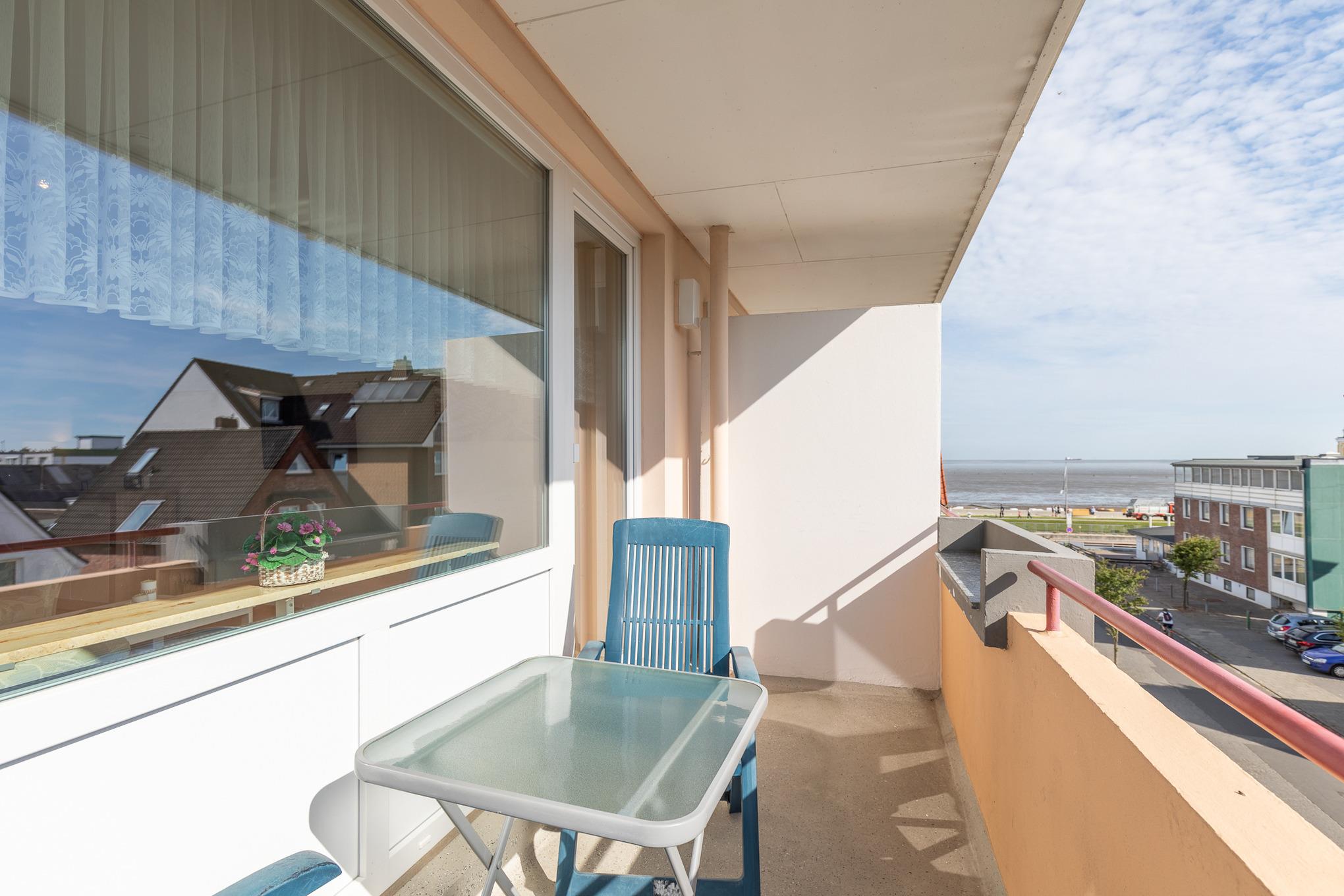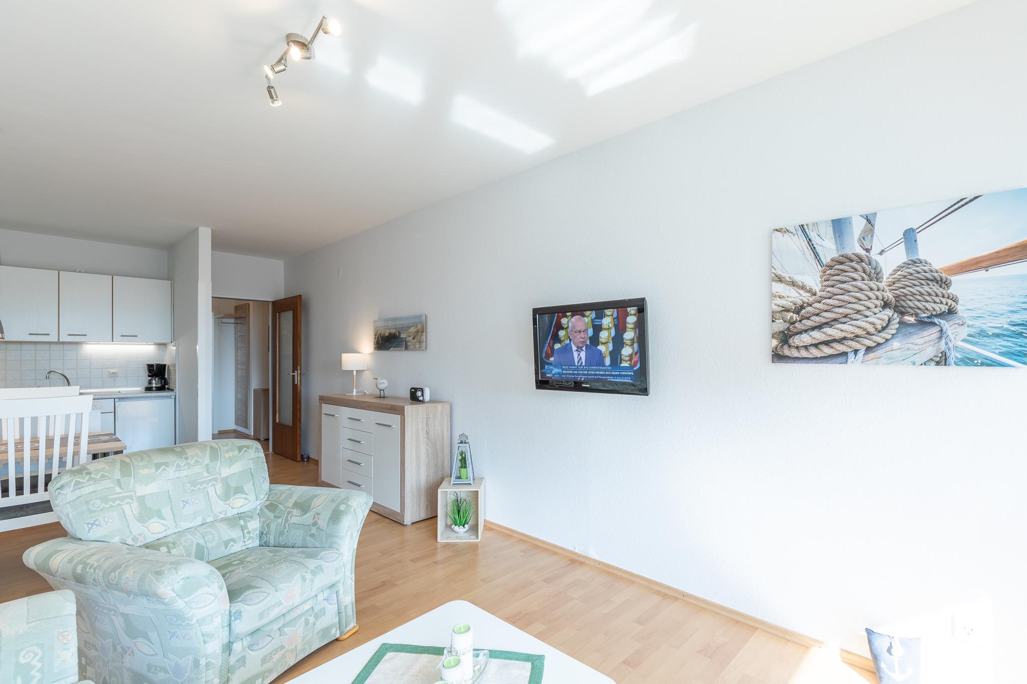 Die Ferienwohnung (2. Obergeschoss) mit einer Größe von ca. 45 m² Wohnfläche ist komplett bis 2 Personen ausgestattet. 1 Wohnzimmer mit Essplatz, 1 Flachbildfernseher, Sofa und Sessel, Küche mit Kühlschrank, Mikrowelle, 4 Plattenkochfeld, Kaffeemaschine, Wasserkocher und Toaster, Kleiderschrank, Flur, Tageslicht Bad mit Dusche und WC, Balkon (vom Balkon aus können Sie Richtung Nordsee, Strand und Promenade blicken), Balkonmöbel, Nichtraucherwohnung, keine Haustiere, PKW-Stellplatz am Haus.