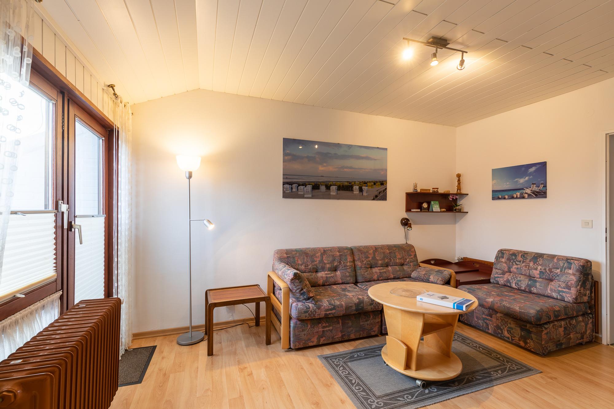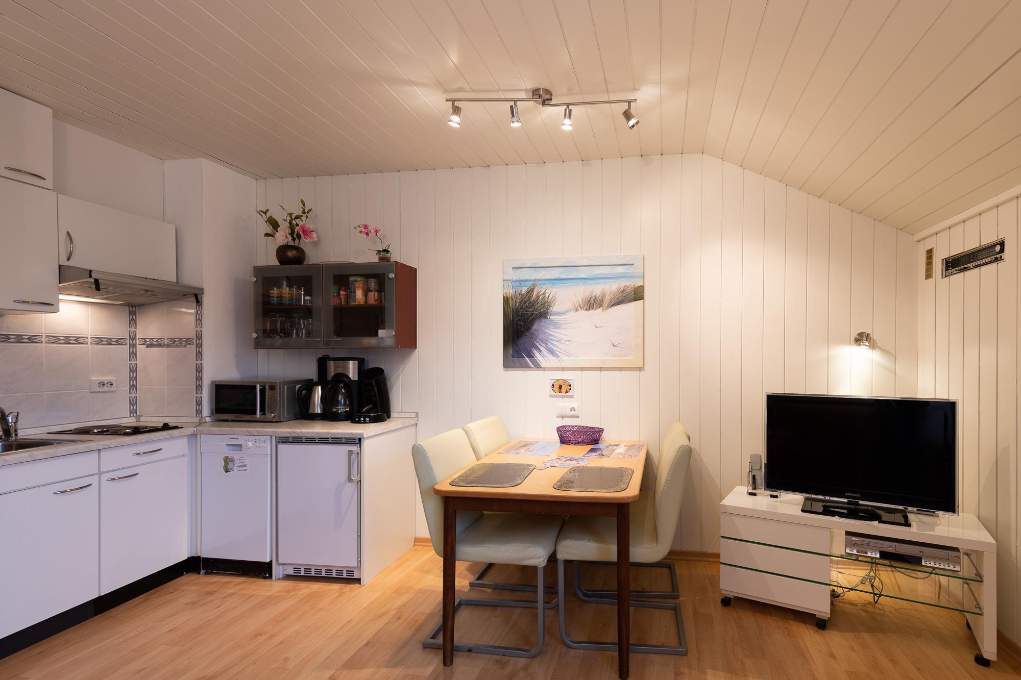 Ein Schlafzimmer mit zwei Einzelbetten + einem Kleiderschrank. Ein Wohnzimmer mit Küchenzeile (Kaffee- und Pad-Maschine, Heißwasser- und Eierkocher, Heißluft/Grill-Mikrowelle, Kühlschrank mit Gefrierfach, Geschirrspülmaschine, 2 Kochplatten), Essplatz, zweitüriger Einbauschrank, Wäscheständer, Staubsauger, Schlaf-Sofa, Sat TV. Balkon mit Sitzmöbel. Bad mit ebenerdiger Dusche + Föhn. Gegensprechanlage/Türöffner. Nichtraucherhaus, keine Haustiere, kostenloser PKW-Stellplatz direkt am Haus, Fahrradunterstand hinterm Haus.