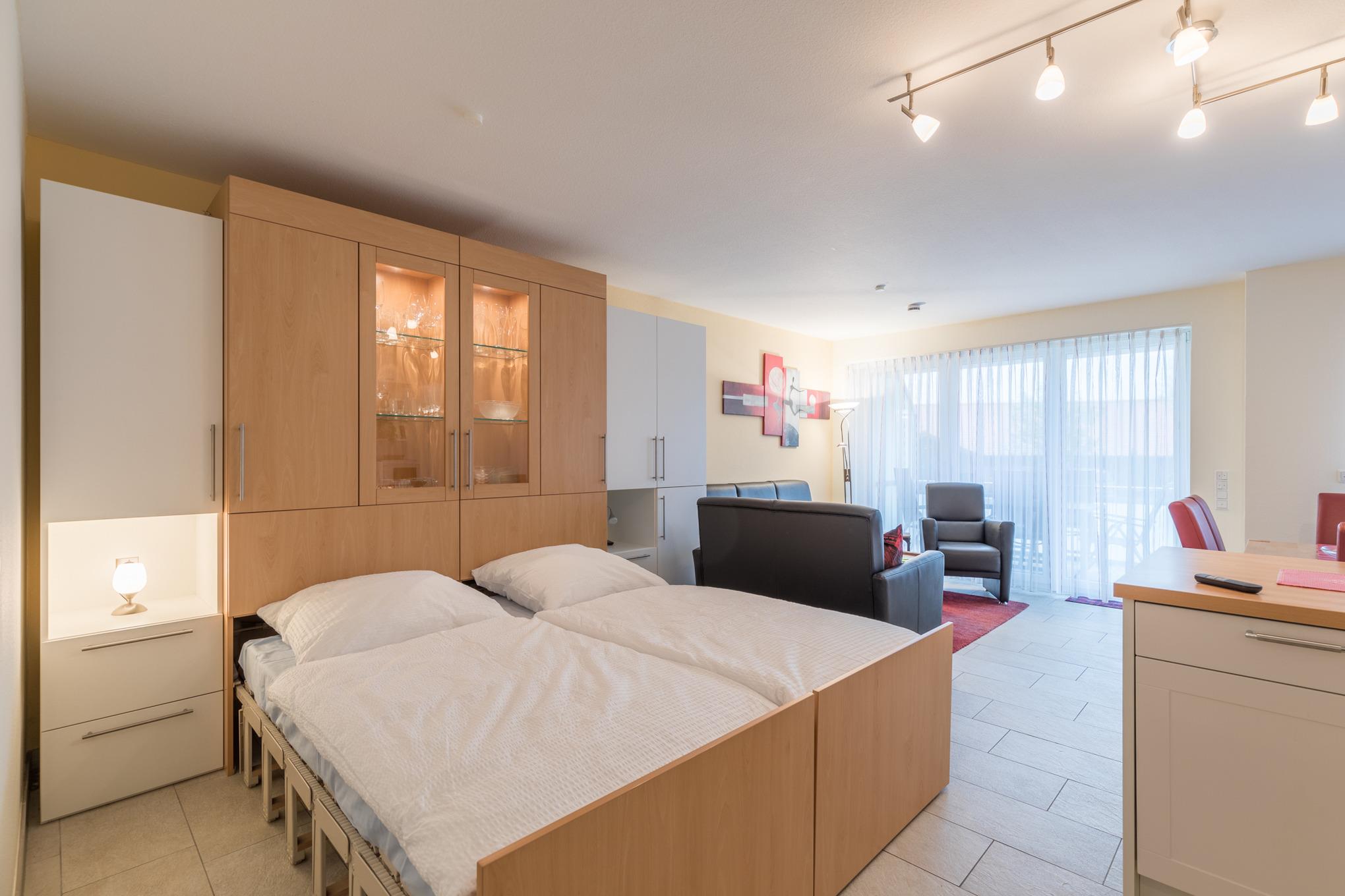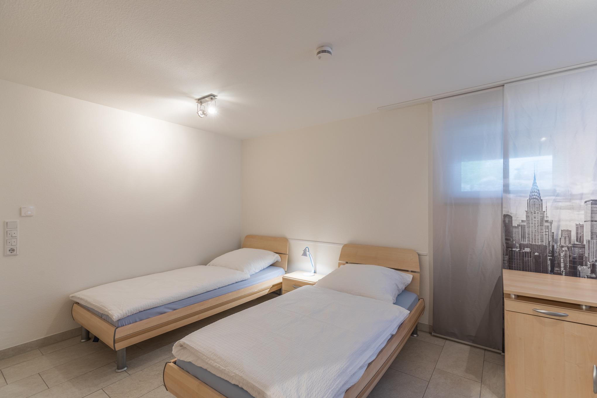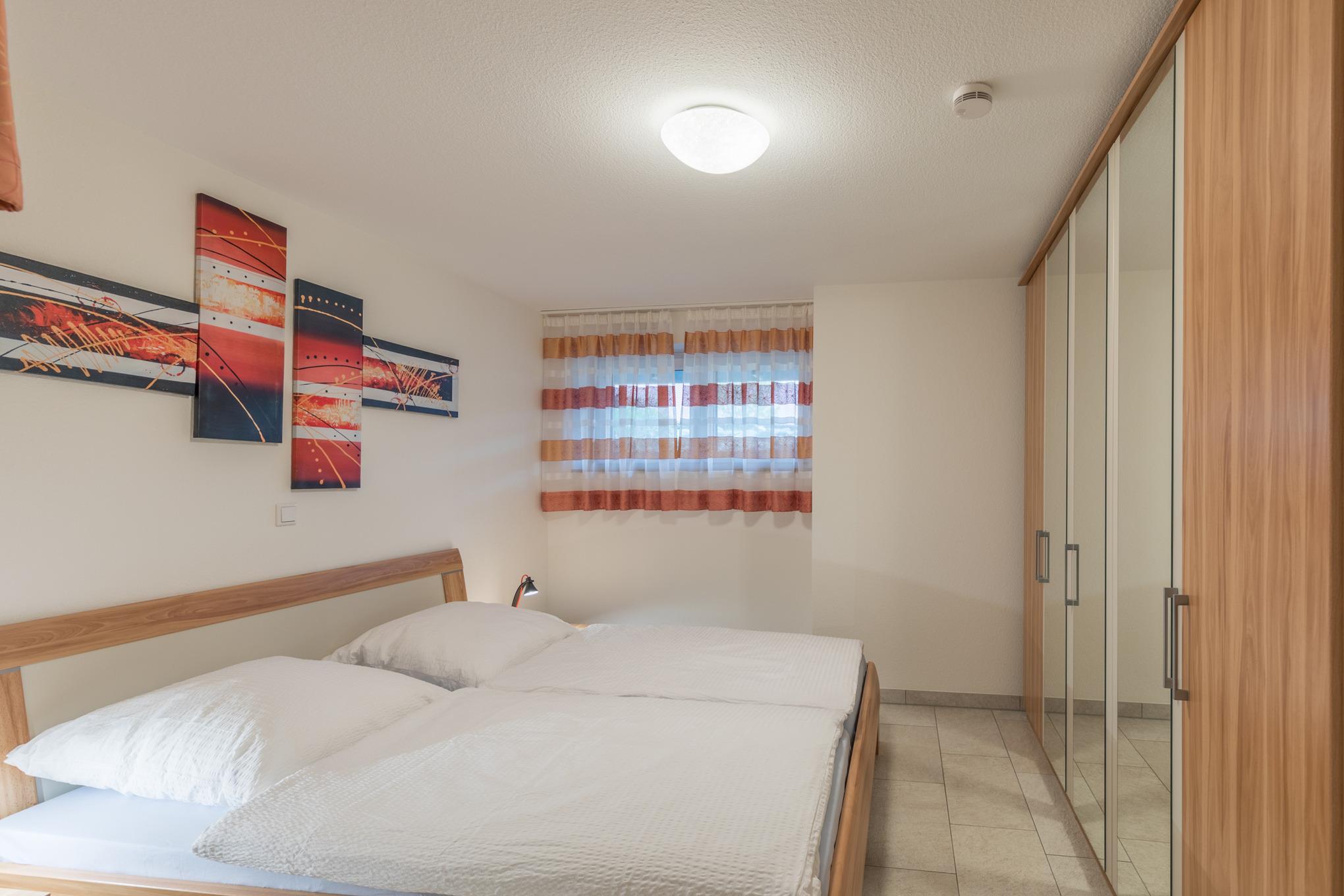 Die modern eingerichtete 3-Raum-Wohnung befindet sich im Erdgeschoss. Das Erdgeschoss wurde in ca. 1,50 angelegt, als Hochparterre. Mit ca. 85 m² Wohnfläche, ist die Wohnung komplett für bis zu 5 Personen ausgestattet, die Schlafzimmer befinden sich im Untergeschoss, dadurch haben Sie an heißen Tagen ein angenehmes Raumklima. Schlafzimmer 1 mit Doppelbett und Kleiderschrank, Schlafzimmer 2 mit 2 Einzelbetten, großzügiges Wohnzimmer mit Einbauküche (Geschirrspüler, Ceranfeld, Backofen, Mikrowelle, Kühlschrank mit Gefrierfach, Toaster, Wasserkocher und Kaffeemaschine), Essplatz,[nbsp][nbsp]gemütliches Sofa, Flatscreen TV, 1 Schrankbett (das elektrisch ausgefahren werden kann) und Zugang zum herrlichen Süd Balkon. Ein Gäste WC mit Dusche befindet sich im Erdgeschoss, im Untergeschoss befindet sich noch ein Badezimmer mit Dusche und WC.