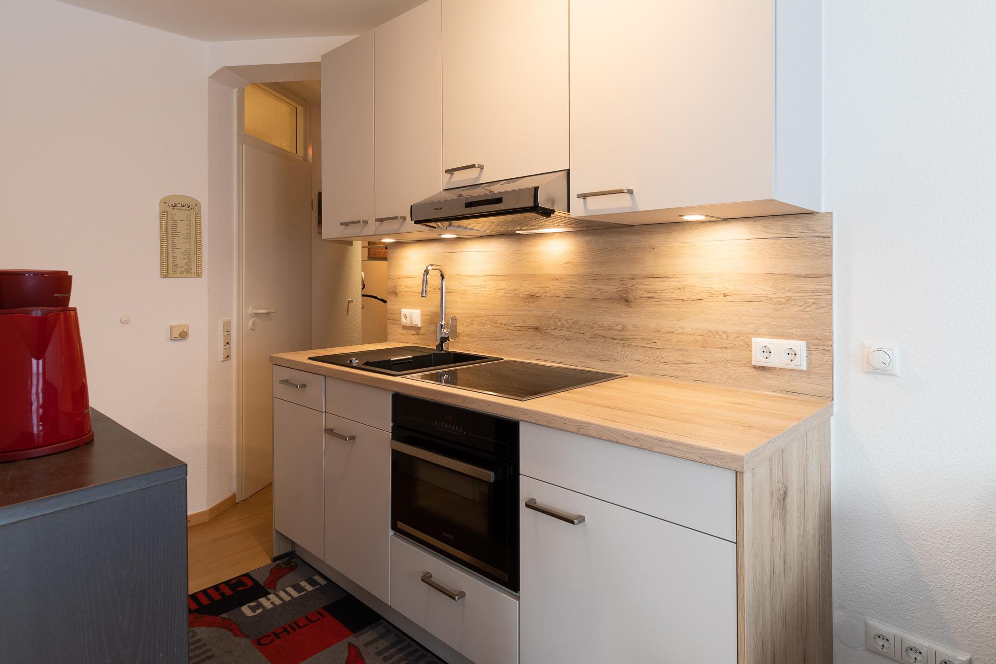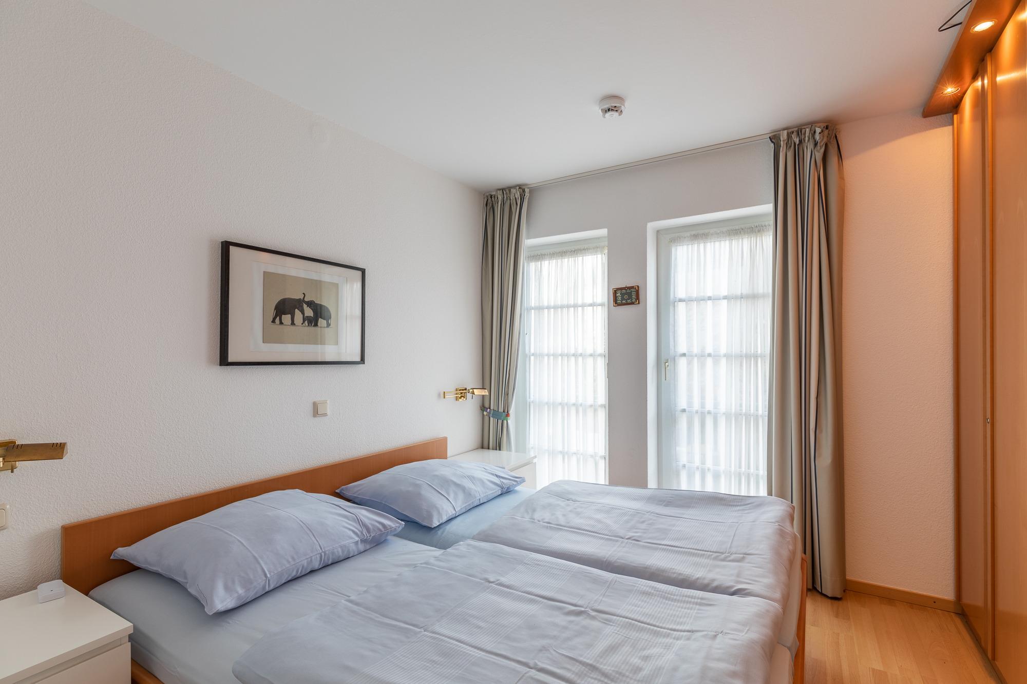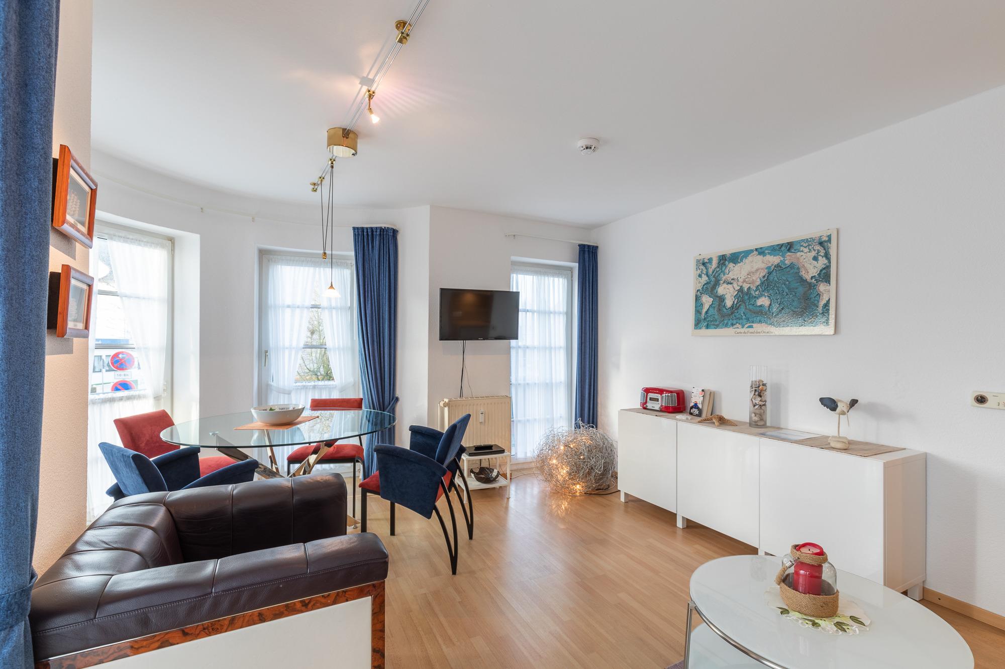 Die Ferienwohnung mit einer Größe von ca. 45m² Wohnfläche (im 1. Obergeschoss) ist komplett bis zu 4 Personen ausgestattet. 1 Wohnzimmer mit Essplatz am Fenster, Sofa-/Schlafsofa, Sessel, 1 Flachbildfernseher, 1 DVD Player, Küchenzeile (Cerankochfeld, kleiner Backofen, Kühlschrank, Kaffeemaschine, Wasserkocher, Toaster und Mikrowelle),1 Schlafzimmer mit Doppelbett (180x200cm) und Schrank, Flur mit Garderobe, Bad mit Dusche, WC, Waschbecken, Handtuchheizkörper und Spiegel, Fahrstuhl im Haus, Nichtraucherwohnung, keine Haustiere, Tiefgaragenstellplatz am Haus.