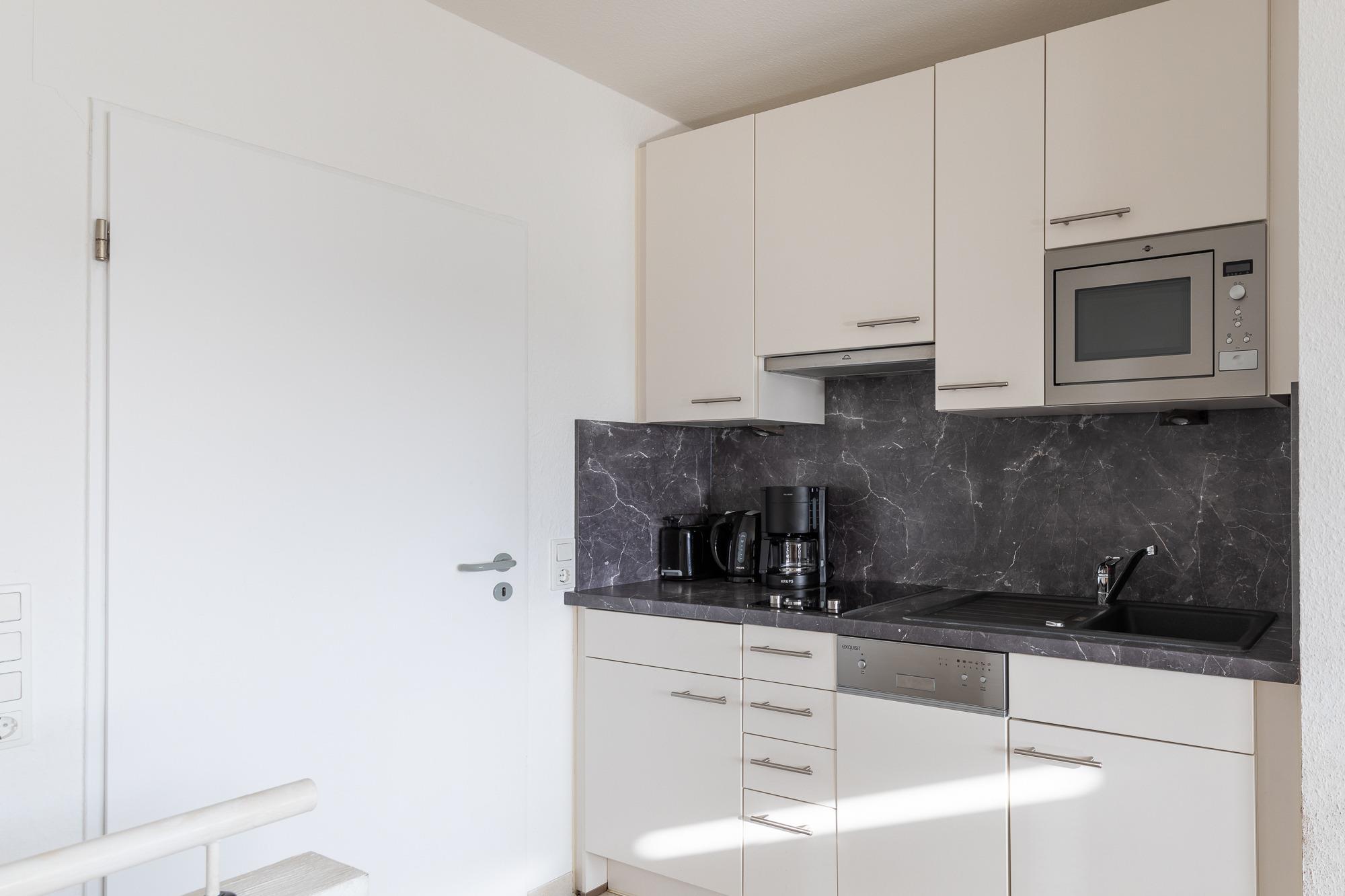 Modern eingerichtete Ferienwohnung über 2 Etagen, mit einer Größe von ca. 54 m² Wohnfläche ist komplett bis zu 4 Personen ausgestattet. Ein großer offener Wohnbereich mit kompletter Einbauküche (Cerankochfeld, Geschirrspüler, Toaster, Wasserkocher, Mikrowelle, Kaffeemaschine, Kühlschrank mit Gefrierfach), Essplatz, Sofa-Ecke und direktem Zugang zum Balkon, 1 Schlafzimmer (innenliegend) mit Etagenbett und ein Schlafzimmer mit einem Doppelbett, die Schlafzimmer befinden sich im Souterrain, an heißen Tagen erwartet Sie hier eine angenehme Kühle und ein gutes Raumklima, 1xDusche mit Waschbecken, 1 Gäste WC mit Waschbecken, 1 Flatscreen TV, Nichtraucherwohnung, keine Haustiere, PKW-Stellplatz direkt am Haus.