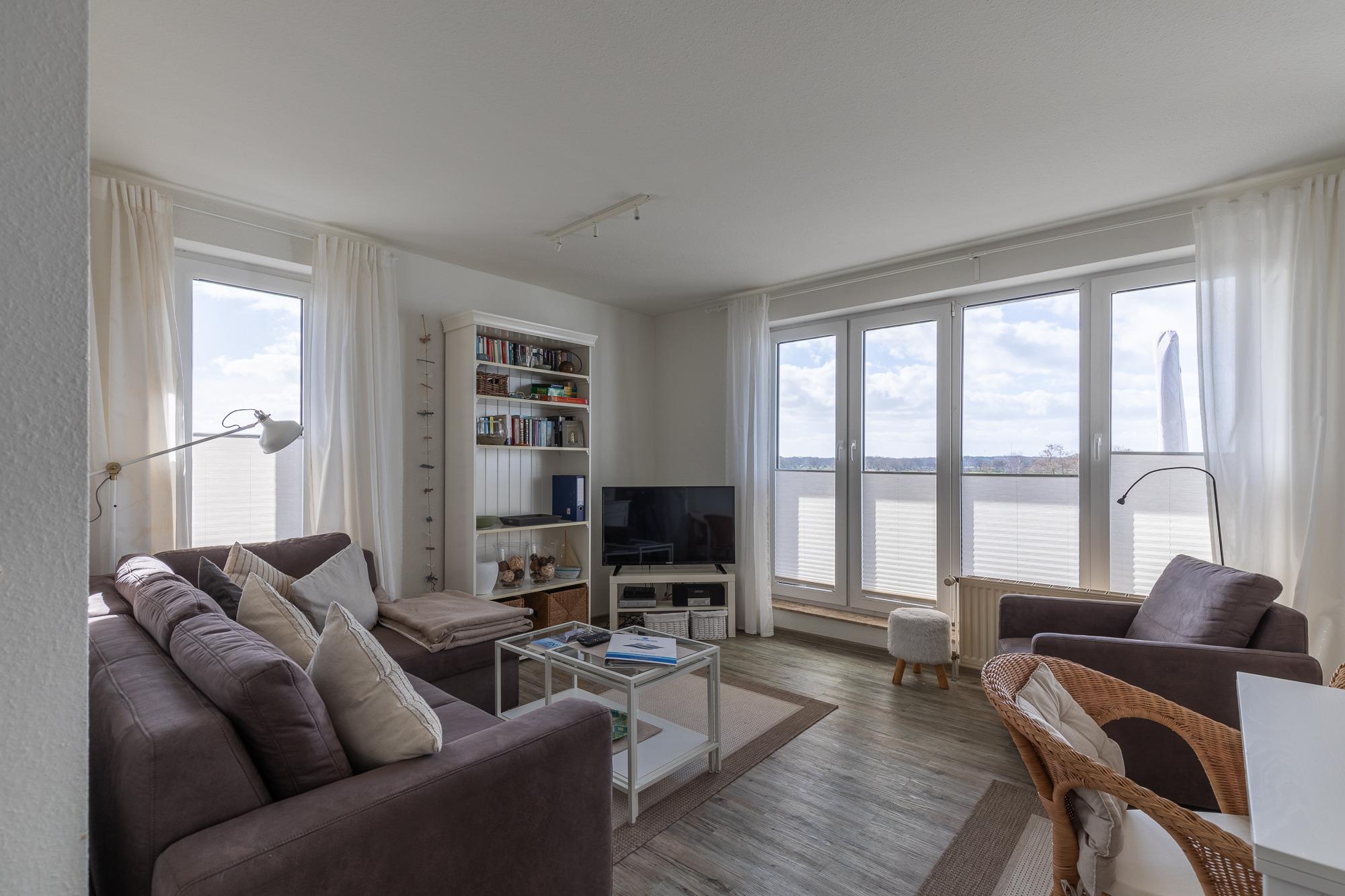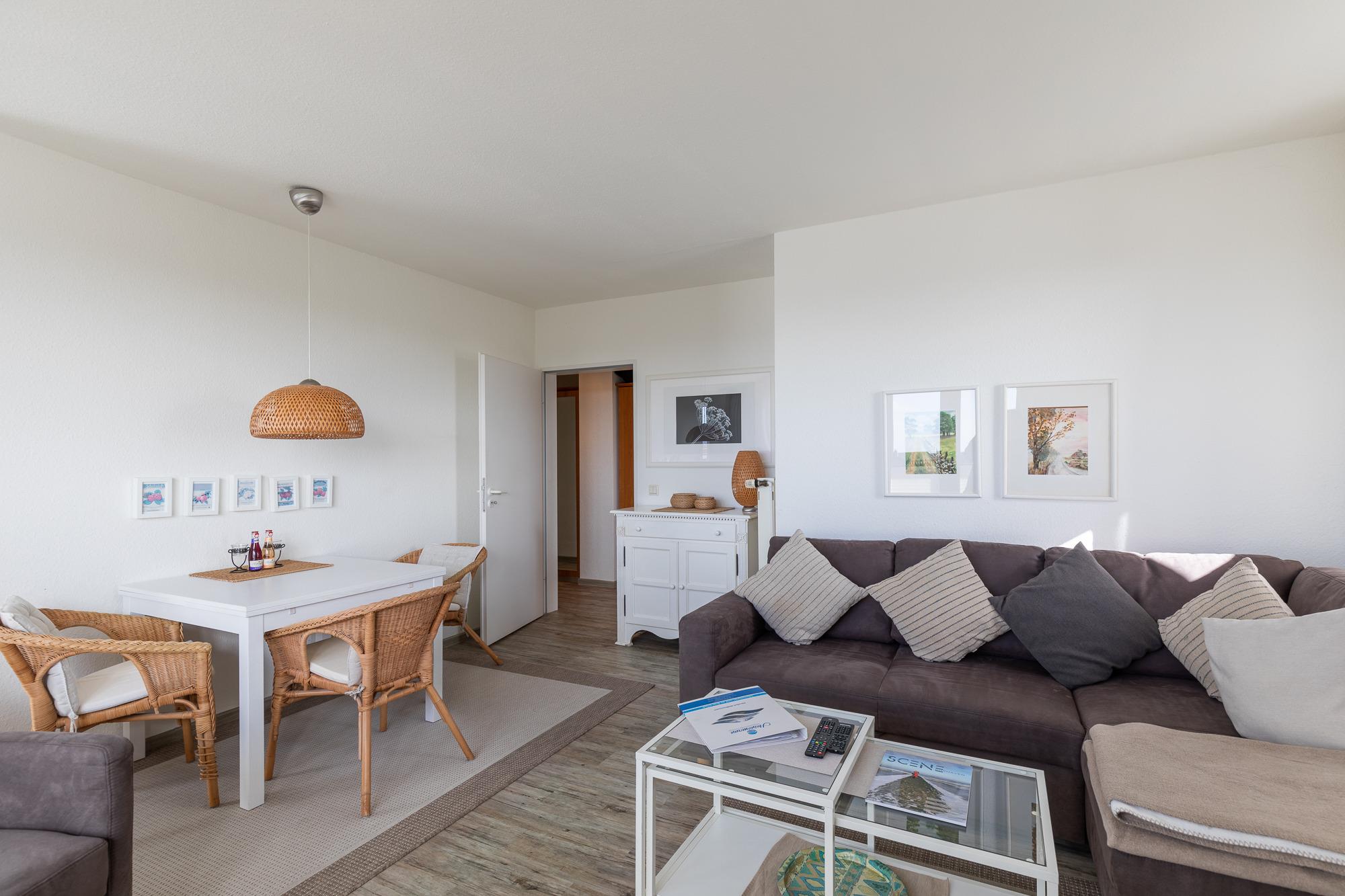 Die 2 Raumwohnung befindet sich im 2. OG und bietet ein Wohnzimmer (das Sofa kann als Schlafsofa genutzt werden), 1 Schlafzimmer, eine Küche und ein Duschbad mit WC. Vom Wohnzimmer und der Küche aus gelangt man auf die große Dachterrasse mit Terrassenmöbel. Hier steht Ihnen ein Strandkorb zur Verfügung, indem Sie die Sonne genießen können.