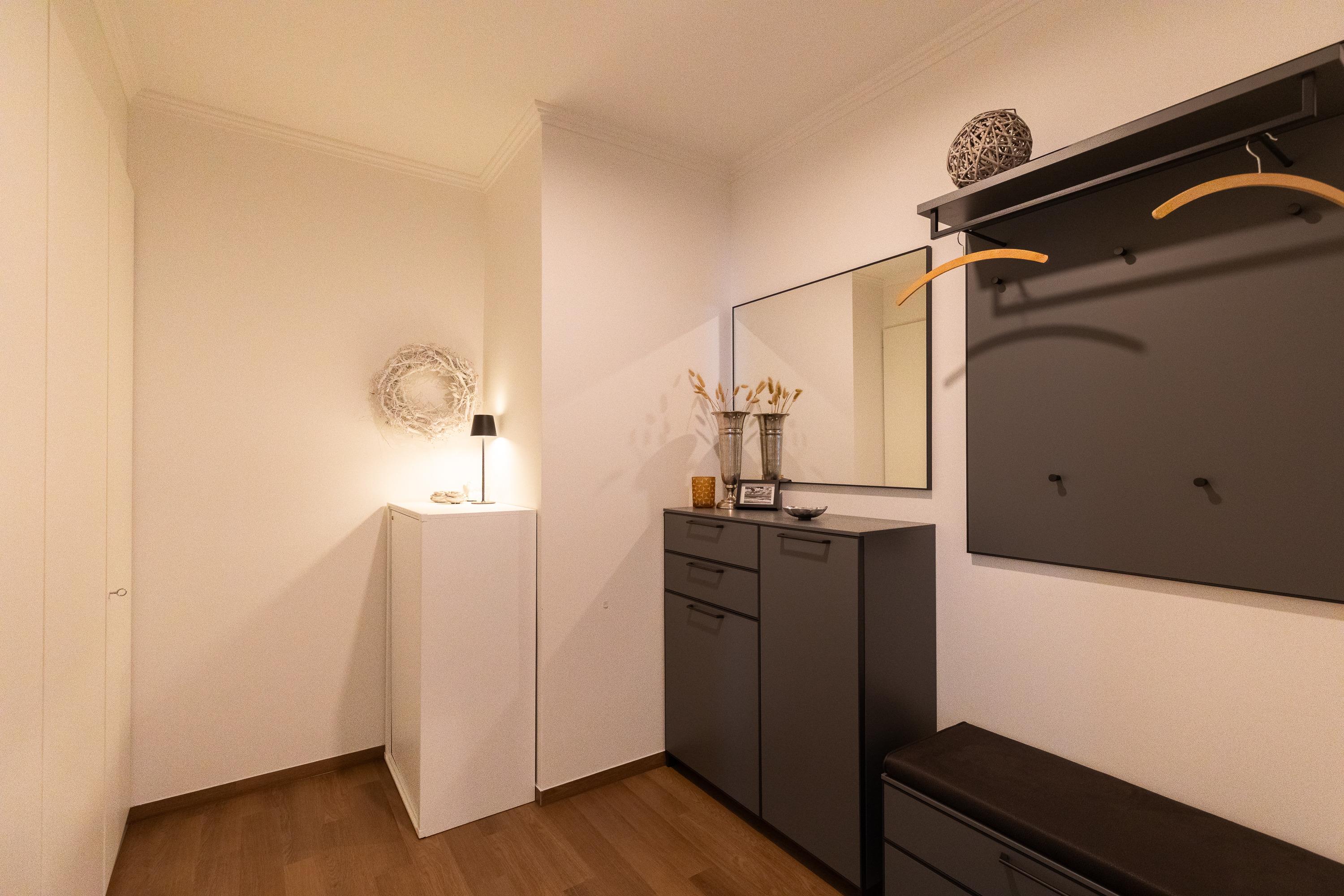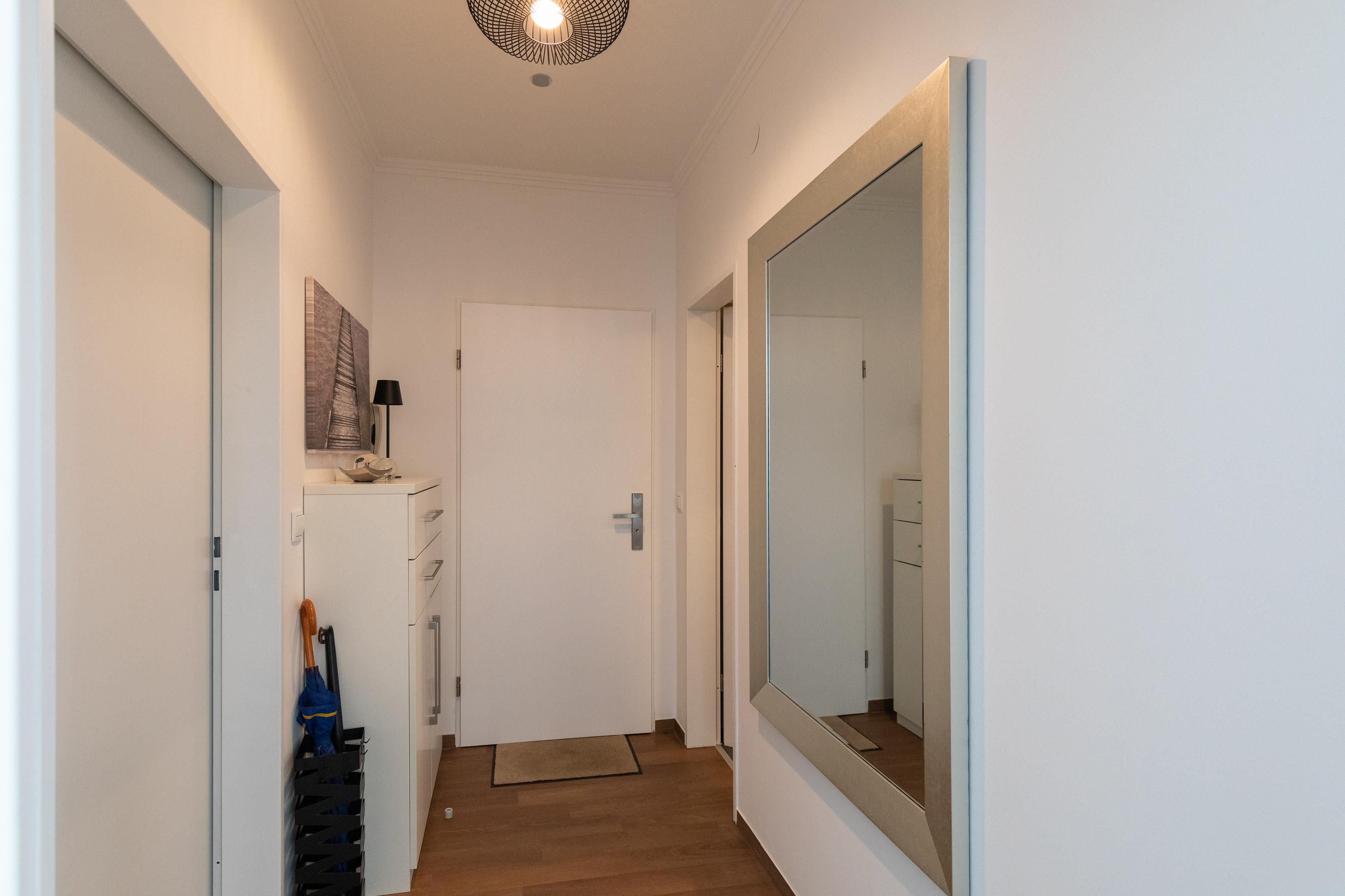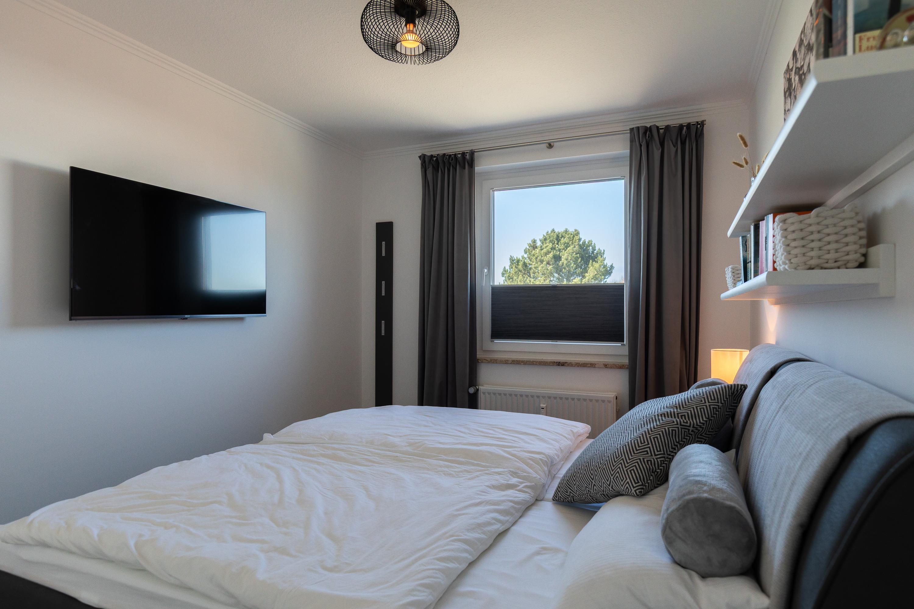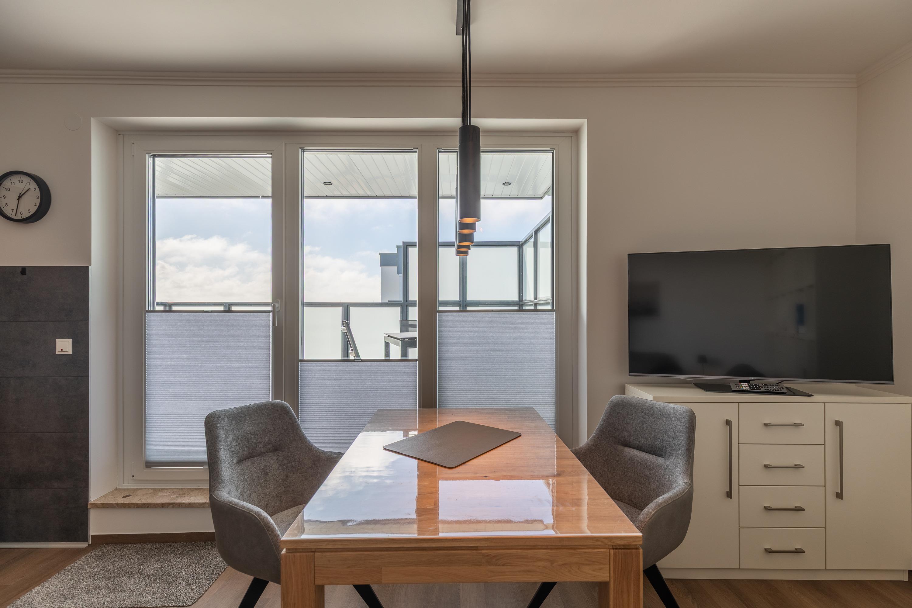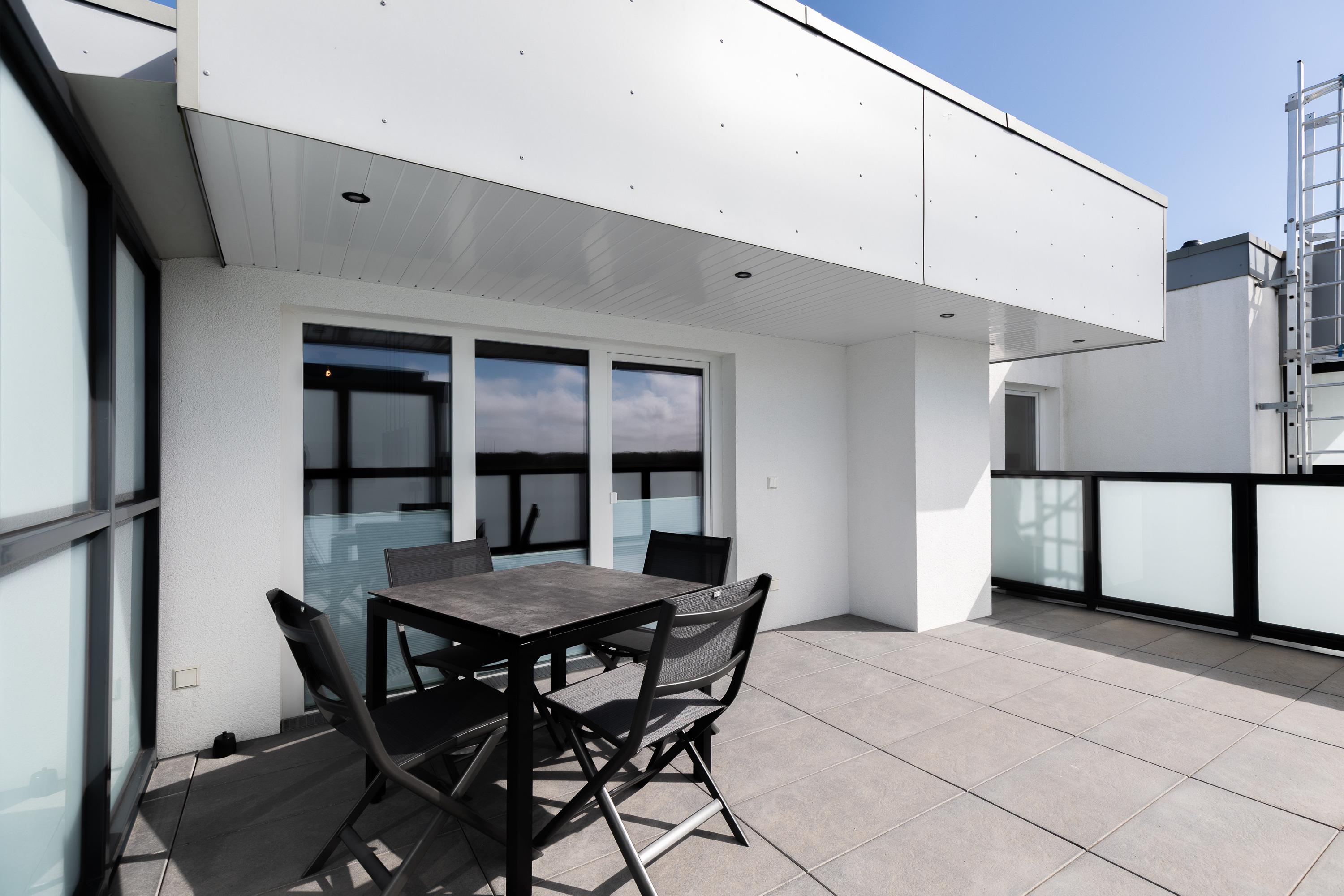 Mit einer Größe von ca. 50 m² Wohnfläche ist die Wohnung komplett bis zu 2 Personen ausgestattet, Wohnzimmer mit kompletter Einbauküche (Backofen (mit Mikrowelle), Cerankochfeld, Toaster, Wasserkocher, Kühlschrank), Essplatz für 2 Personen, Sofa-Ecke und direktem Zugang zur großen Dachterrasse, 1 Schlafzimmer mit Doppelbett (Kleiderschrank, 1 Flatscreen TV), Bad mit Dusche und WC, 1 Flatscreen TV im Wohnzimmer, Nichtraucherwohnung, keine Haustiere, PKW-Stellplatz direkt am Haus. Die kompletten Außen-Türen und die Fenster sind mit Insektenschutz versehen.
