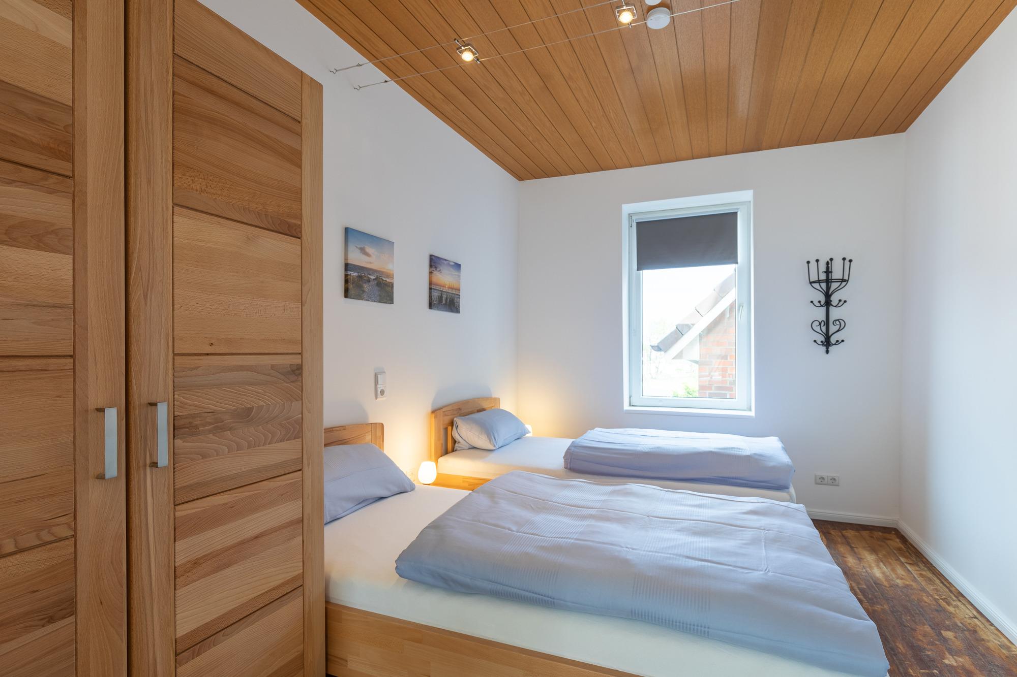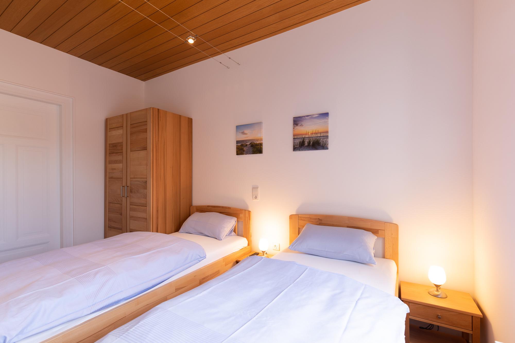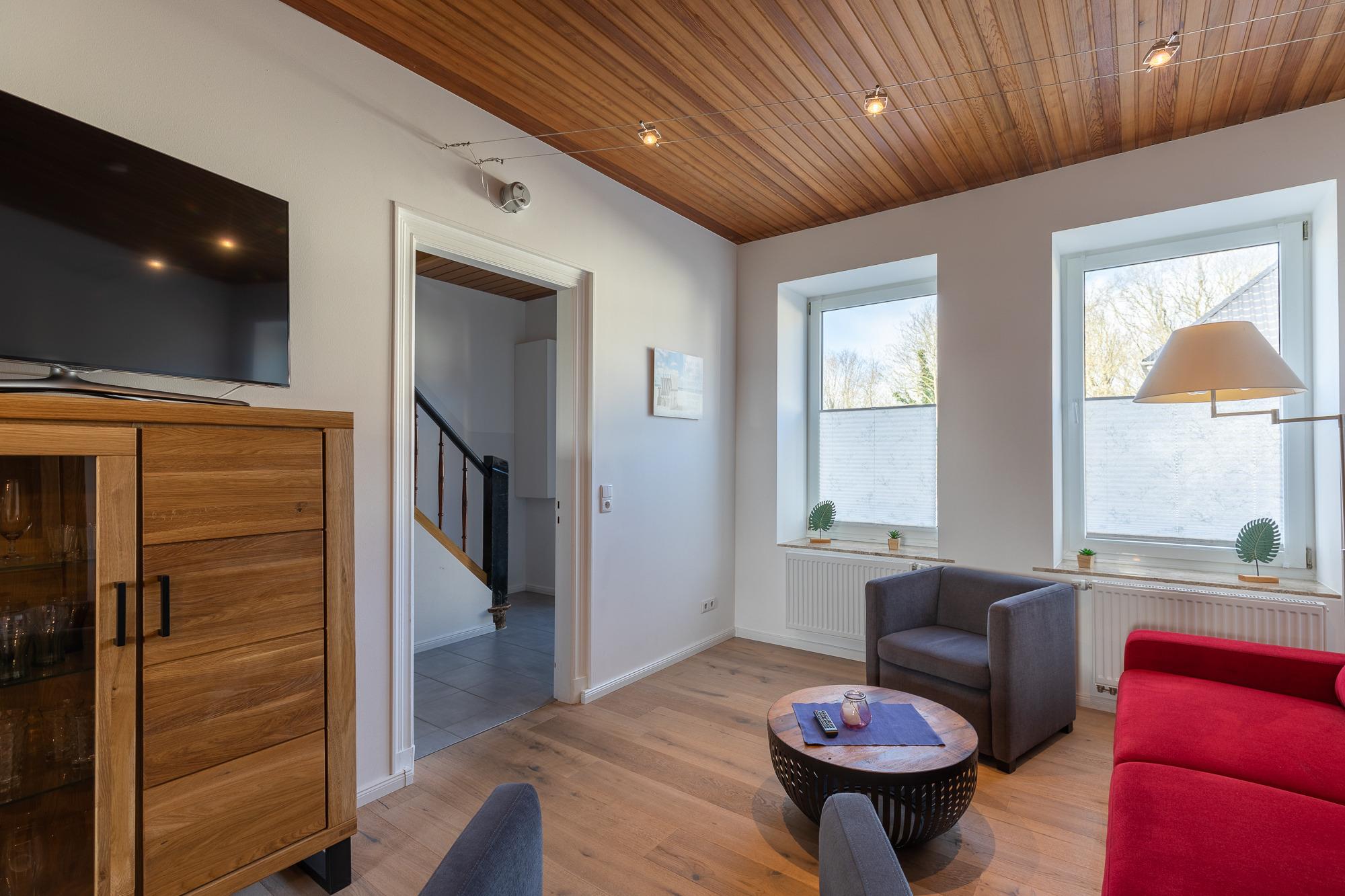 Die Doppelhaushälfte, mit einer Größe von ca. 80 m² Wohnfläche ist komplett bis zu 5 Personen ausgestattet. Wohnzimmer mit gemütlicher Sitzecke, TV, Einbauküche (Cerankochfeld, Backofen, Dunstabzugshaube, Geschirrspüler, Kühlschrank mit Gefrierfach, Kaffeemaschine, Toaster, Wasserkocher, Senseo Maschine), Essplatz, Tageslichtbad mit Dusche, Wanne und WC, Schlafbereich im Obergeschoss, über eine Treppe in der Wohnung zu erreichen, Flur mit Zugang zum Schlafzimmer 1 mit Doppelbett, TV, Kleiderschrank (von hier aus gelangt man in das 2. Schlafzimmer), Schlafzimmer 2 mit 2 Einzelbetten, Kleiderschrank, TV (von hier aus gelangt man auch in das Schlafzimmer 3), Schlafzimmer 3 mit einem 1,40 Bett, Kleiderschrank und TV (vom Schlafzimmer 3 aus gelangt man wieder in den Flur vom Obergeschoss. Nichtraucherhaus, keine Haustiere.