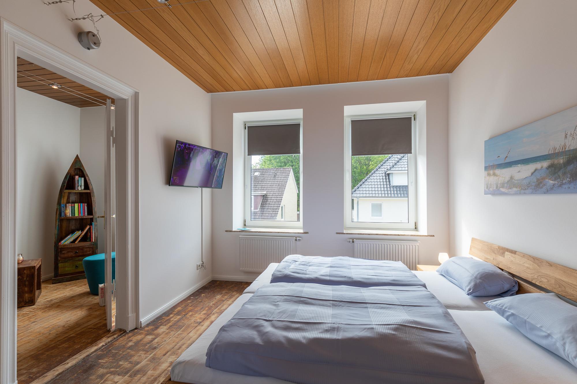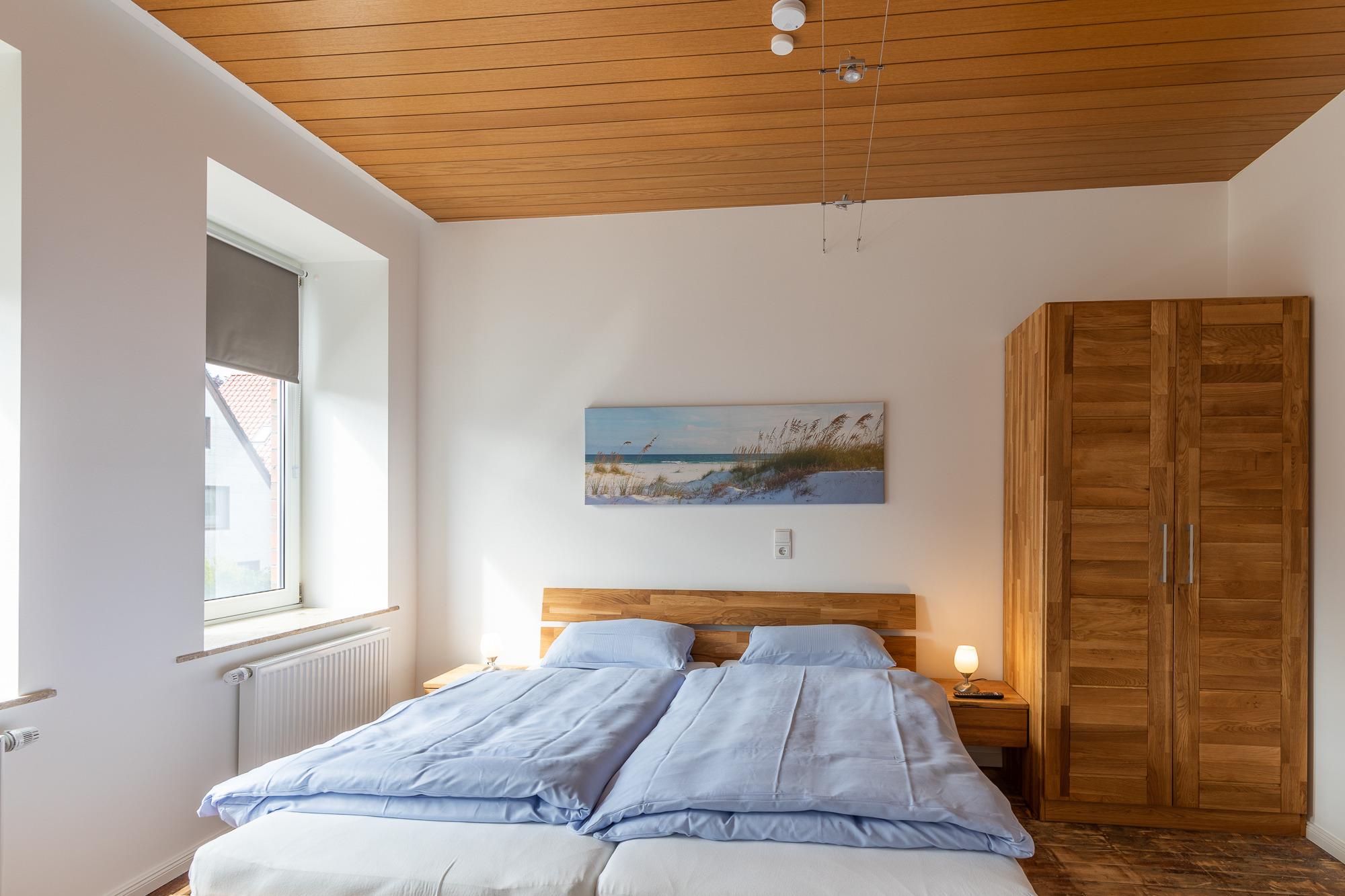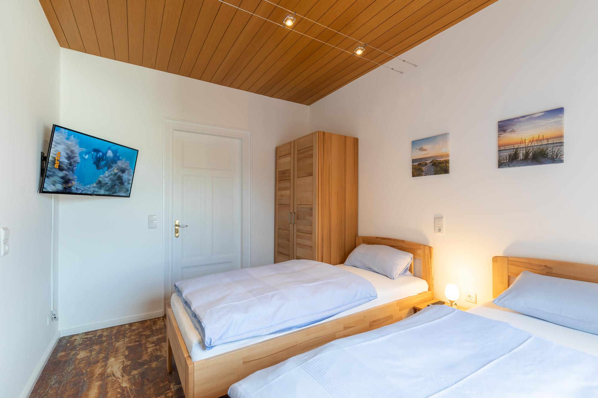 Die Doppelhaushälfte, mit einer Größe von ca. 80 m² Wohnfläche ist komplett bis zu 5 Personen ausgestattet. Wohnzimmer mit gemütlicher Sitzecke, TV, Einbauküche (Cerankochfeld, Backofen, Dunstabzugshaube, Geschirrspüler, Kühlschrank mit Gefrierfach, Kaffeemaschine, Toaster, Wasserkocher, Senseo Maschine), Essplatz, Tageslichtbad mit Dusche, Wanne und WC, Schlafbereich im Obergeschoss, über eine Treppe in der Wohnung zu erreichen, Flur mit Zugang zum Schlafzimmer 1 mit Doppelbett, TV, Kleiderschrank (von hier aus gelangt man in das 2. Schlafzimmer), Schlafzimmer 2 mit 2 Einzelbetten, Kleiderschrank, TV (von hier aus gelangt man auch in das Schlafzimmer 3), Schlafzimmer 3 mit einem 1,40 Bett, Kleiderschrank und TV (vom Schlafzimmer 3 aus gelangt man wieder in den Flur vom Obergeschoss. Nichtraucherhaus, keine Haustiere.