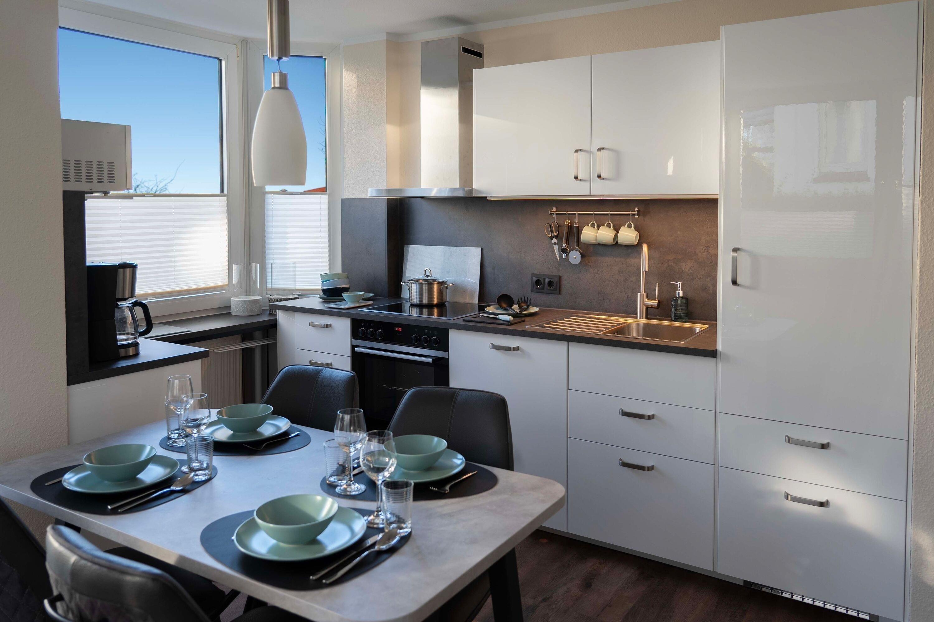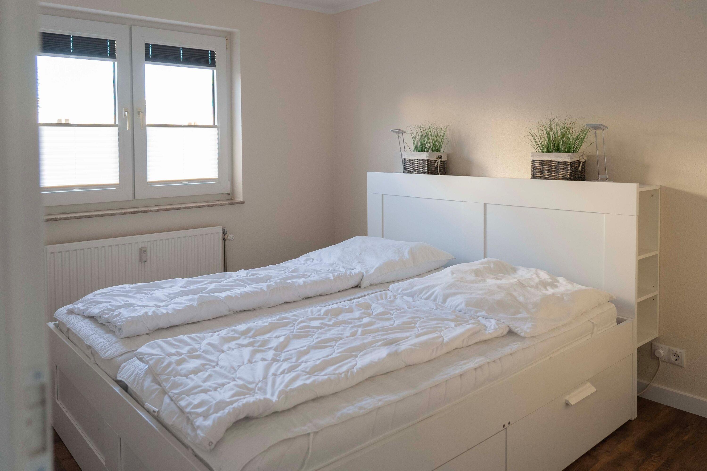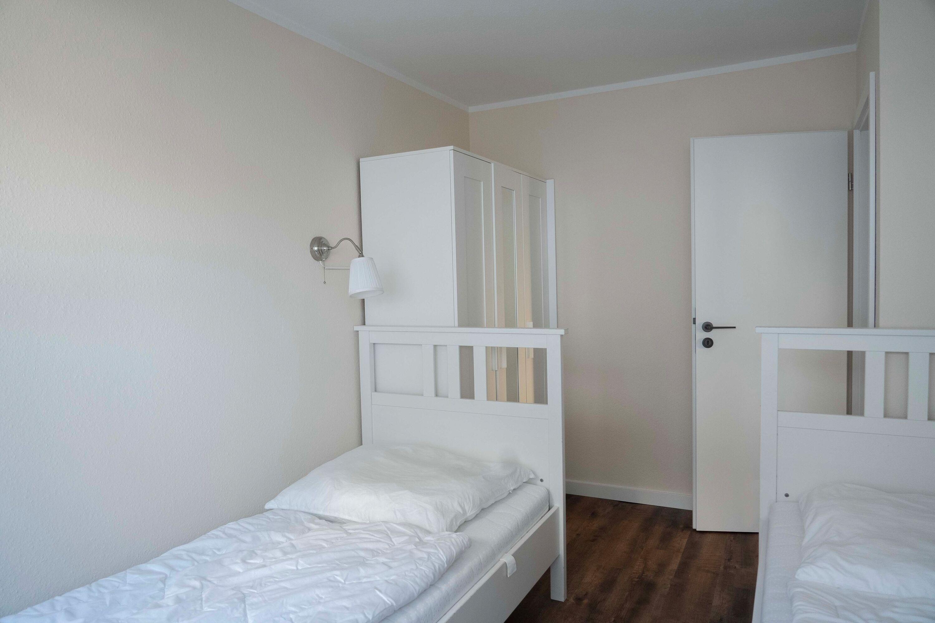 Die 3-Raum-Wohnung im Erdgeschoss mit ca.55 m² Wohnfläche, ist komplett für bis zu 4 Personen ausgestattet. 1 Schlafzimmer mit Doppelbett, ein Kinderzimmer mit 2 Einzelbetten, großzügiges Wohnzimmer mit Einbauküche (Ceranfeld, Backofen, Mikrowelle, Kühlschrank mit Gefrierfach, Toaster, Wasserkocher und Kaffeemaschine, Geschirrspüler), Essplatz, gemütliches Sofa und Flatscreen TV.