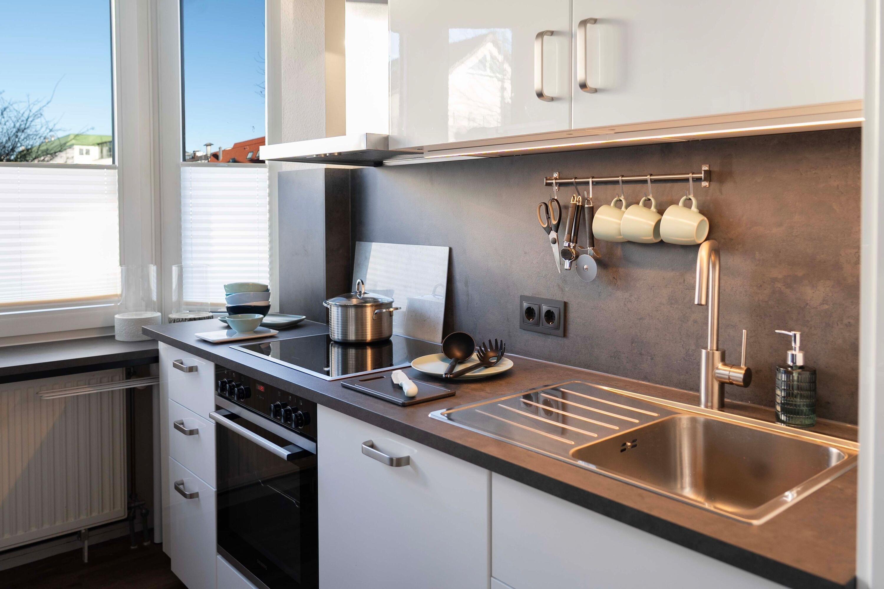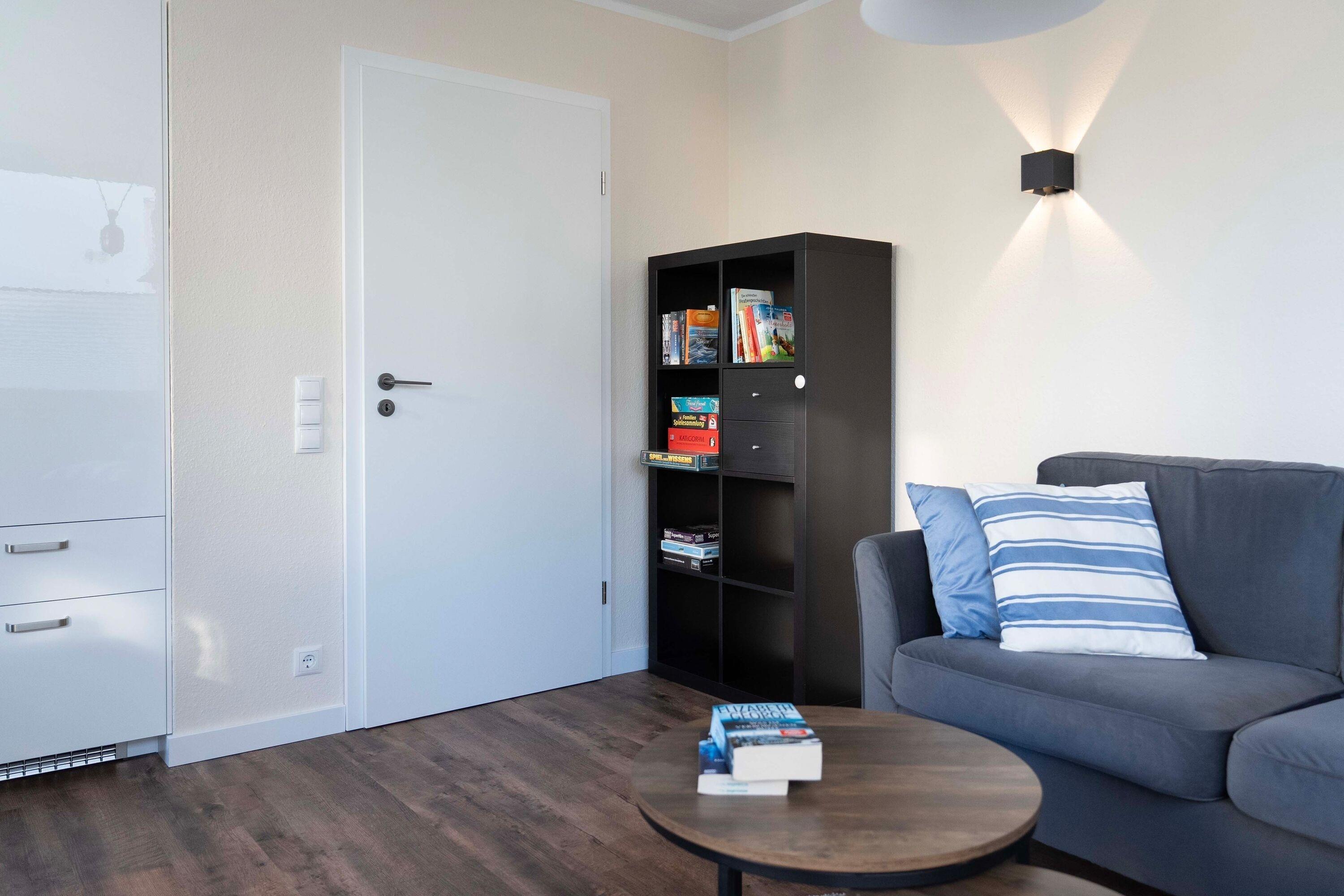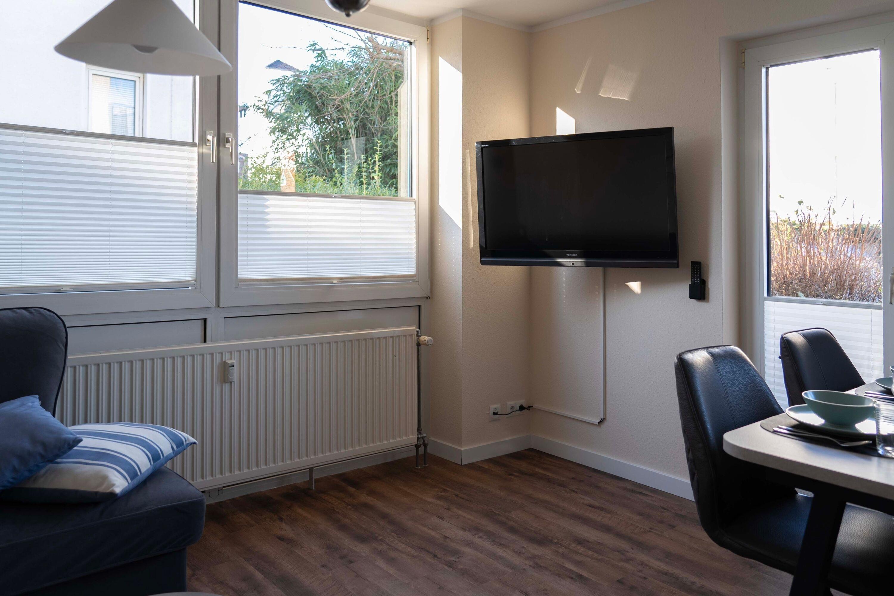 Die 3-Raum-Wohnung im Erdgeschoss mit ca.55 m² Wohnfläche, ist komplett für bis zu 4 Personen ausgestattet. 1 Schlafzimmer mit Doppelbett, ein Kinderzimmer mit 2 Einzelbetten, großzügiges Wohnzimmer mit Einbauküche (Ceranfeld, Backofen, Mikrowelle, Kühlschrank mit Gefrierfach, Toaster, Wasserkocher und Kaffeemaschine, Geschirrspüler), Essplatz, gemütliches Sofa und Flatscreen TV.