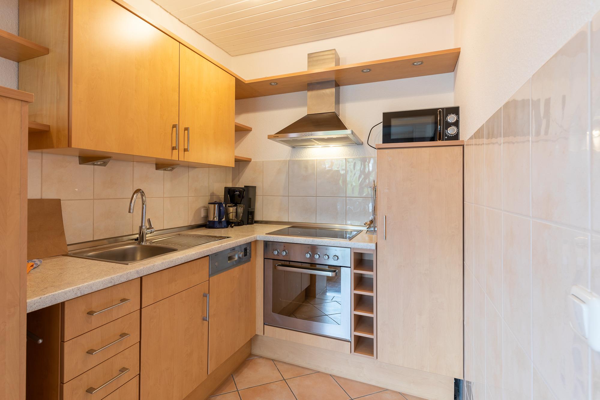 1 Schlafzimmer mit einem Doppelbett (mit Kleiderschrank), 1 Schlafzimmer mit 2 Einzelbetten (mit Kleiderschrank, Tisch und Stuhl), Wohnzimmer mit Zugang zur Terrasse (mit Gartenmöbel), 1 Flatscreen TV (Wohnzimmer), Esstisch, Sofa, separate Küche (Backofen, Cerankochfeld, Geschirrspüler, Kühlschrank mit Gefrierfach, Kaffeemaschine, Wasserkocher, Toaster, Mikrowelle), 1xDusche mit WC, Waschbecken, Spiegel, Föhn, Waschmaschine (kostenpflichtig, mit Münzautomat) Nichtraucherwohnung, ein Haustier pro Wohnung ist willkommen (gegen Aufpreis).