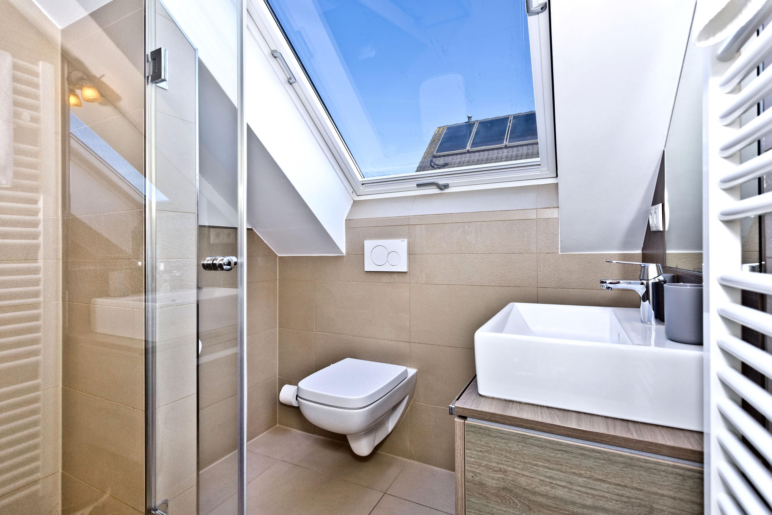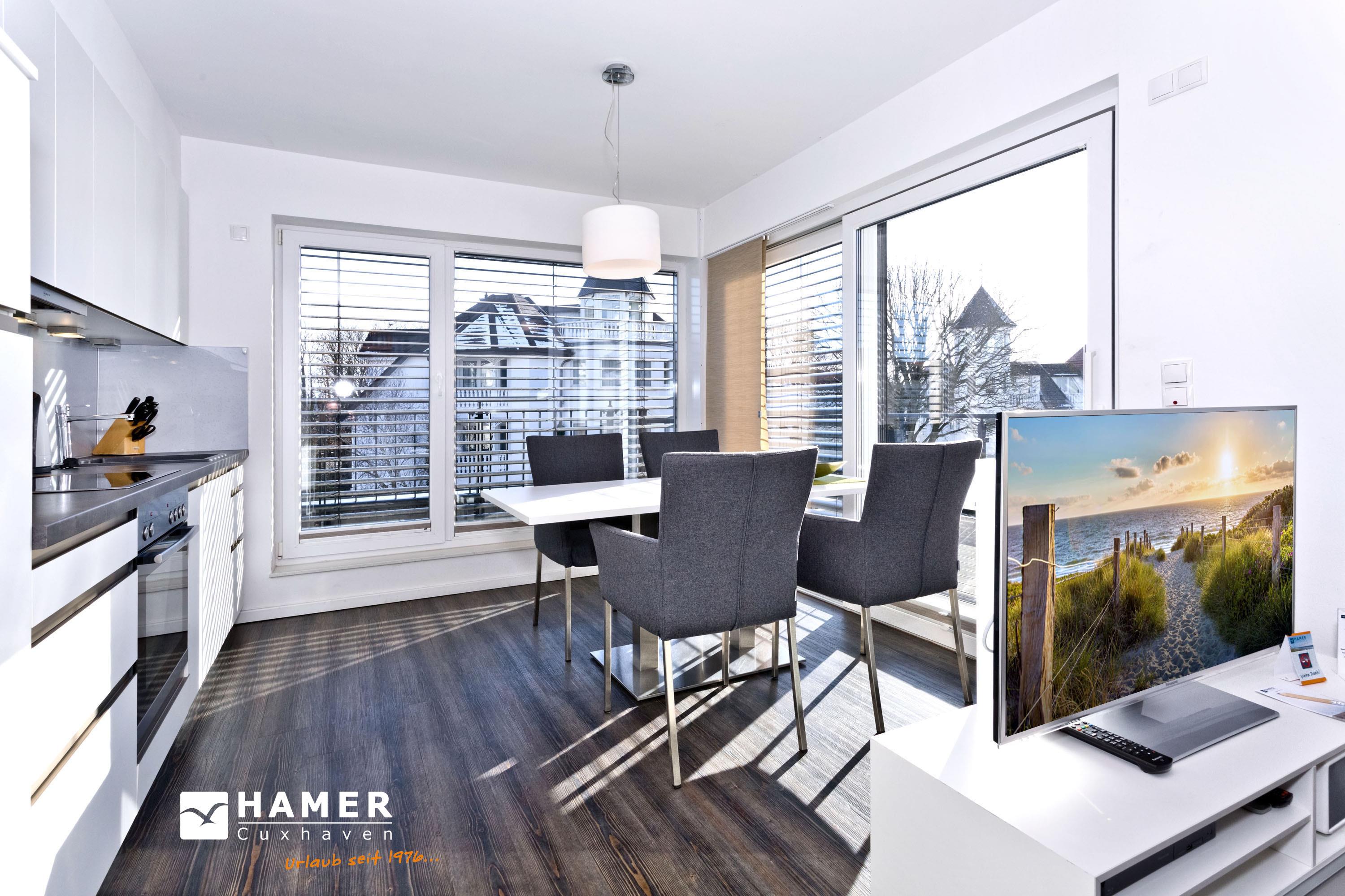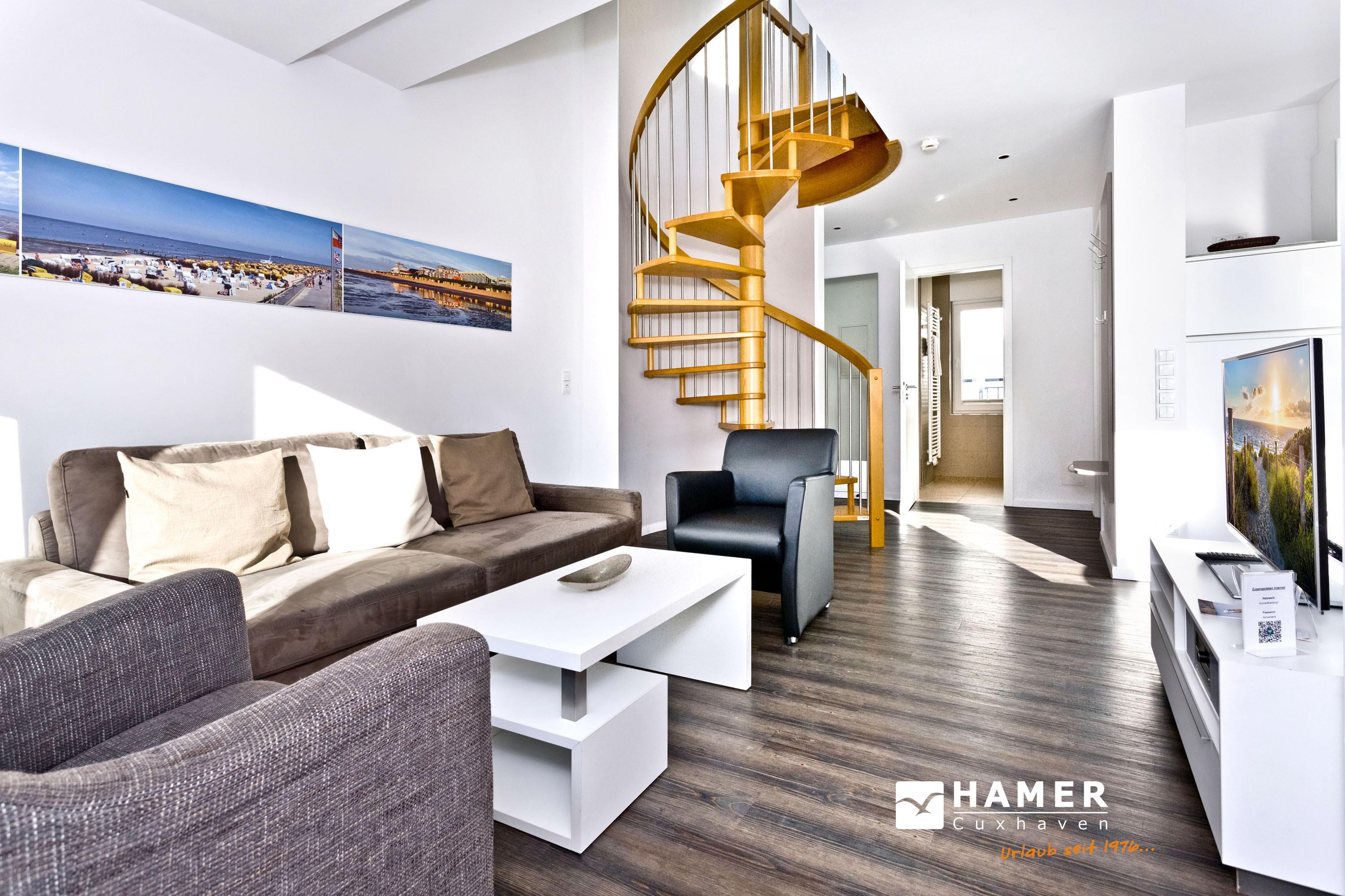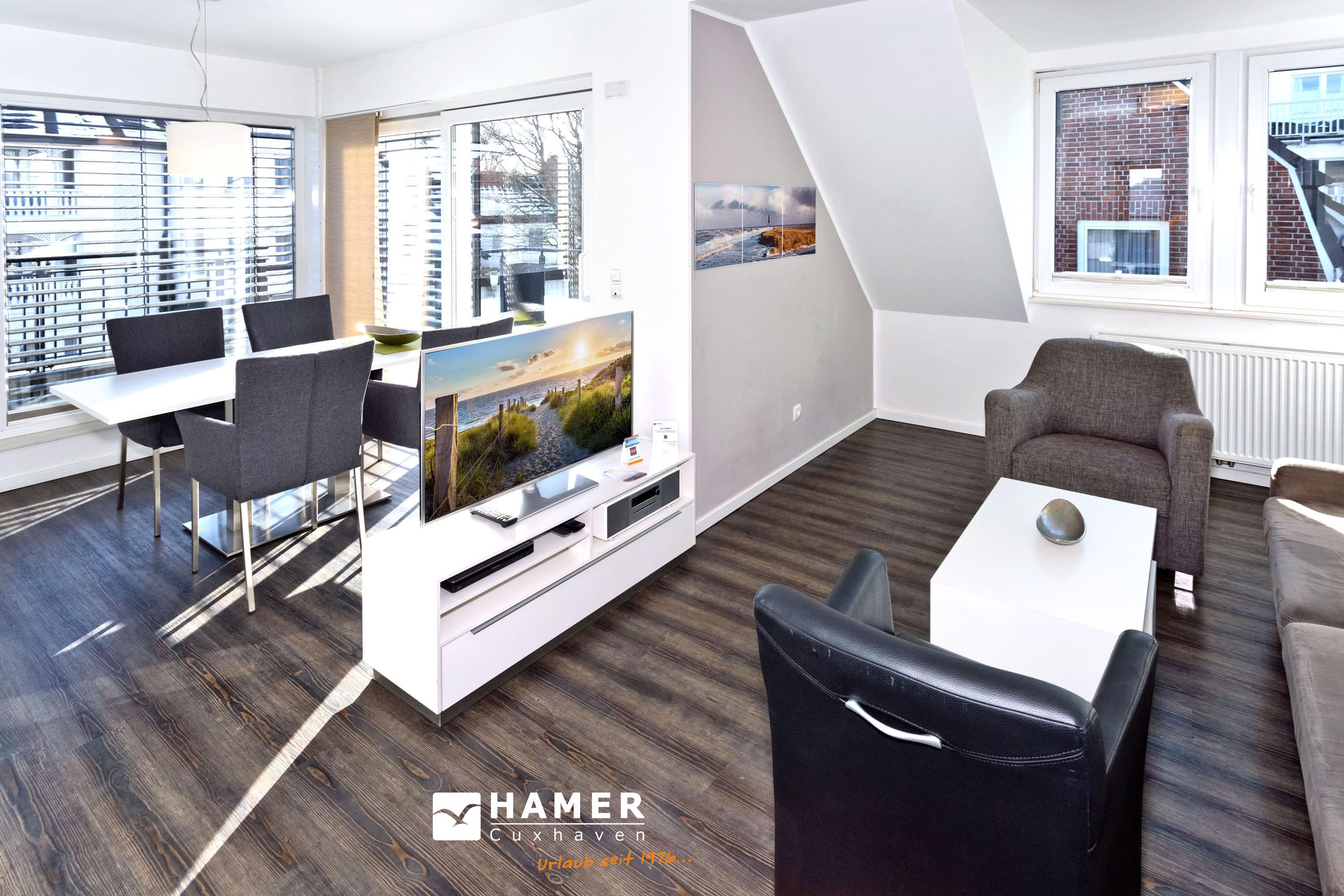 Sehr schöne, moderne 3-Raum-Wohnung bis 4 Pers über zwei Etagen (67m²), 2.Etage, 2 Schlafzimmer mit Doppelbetten, Wohnzimmer mit großer Küchenzeile (Back., Mikrow., Geschirrspüler), 2x Du/WC, 2xSAT-TV, Blue-Ray, CD-Radio, W-LAN kostenlos, großer Westbalkon mit Balkonmöbeln und Sonnenschirm (saisonabhängig), reservierter Pkw-Stellplatz vor dem Haus, keine Haustiere erlaubt, Nichtraucher.