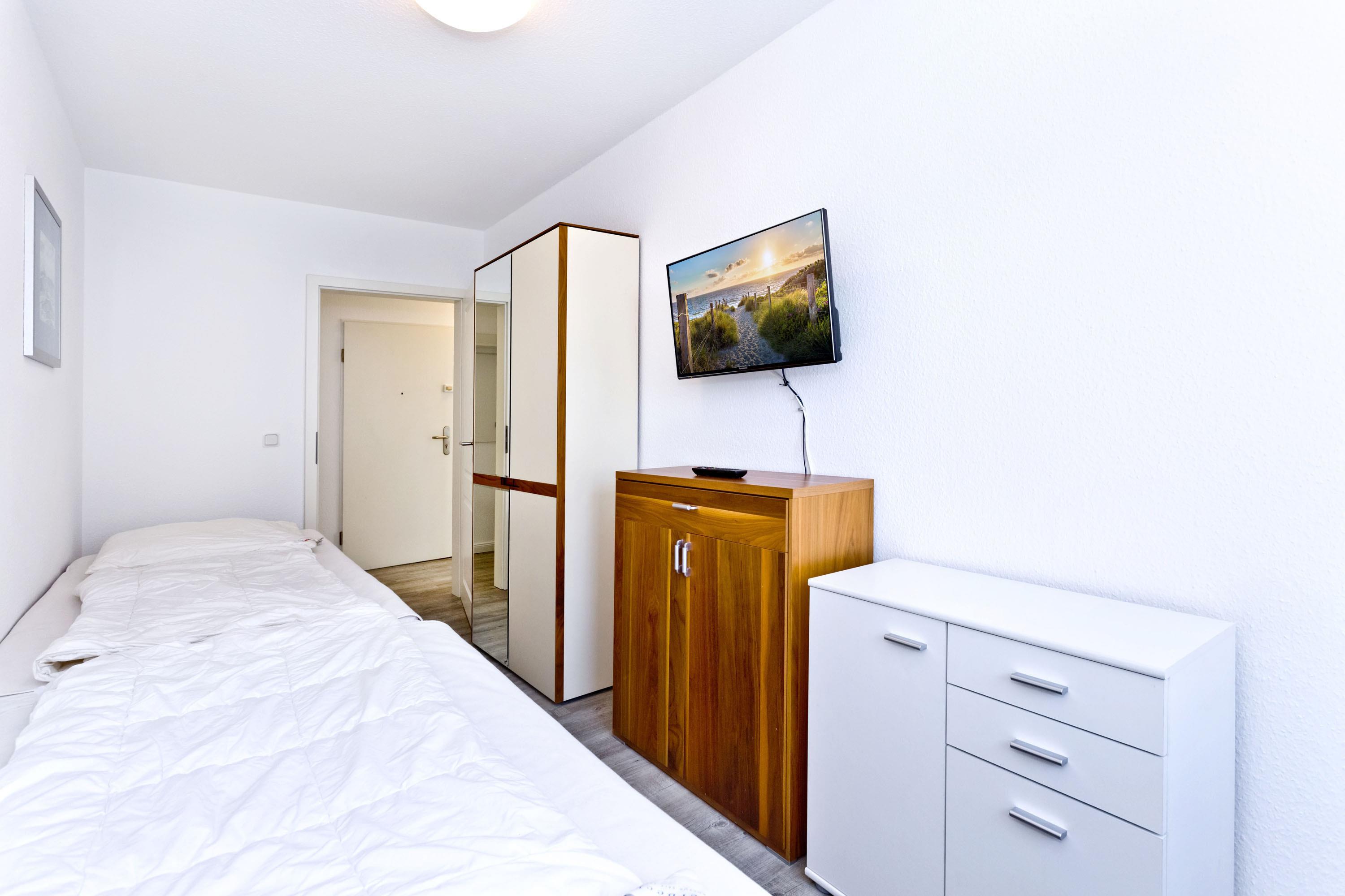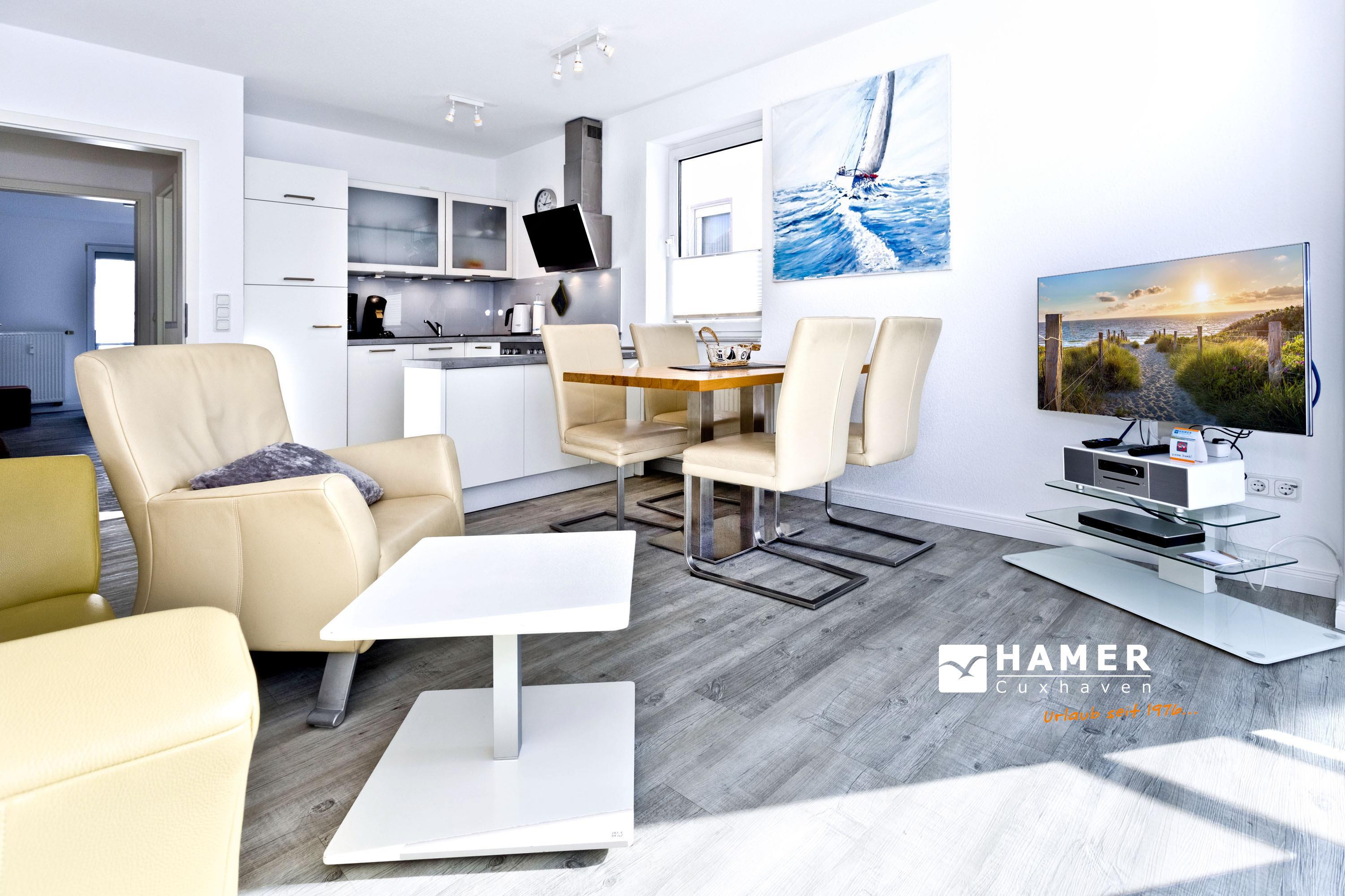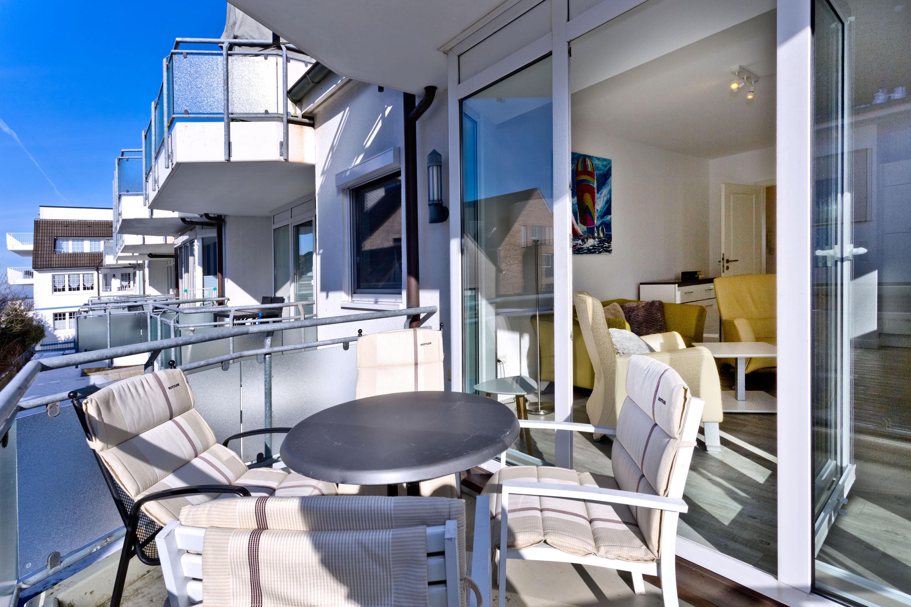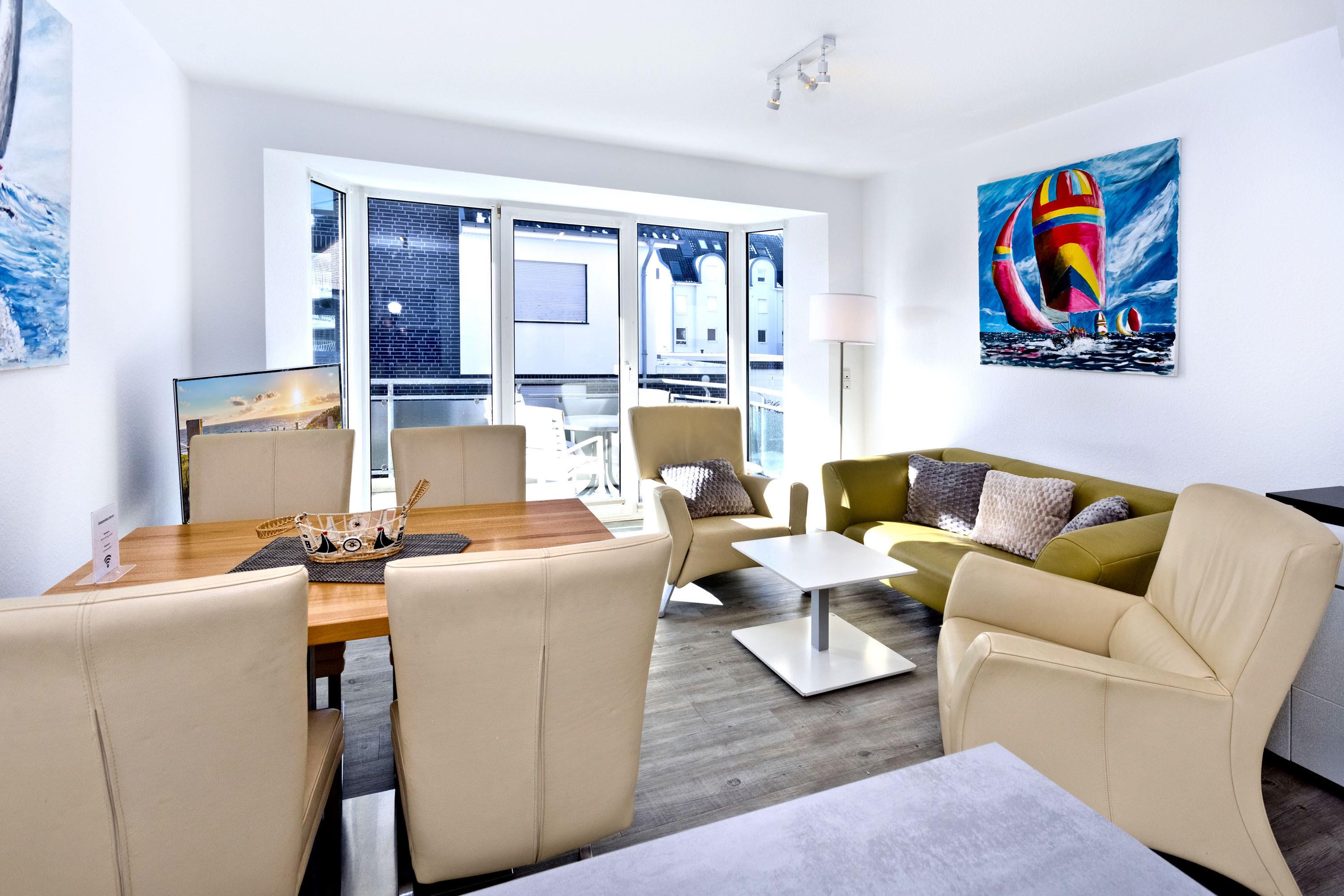 Moderne, helle 3-Raum-Wohnung, 1. OG, größtenteils neu möbliert, ca.58m², 1 Schlafzimmer mit Doppelbett, 1 Schlafzimmer mit zwei Boxspringbetten, beide SZ mit elektrischen Außenrollläden, Wohnzimmer mit kompletter Küchenzeile (Geschirrspüler, Mikrow., Back., Senseo-Kaffeem.), 2xKabel-TV, BluRay-DVD, Sonoro-Stereo-Anlage, Dusche/WC mit Fenster, Föhn, 2 Balkone (1x mit Teilseesicht), kostenloses W-LAN Internet, reservierter Stellplatz in der Tiefgarage #16, Nichtraucherwohnung, Haustiere nicht gestattet.