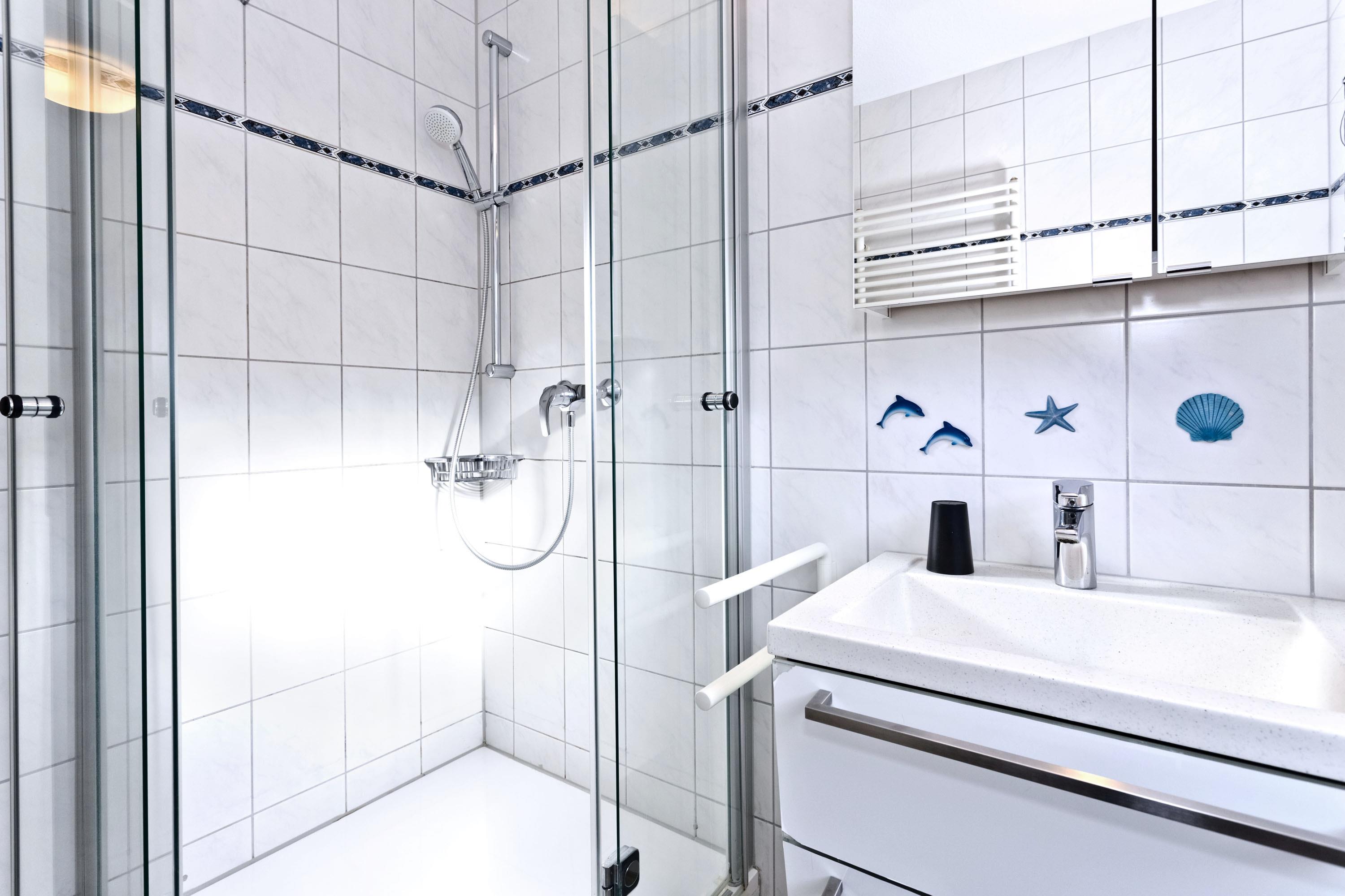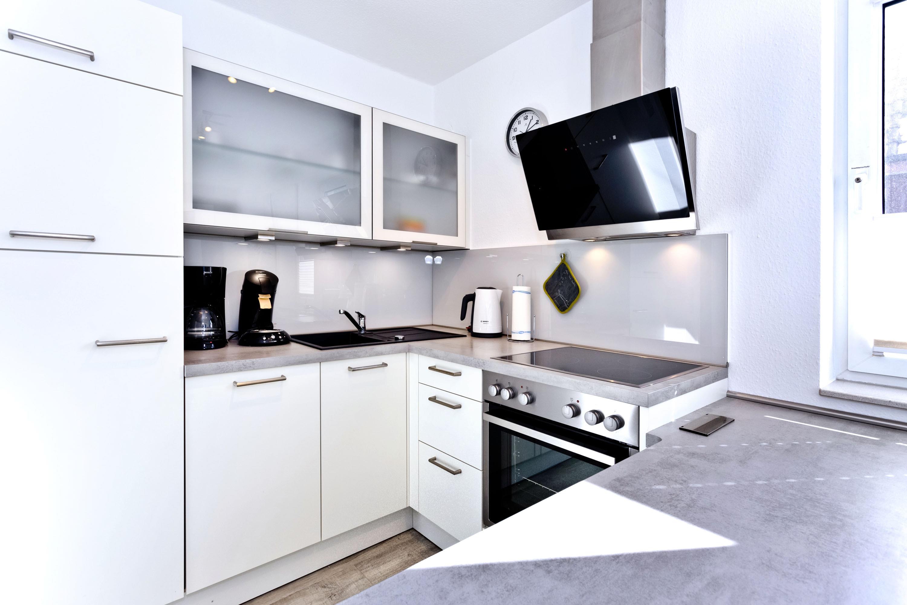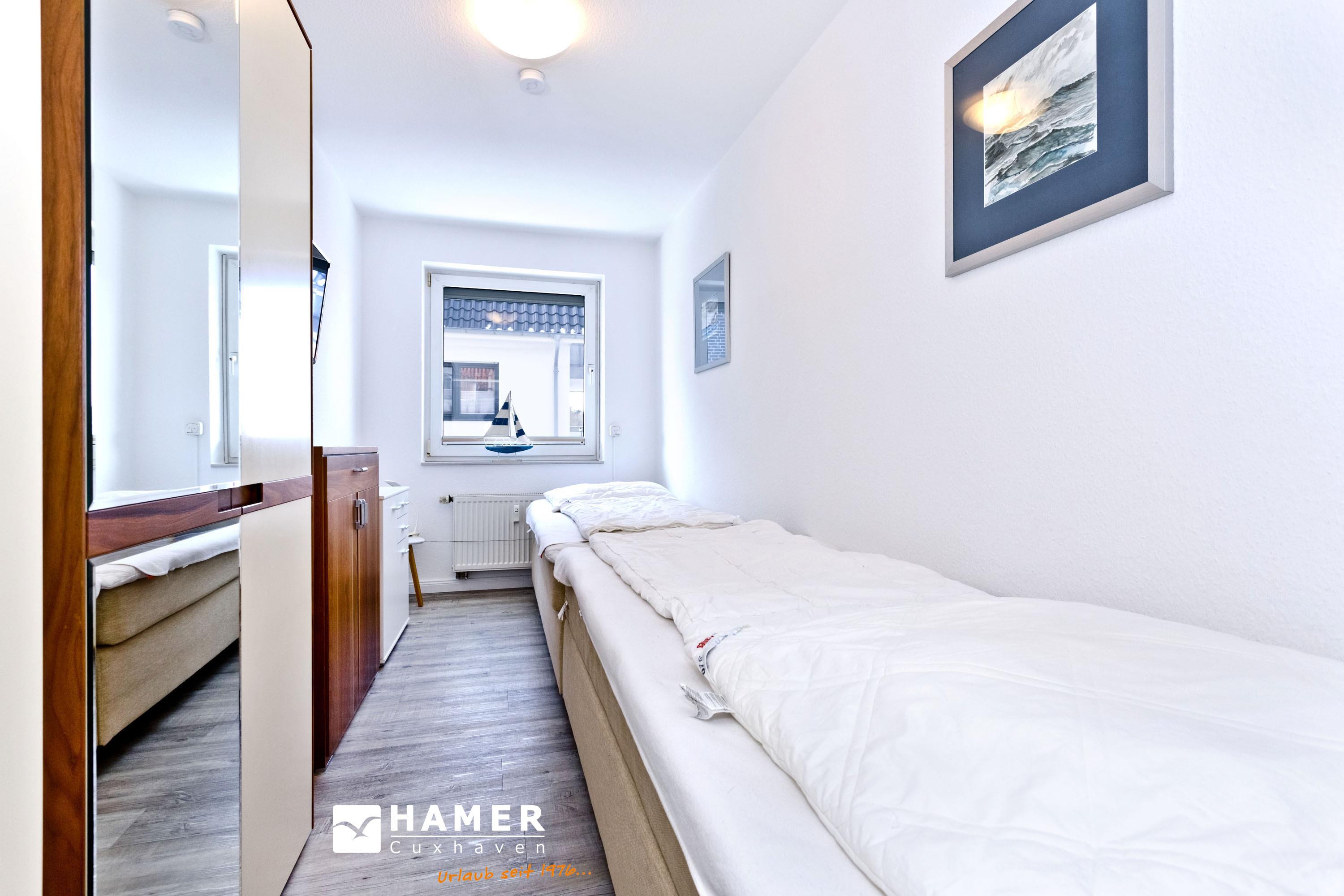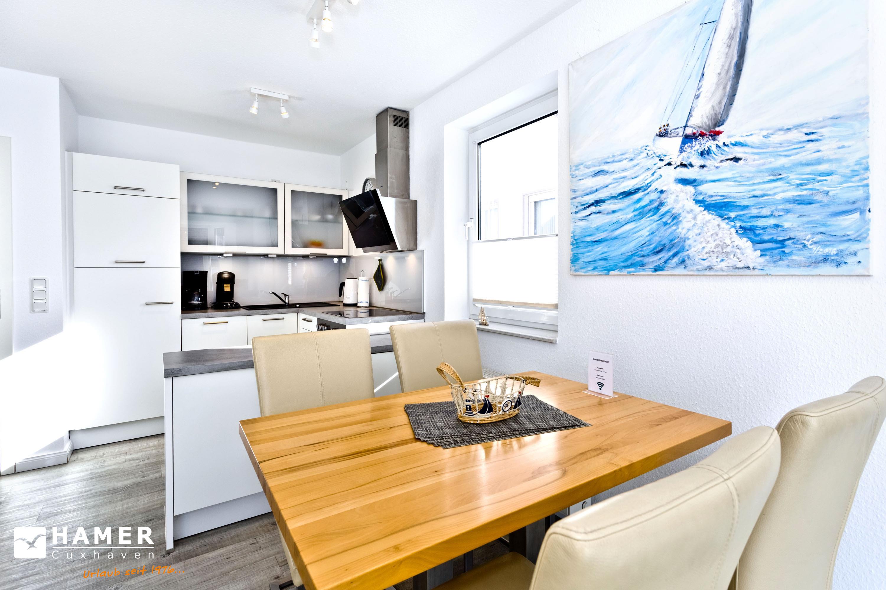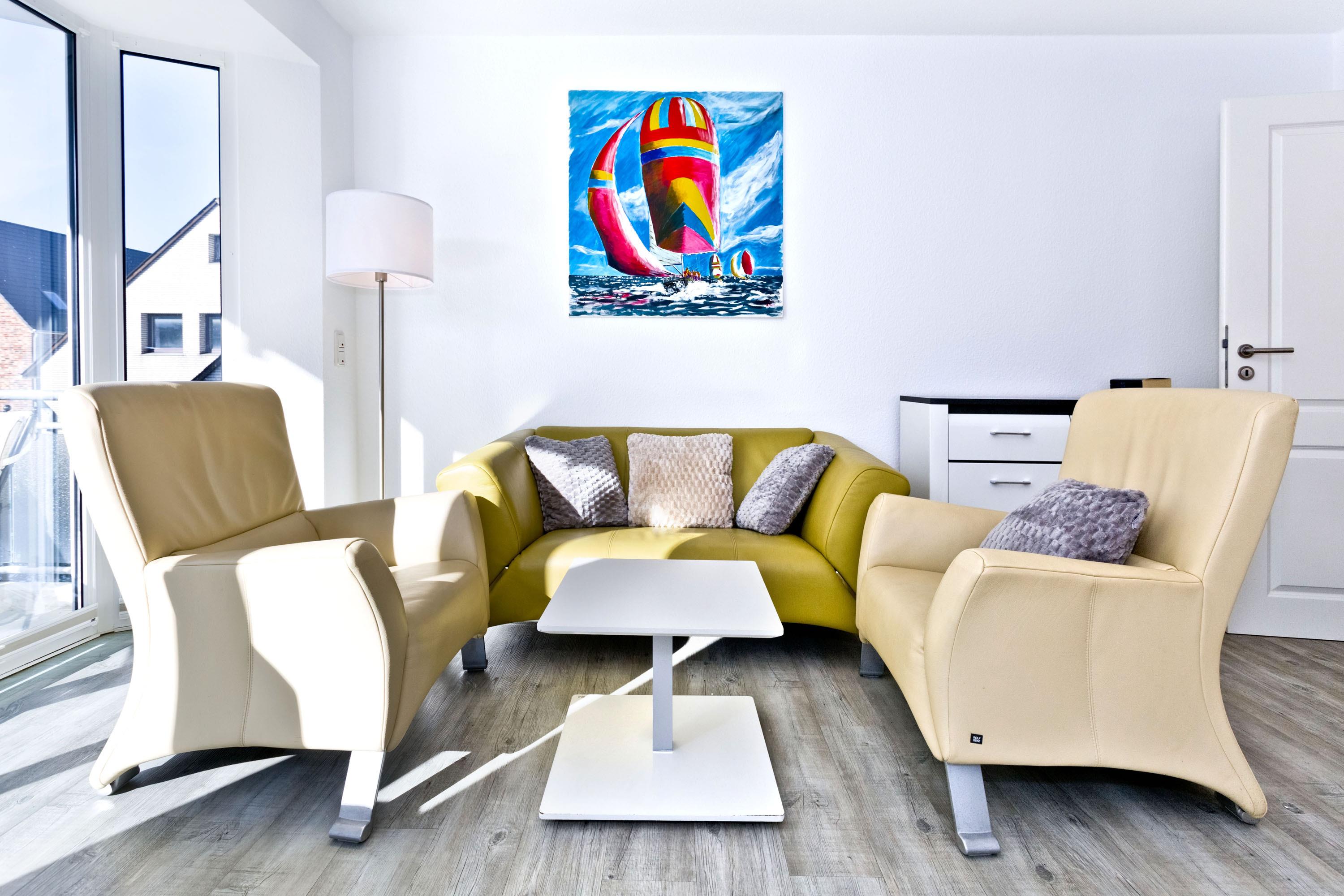 Moderne, helle 3-Raum-Wohnung, 1. OG, größtenteils neu möbliert, ca.58m², 1 Schlafzimmer mit Doppelbett, 1 Schlafzimmer mit zwei Boxspringbetten, beide SZ mit elektrischen Außenrollläden, Wohnzimmer mit kompletter Küchenzeile (Geschirrspüler, Mikrow., Back., Senseo-Kaffeem.), 2xKabel-TV, BluRay-DVD, Sonoro-Stereo-Anlage, Dusche/WC mit Fenster, Föhn, 2 Balkone (1x mit Teilseesicht), kostenloses W-LAN Internet, reservierter Stellplatz in der Tiefgarage #16, Nichtraucherwohnung, Haustiere nicht gestattet.