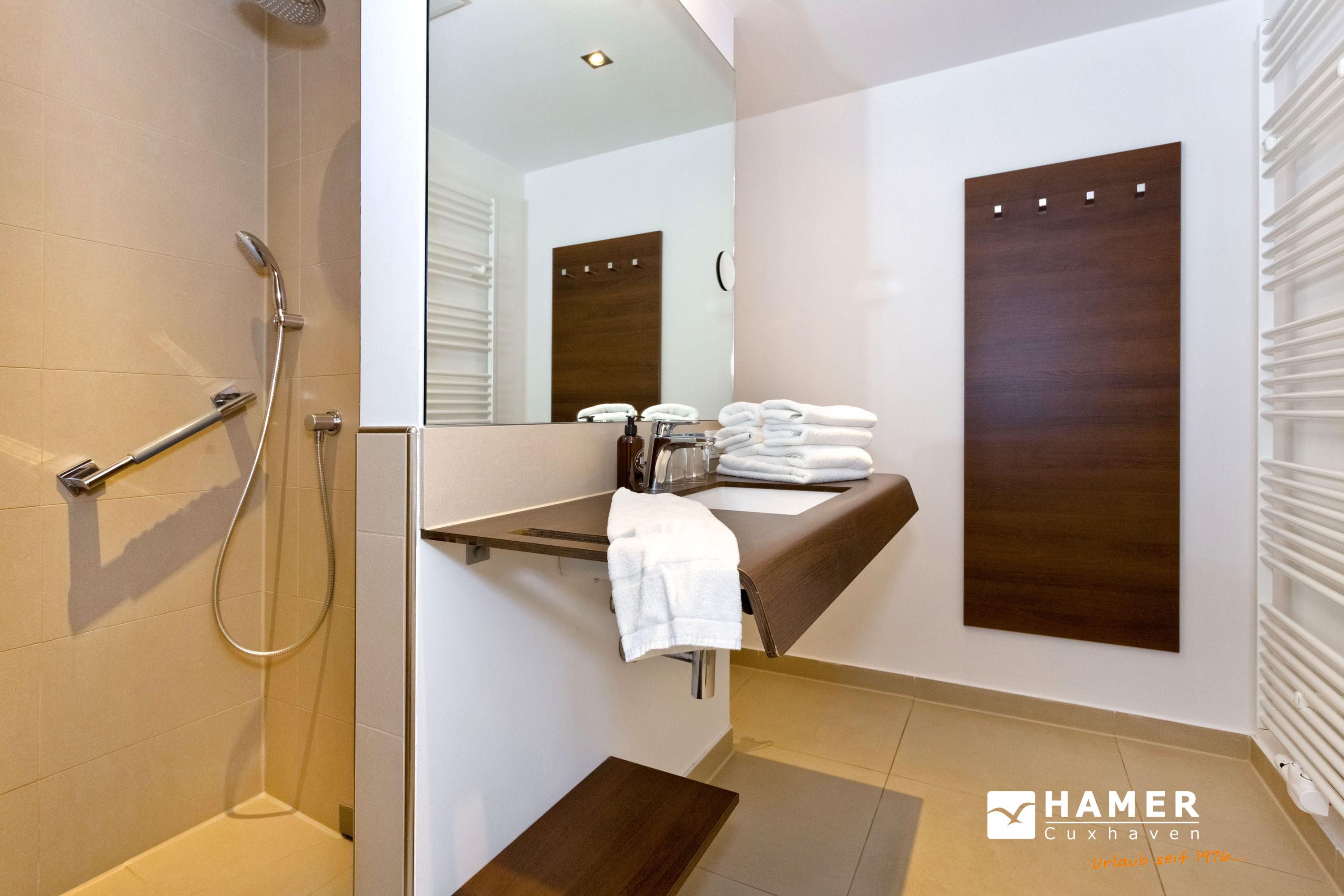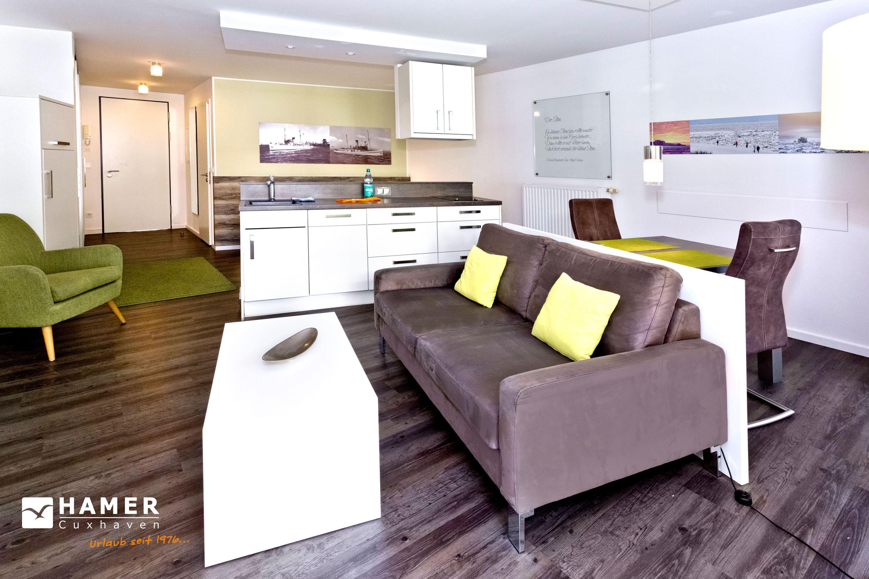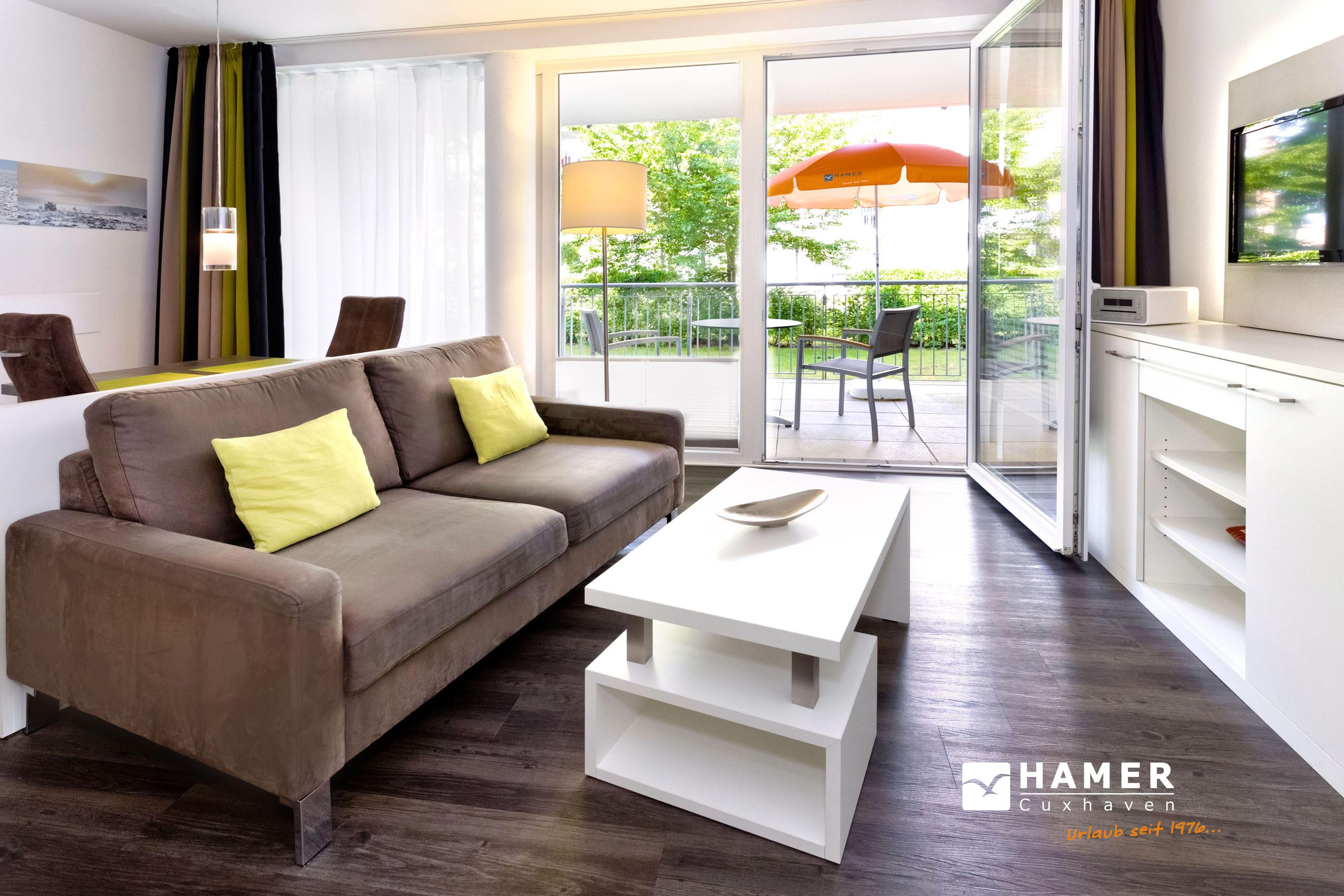 Modernes, ebenerdiges Appartement für 2 Pers. mit Vollausstattung. Große Terrasse zur Westseite mit Balkonmöbeln und Sonnenschirm (saisonabhängig), vollständige Küchenzeile mit Mikrow., Geschirrspüler etc., SAT-TV, CD-Kompaktanlage, USB-Steckdosen, kostenloses W-Lan, allergikerfreundlich, hochwertige Boxspringbetten, ebenerdige Dusche/WC, Föhn, Pkw-Stellplatz auf dem Aussengelände, keine Haustiere und natürlich Nichtraucher. Bettwäsche u. Handtücher inkl., Lage:EG