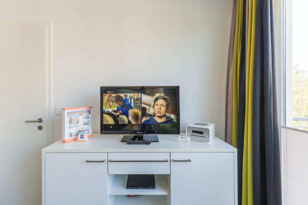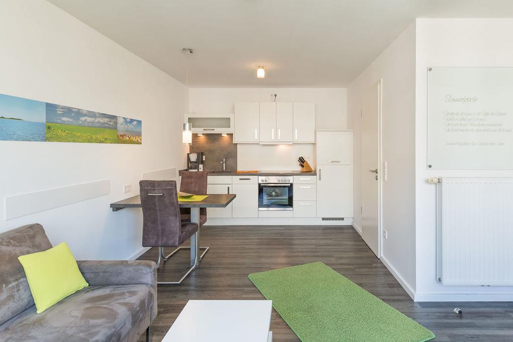 Sehr schöne 2-Raum-Ferienwohnung mit tollem West-Balkon mit Balkonmöbeln und Sonnenschirm (saisonabhängig). Eine vollständige Küchenzeile mit Mikro, Back., Geschirrsp. etc. lädt zum Wohlfühlen ein. 2xSAT-TV, CD-Kompaktanlage, USB-Steckdosen, kostenloses W-Lan, separates Schlafzimmer mit hochwertigen Boxspringbetten, allergikerfreundlich, ebenerdige Dusche/WC, Föhn, Tiefgaragenstellplatz (3m breit), keine Haustiere und natürlich Nichtraucher. Bettwäsche u. Handtücher inkl., Lage:2.OG