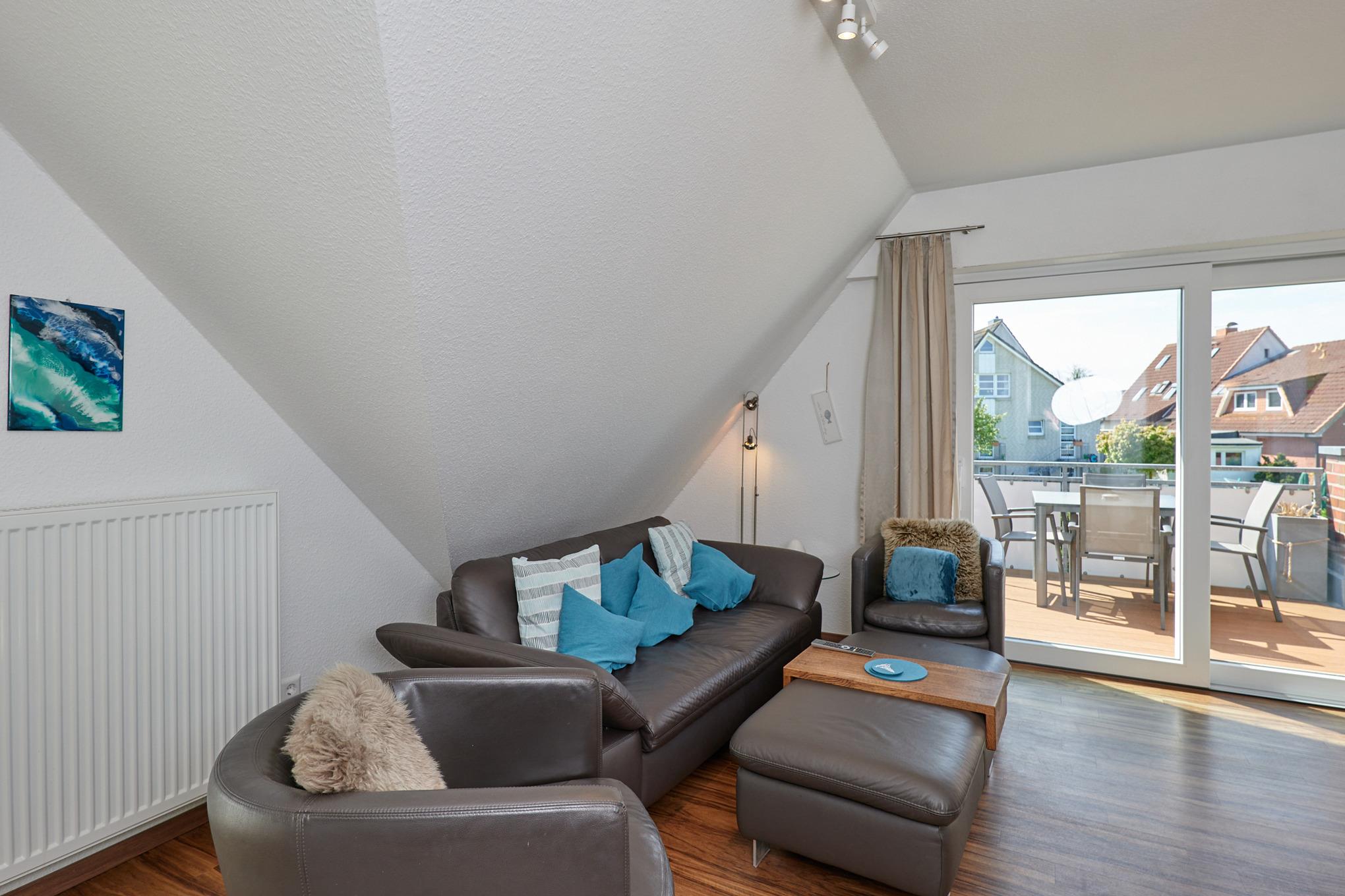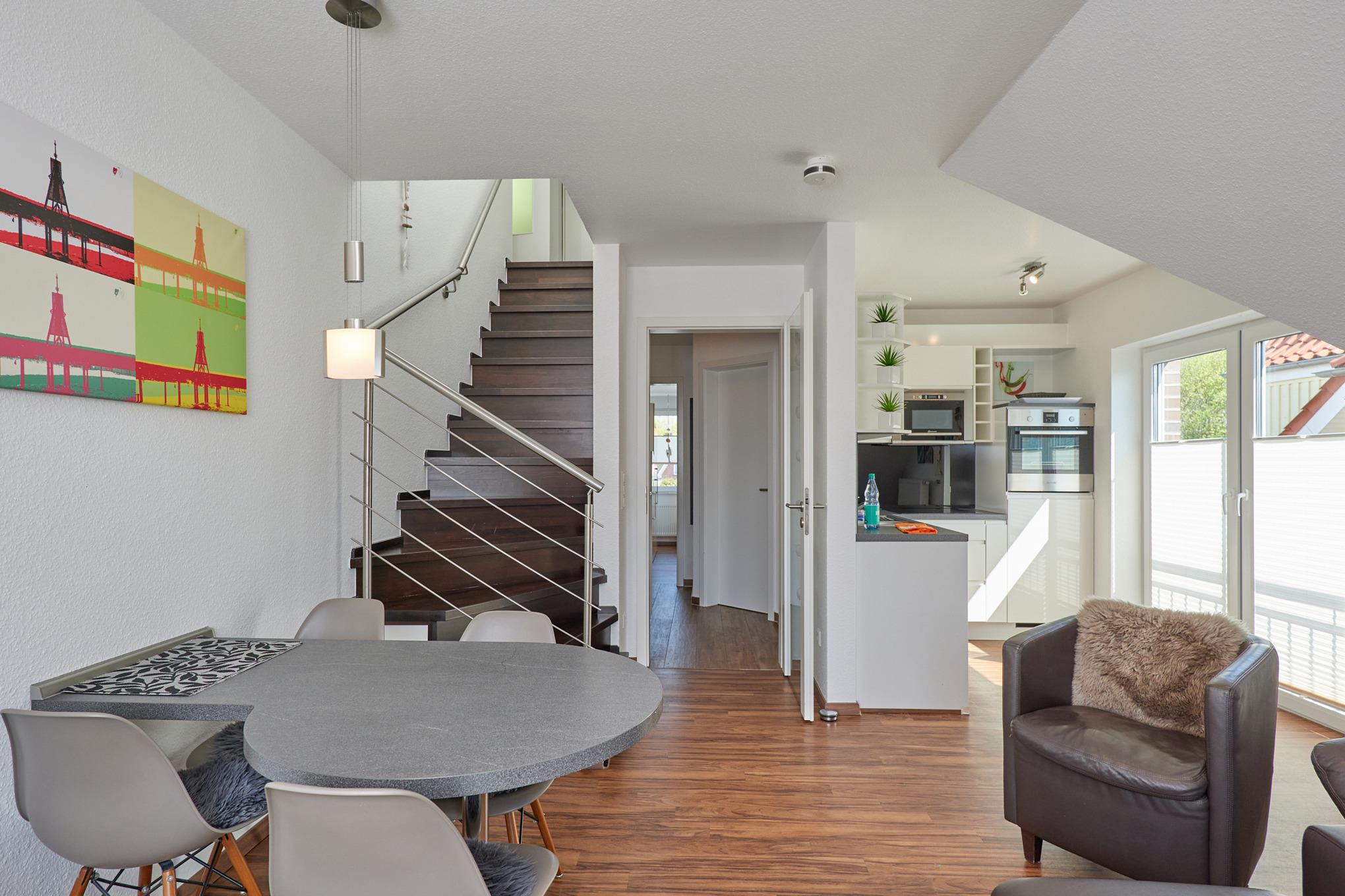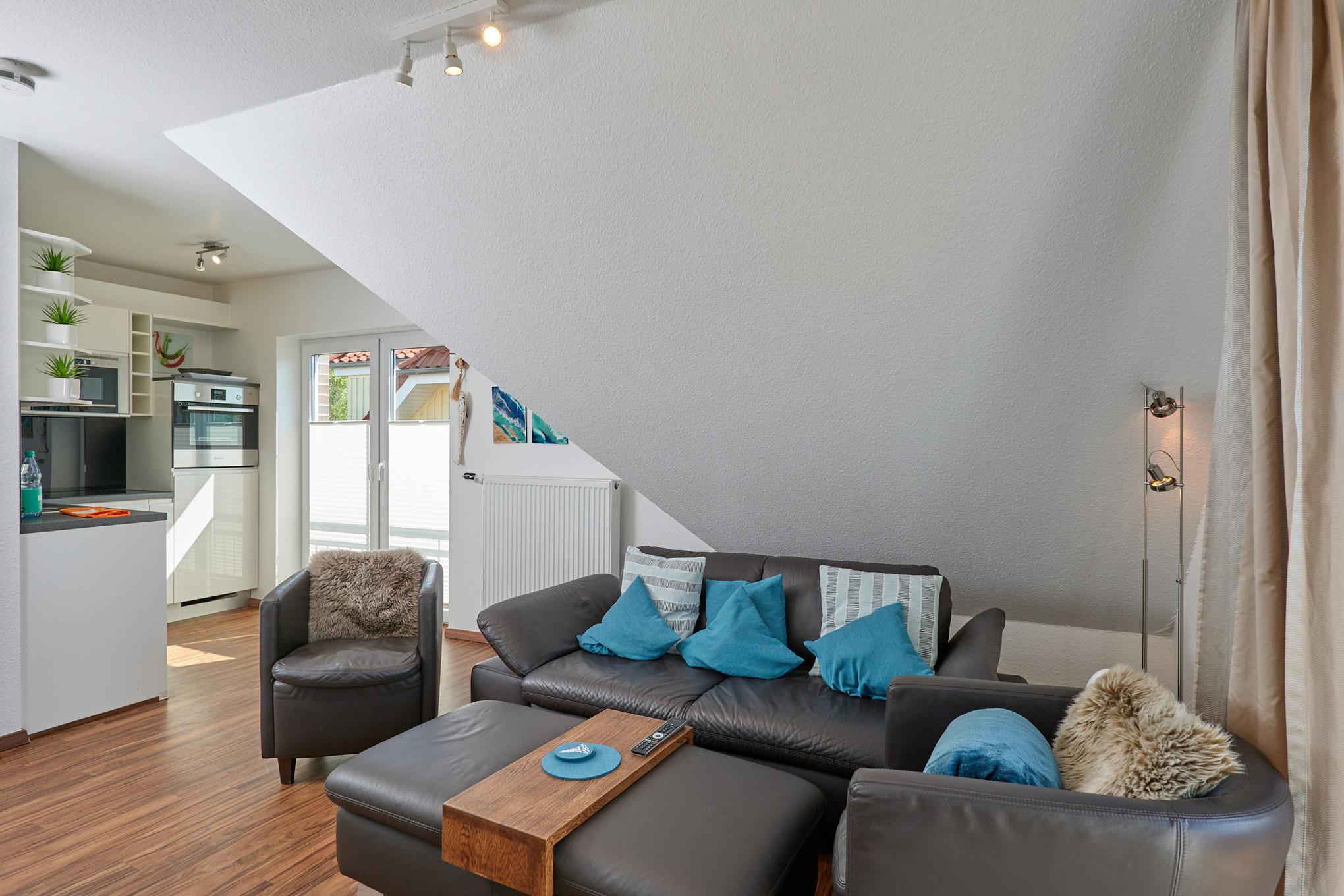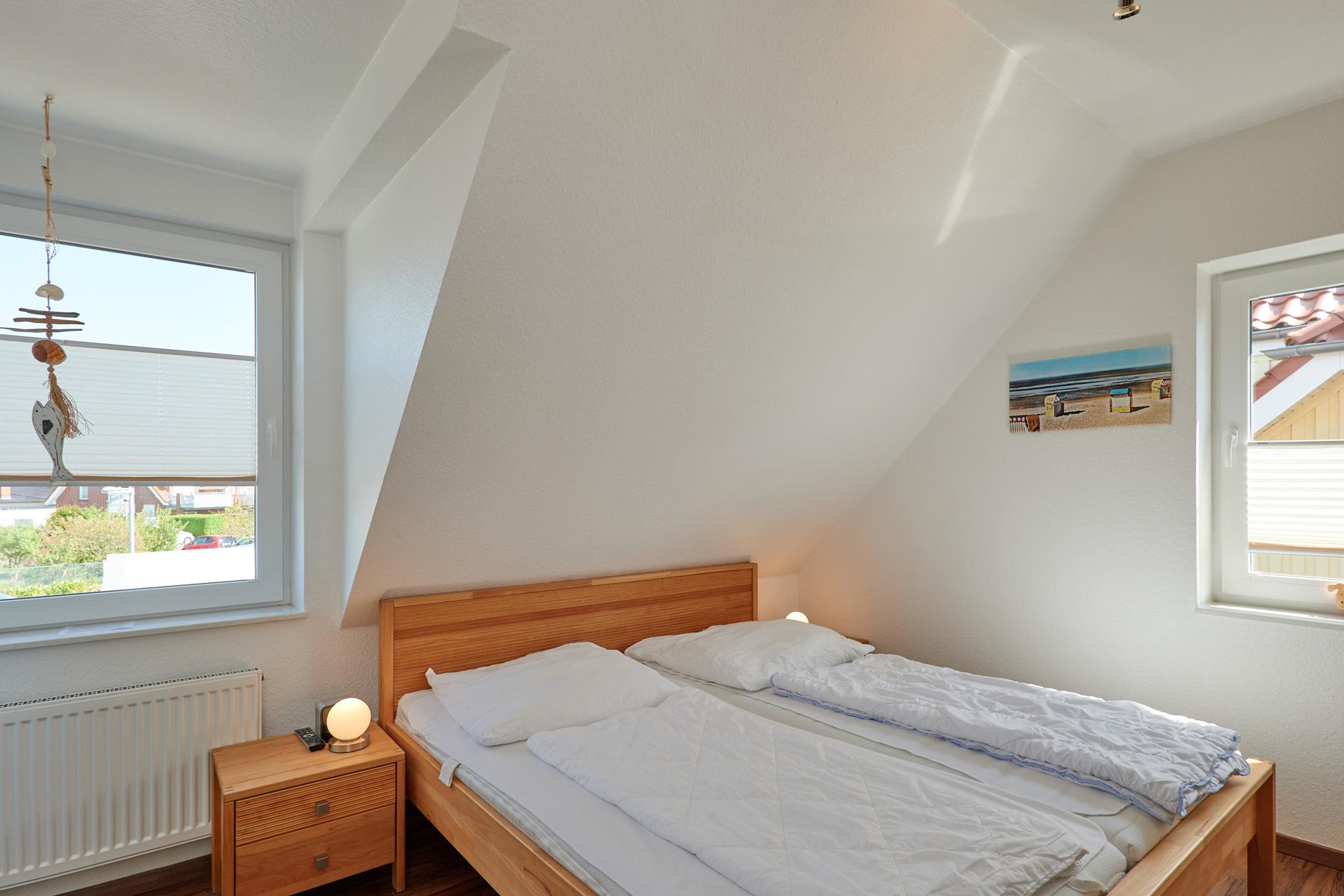 Sehr schöne, helle 3-Raum-Maisonette-Wohnung (57m²) bis 4 Pers., 1.Etage, 1 Schlafzimmer mit Doppelb., 1 Schlafzimmer im Dachgeschoss mit Einzelbetten, 2xDu/Wc, Wohnzimmer mit vollständiger Küchenzeile (Back., Mikrow., Senseo, Geschirrspüler) 3xSAT-TV,DVD-Player, Stereo, W-LAN kostenlos, großer Balkon (süd), Rollläden, Pkw-Stellplatz #5, keine Haustiere erlaubt, Nichtraucher.