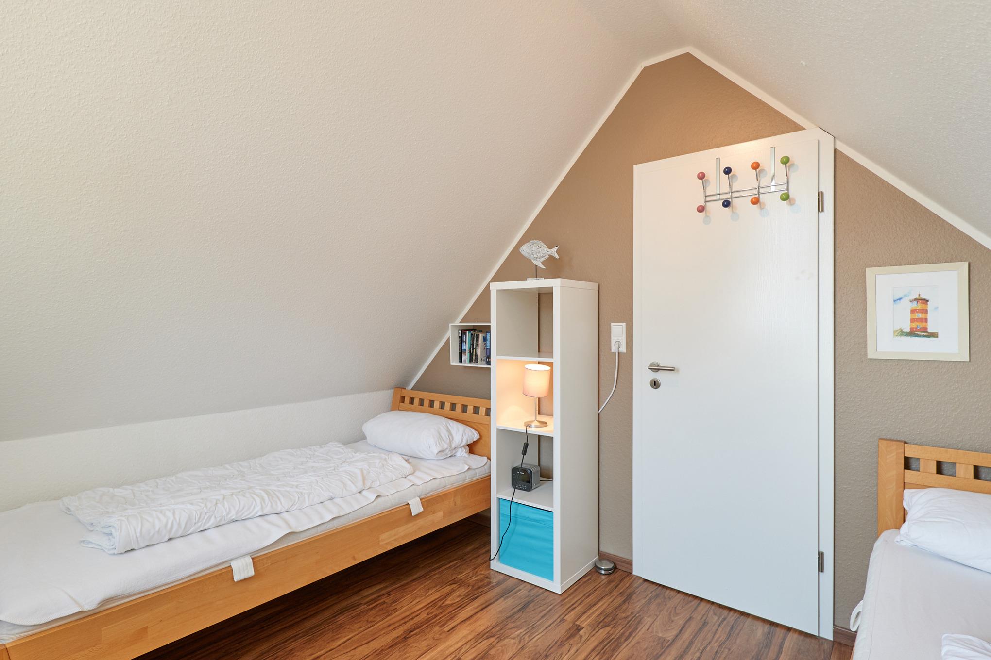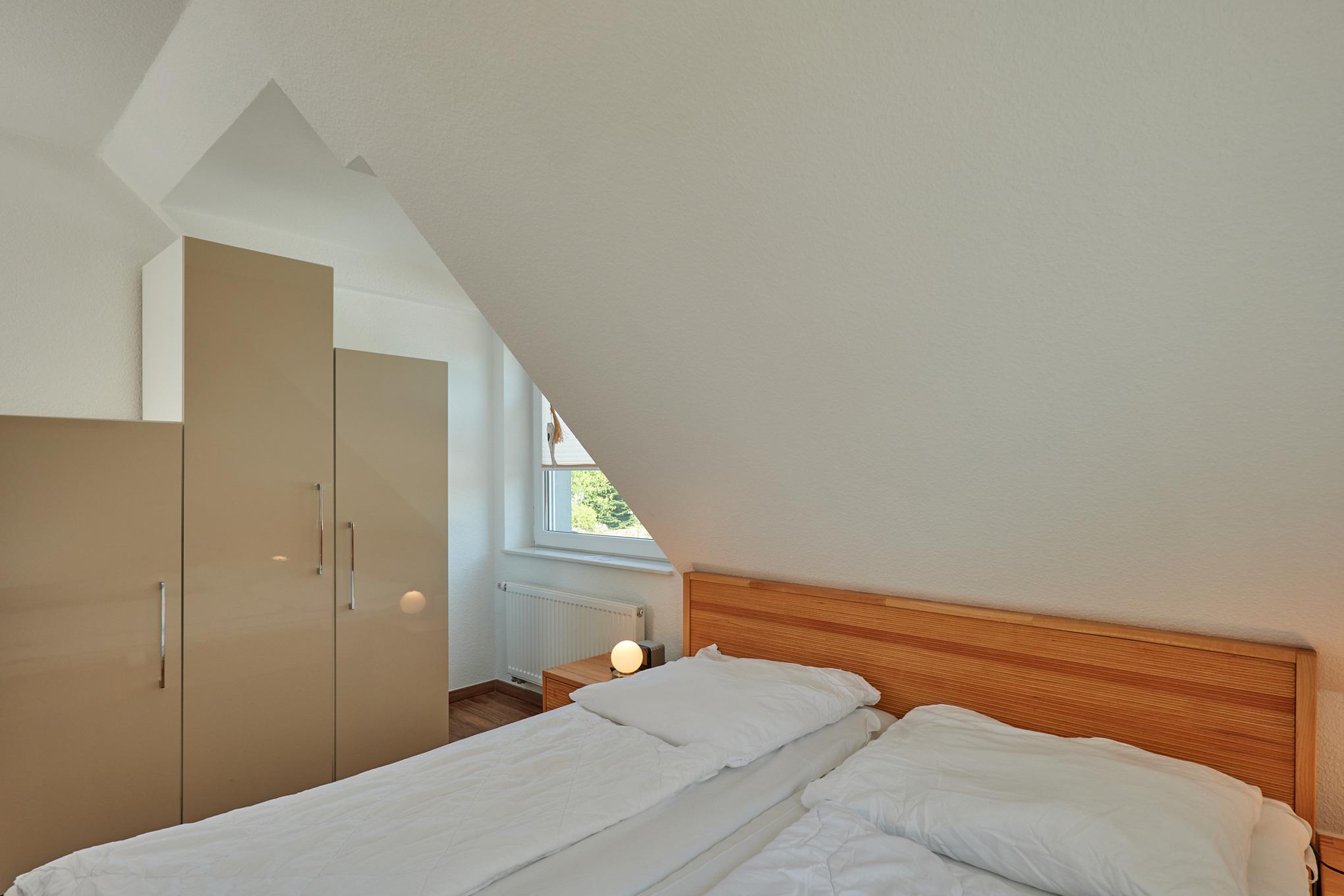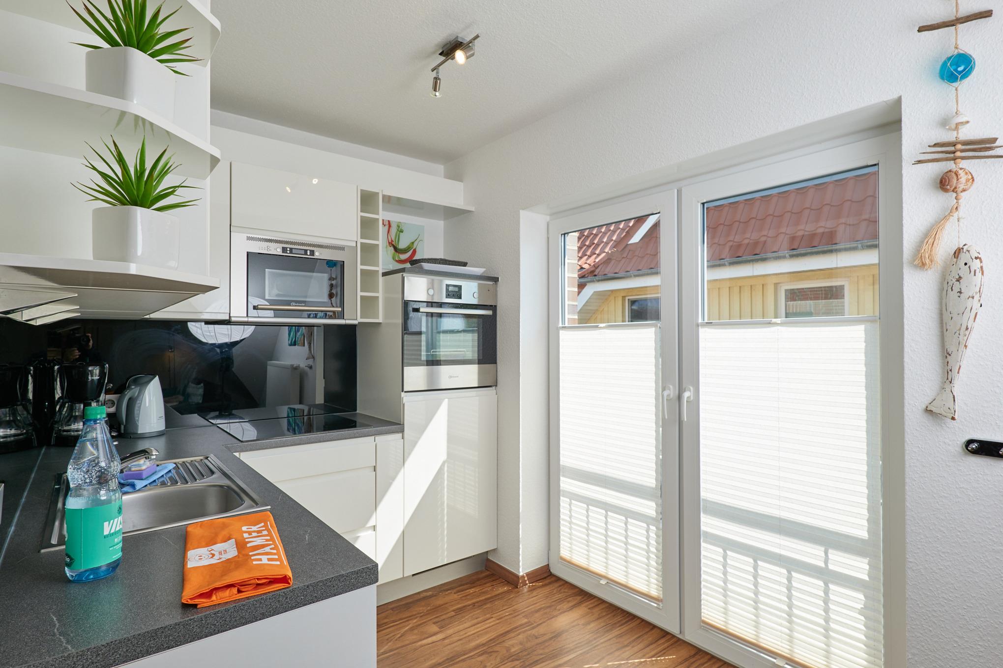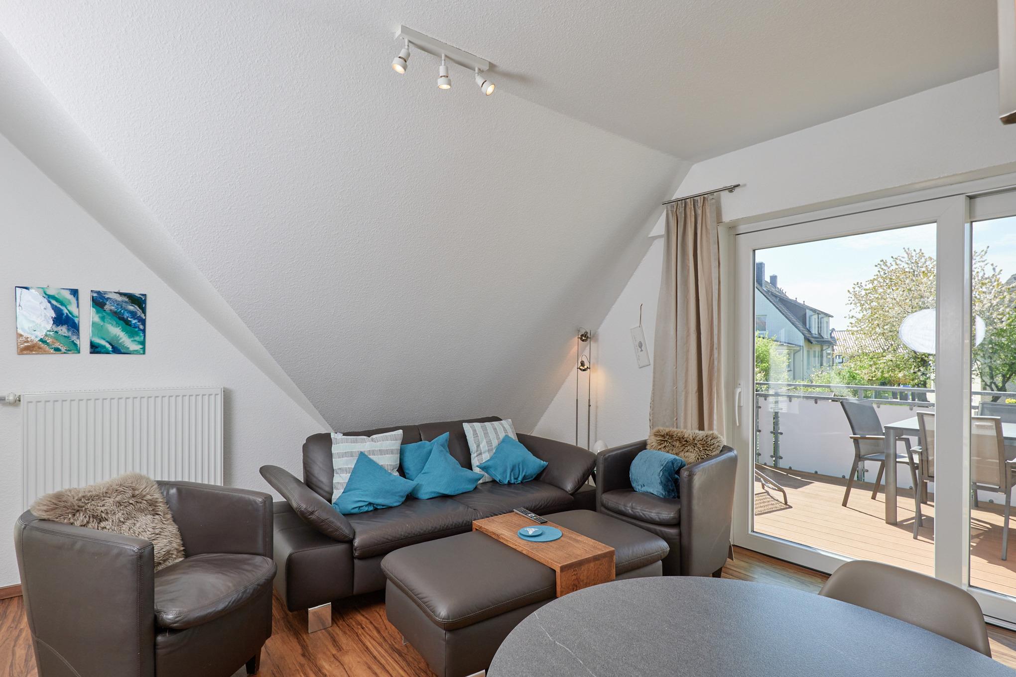 Sehr schöne, helle 3-Raum-Maisonette-Wohnung (57m²) bis 4 Pers., 1.Etage, 1 Schlafzimmer mit Doppelb., 1 Schlafzimmer im Dachgeschoss mit Einzelbetten, 2xDu/Wc, Wohnzimmer mit vollständiger Küchenzeile (Back., Mikrow., Senseo, Geschirrspüler) 3xSAT-TV,DVD-Player, Stereo, W-LAN kostenlos, großer Balkon (süd), Rollläden, Pkw-Stellplatz #5, keine Haustiere erlaubt, Nichtraucher.