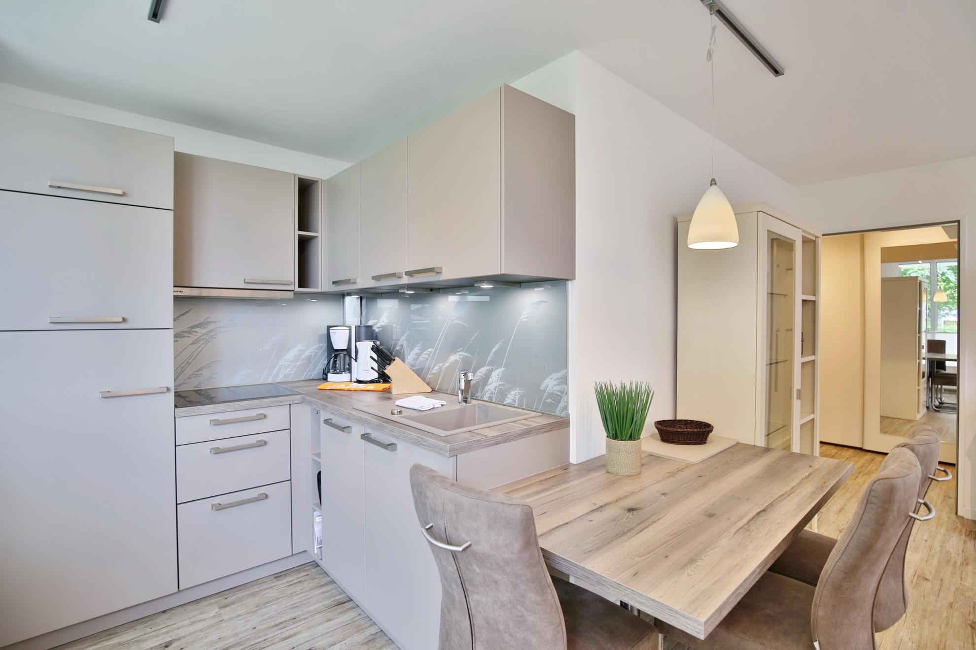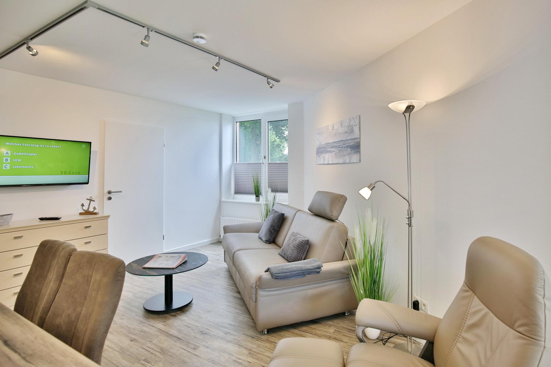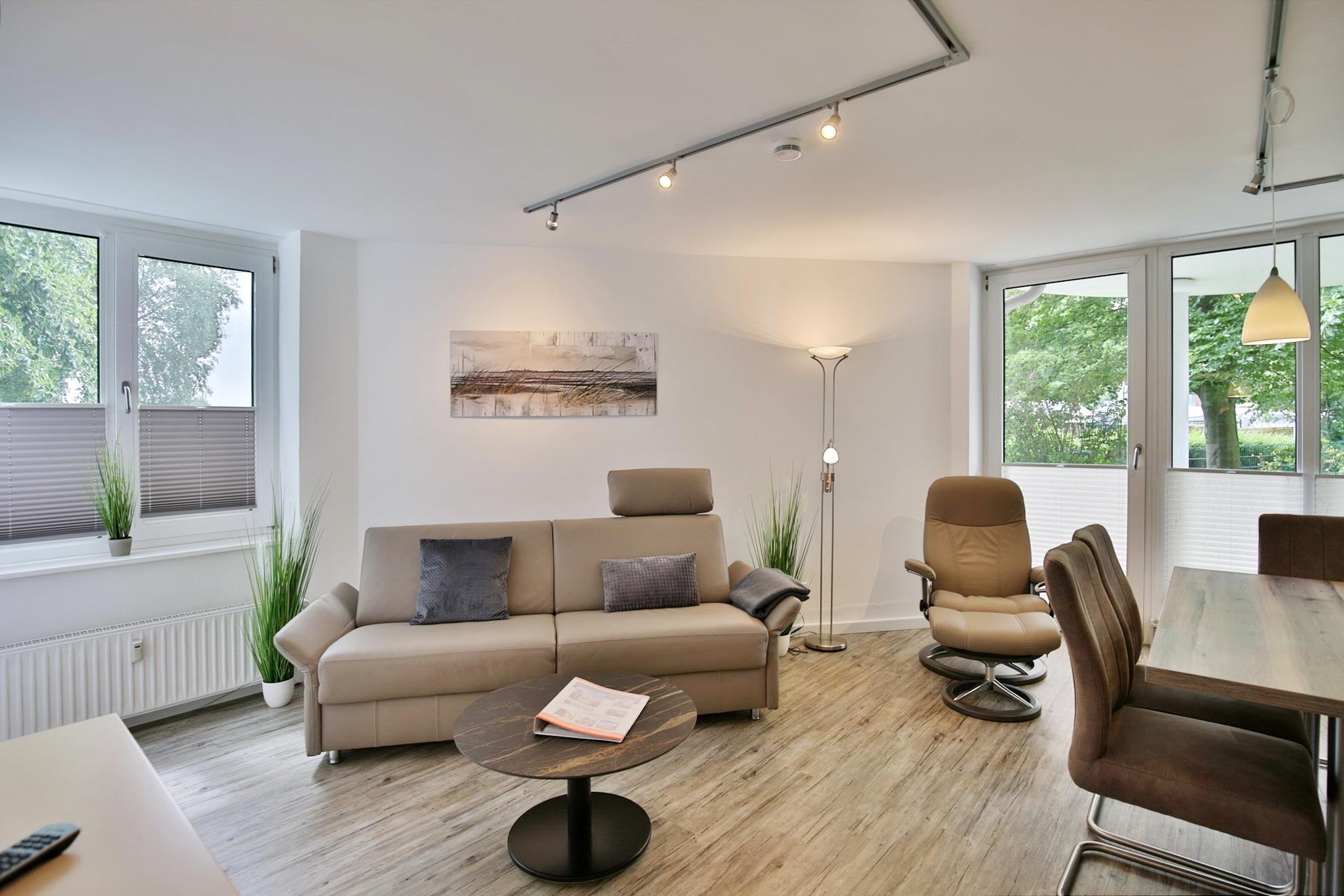 Top sanierte 2-Raum-Eckwohnung auf ca. 42m², parterre, komplett ausgestattet bis 3 Pers., 1 Schlafzimmer mit 2 Einzelbetten (1,90m) und TV, 1 kombiniertes Wohn/Schlafzimmer mit Stressless Lederdoppelbettcouch [&] Sessel, SAT-TV, Sonoro-Hifi-Anlage, kostenloses W-Lan,[nbsp][nbsp]Einbauküche mit Gefrierf., Geschirrspüler u. Mikrowelle, neu Dusche/WC, Flur, Terrasse (west) und Tiefgaragenstellplatz #12. Natürlich Nichtraucher und keine Haustiere.