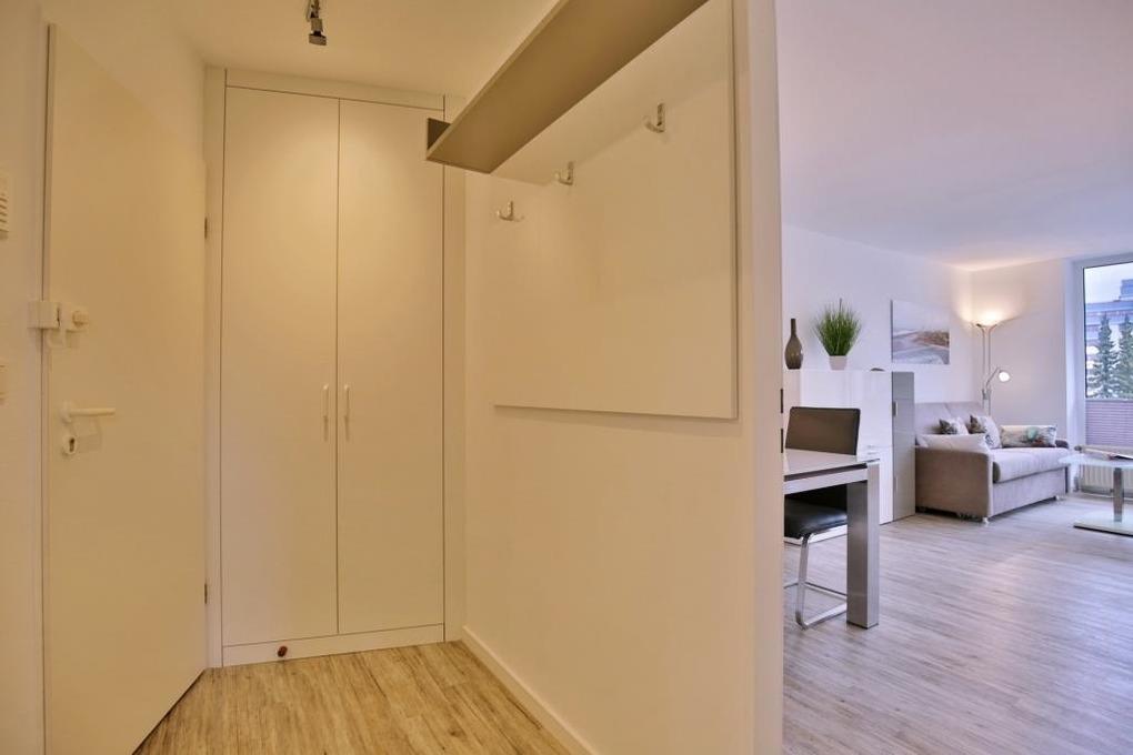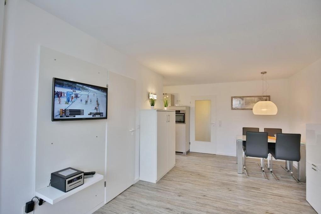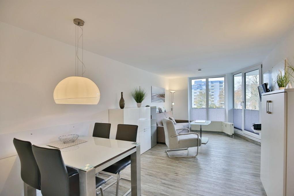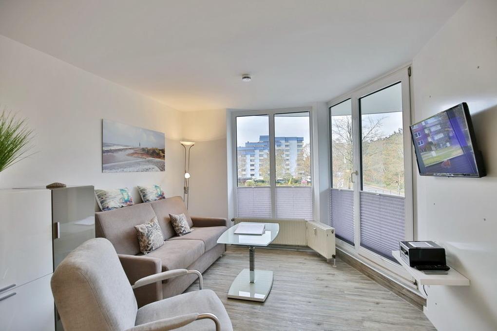 Neu renovierte 2-Raum-Eckwohnung mit 42m² auf der 2. Etage. Komplett ausgestattet bis 3 Pers.. 1 Schlafzimmer mit 2 Einzelbetten (1,90m), 1 kombiniertes Wohn/Schlafzimmer mit Doppelbettcouch, Sat-TV, Sonoro-HiFi-Anlage, kostenloses W-Lan. Komplette Küchenzeile mit Geschirrspüler, Mikrowelle [&] Ceranfeld, Tageslichtbad mit Dusche/WC, Flur, Balkon (west) mit Balkonmöbeln und Sonnenschirm (saisonabhängig). PKW-Stellplatz #202 in der Tiefgarage. Natürlich Nichtraucher [&] keine Haustiere.