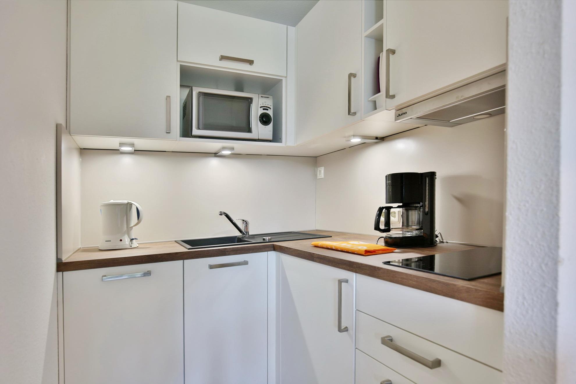 Sonnige 2-Raum-Wohnung auf ca. 40m², 2. Etage, renoviert und komplett ausgestattet bis 4 Pers., 1 Schlafzimmer mit 2 Einzelbetten, 1 kombiniertes Wohn/Schlafzimmer mit Doppelbettcouch, SAT-TV, kostenloses W-Lan, neue Küchenzeile mit Gefrierf., Mikrowelle [&] Geschirrspüler, Dusche/WC, Föhn, Flur, Westbalkon (mit Balkonmöbeln [&] Sonnenschirm, saisonabhängig), Nichtraucher, keine Haustiere, Pkw-Stellplatz in der Tiefgarage #208.