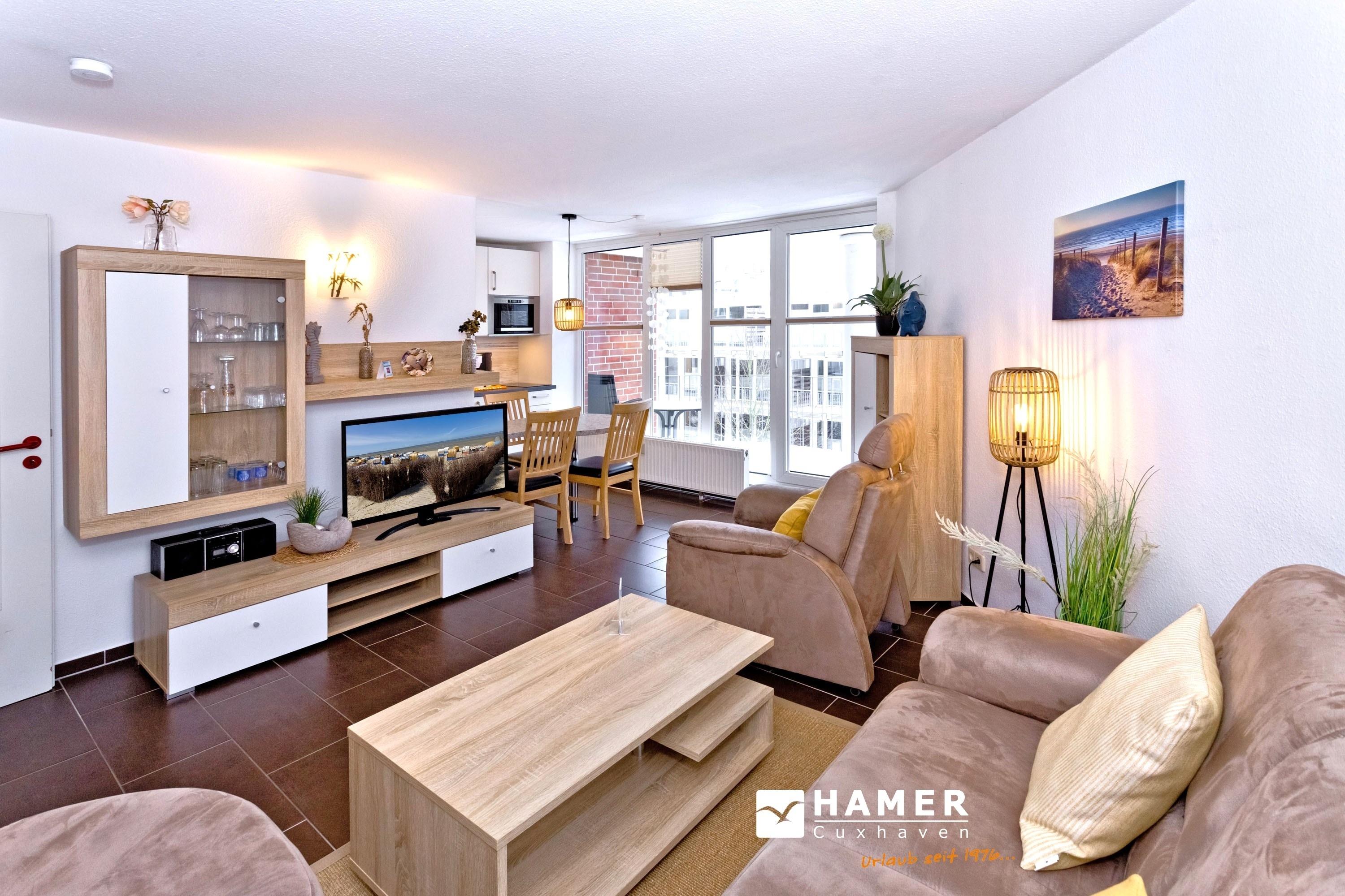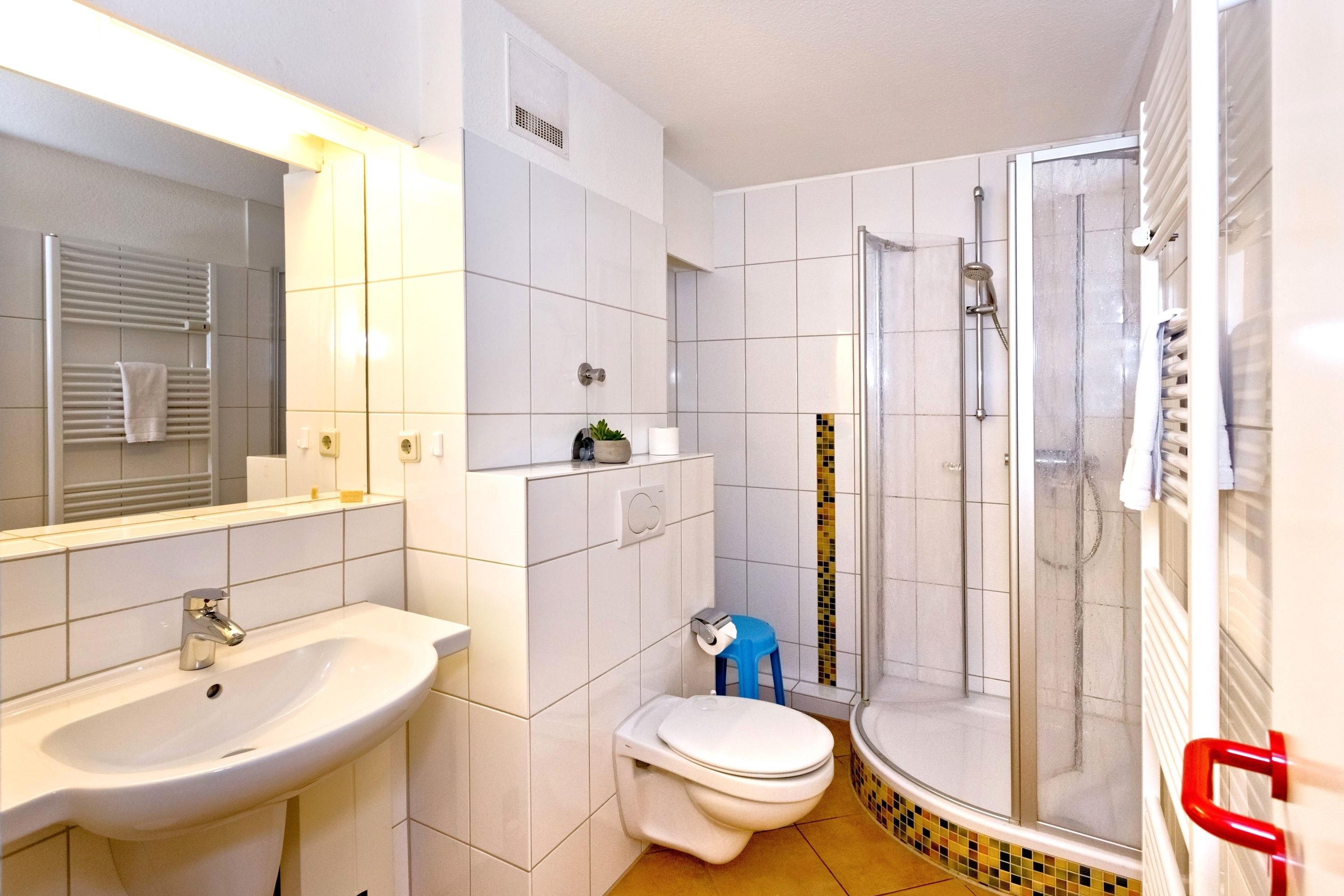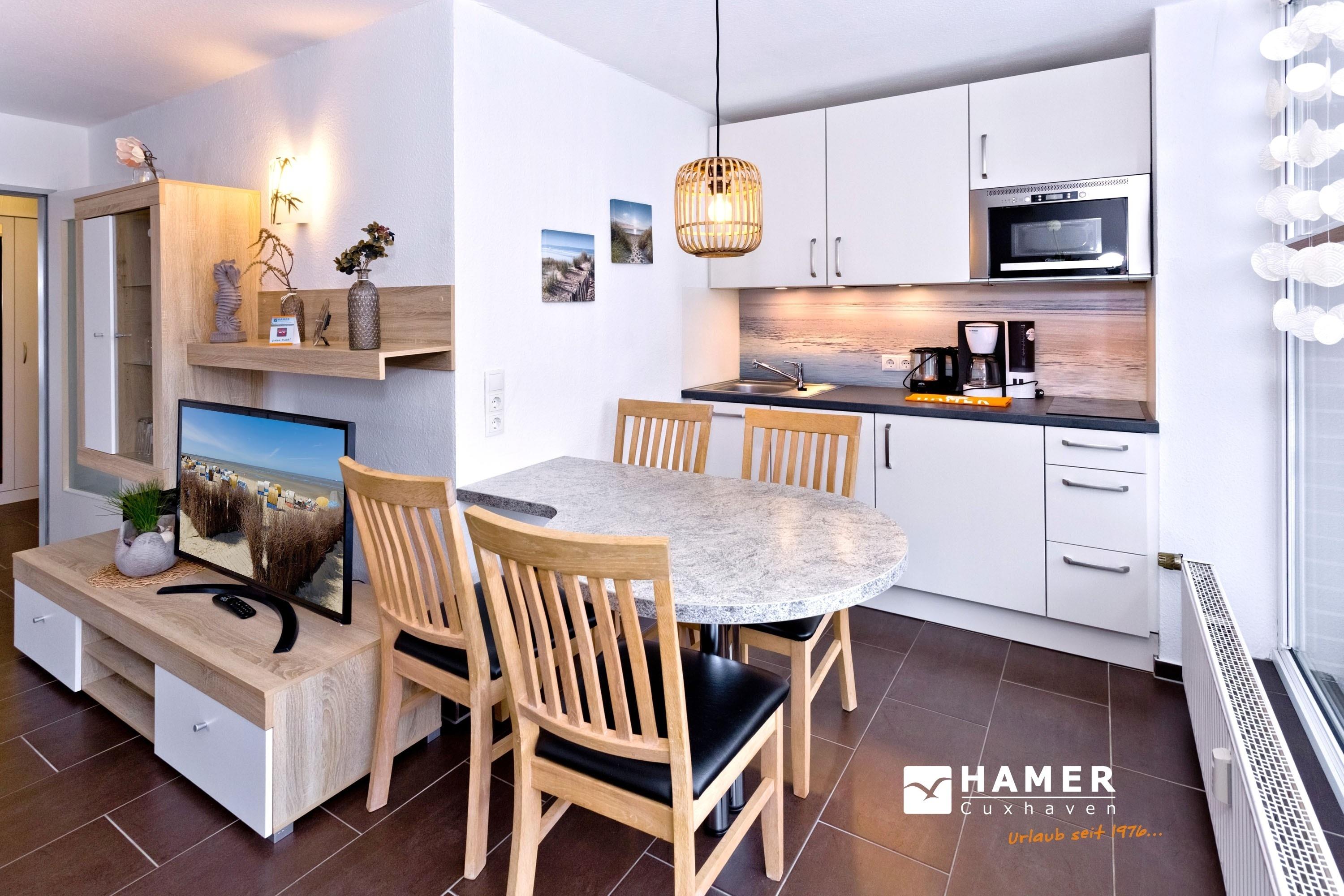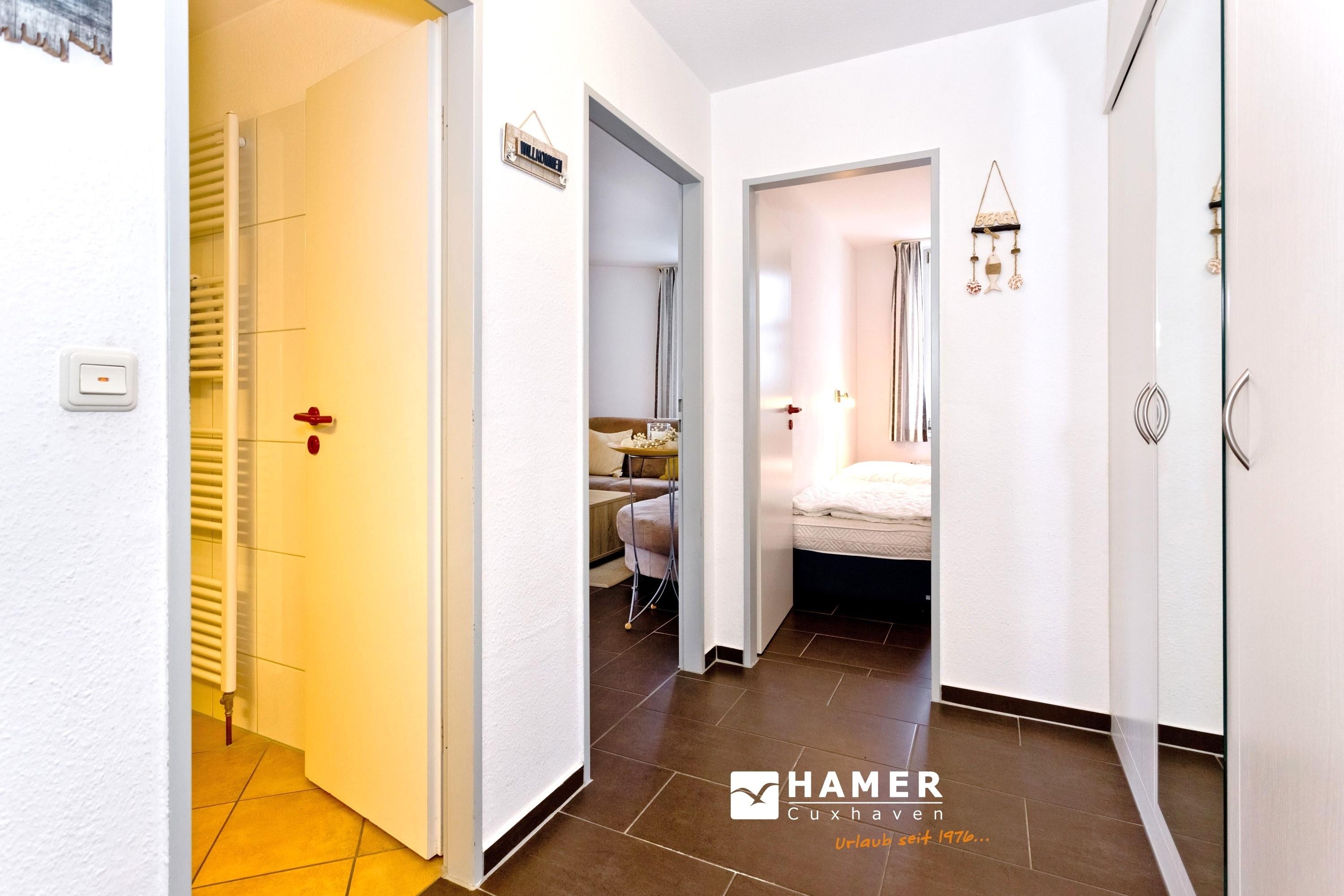 2-Raum-Eckwohnung auf ca. 42m², 2. Etage, schön renoviert und komplett ausgestattet bis 4 Pers., 1 Schlafzimmer mit 2 Einzelbetten, 1 kombiniertes Wohn/Schlafzimmer mit Doppelbetteckcouch, SAT-TV, kostenloses W-Lan, neue Küchenzeile mit Gefrierfach, Mikrowelle und Geschirrspüler, Dusche/WC, Flur, Balkon (ost), Nichtraucher, keine Haustiere, Pkw-Stellplatz #213 auf dem Außengelände.