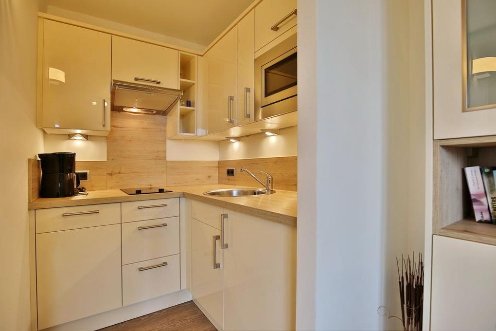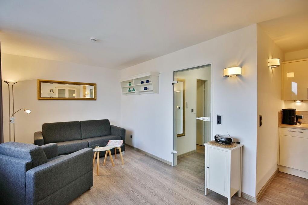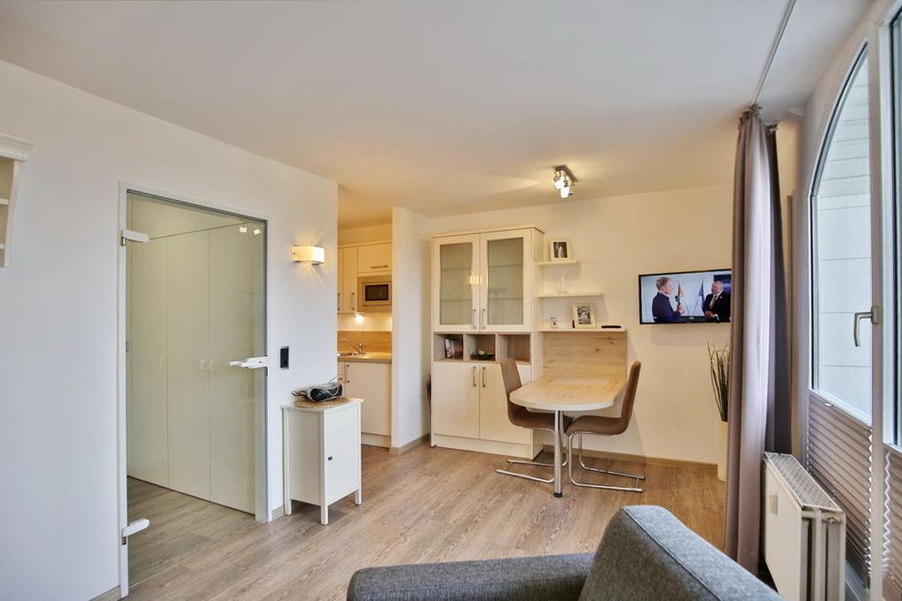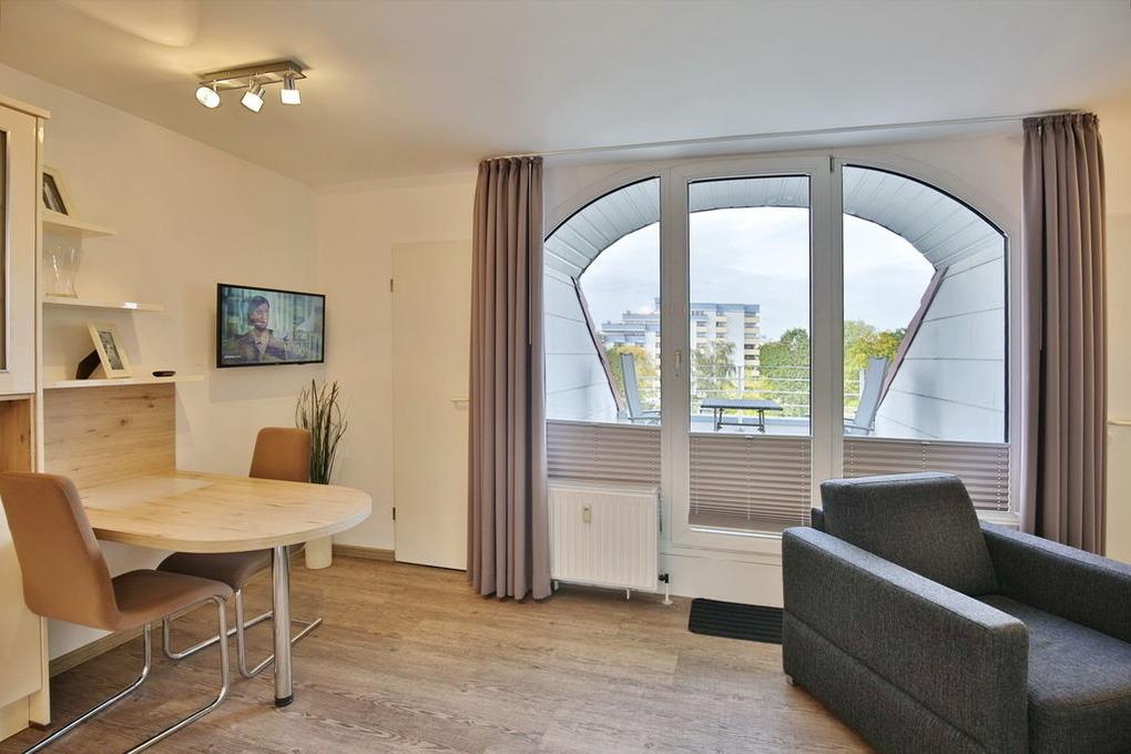 Schönes, neu renoviertes 1-Raum-Appartement auf ca. 28m², 4. Etage, Nichtraucher, komplett ausgestattet bis 2 Pers., 1 kombiniertes Wohn/Schlafzimmer mit Schlafcouch, 1 Einzelbett (0,90x2m)im Nebenraum, SAT-TV, Radio, kostenloses W-Lan,[nbsp][nbsp]Küchenzeile mit Mikrowelle/Grill, Dusche/WC, Flur, Dachterrasse (west) mit Balkonmöbeln und Sonnenschirm (saisonabhängig), Pkw-Stellplatz #406 in der Tiefgarage