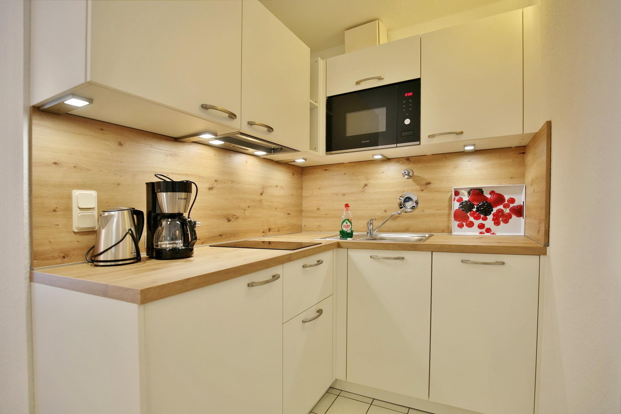 Renovierte 2-Raum-Wohnung auf ca. 45m², parterre, komplett ausgestattet bis 3 Pers., 1 Schlafzimmer mit Doppelbett, 1 kombiniertes Wohn/Schlafzimmer mit Doppelbettcouch, Sat-TV, DVD-Player, Stereo-Anlage, kostenloses W-Lan, neue Küchenzeile [&] neue Du/WC in 2021. Natürlich Nichtraucher [&] keine Haustiere erlaubt. Parkplatz #6 direkt vor dem Appartement, dadurch fällt die Terrasse sehr klein aus.