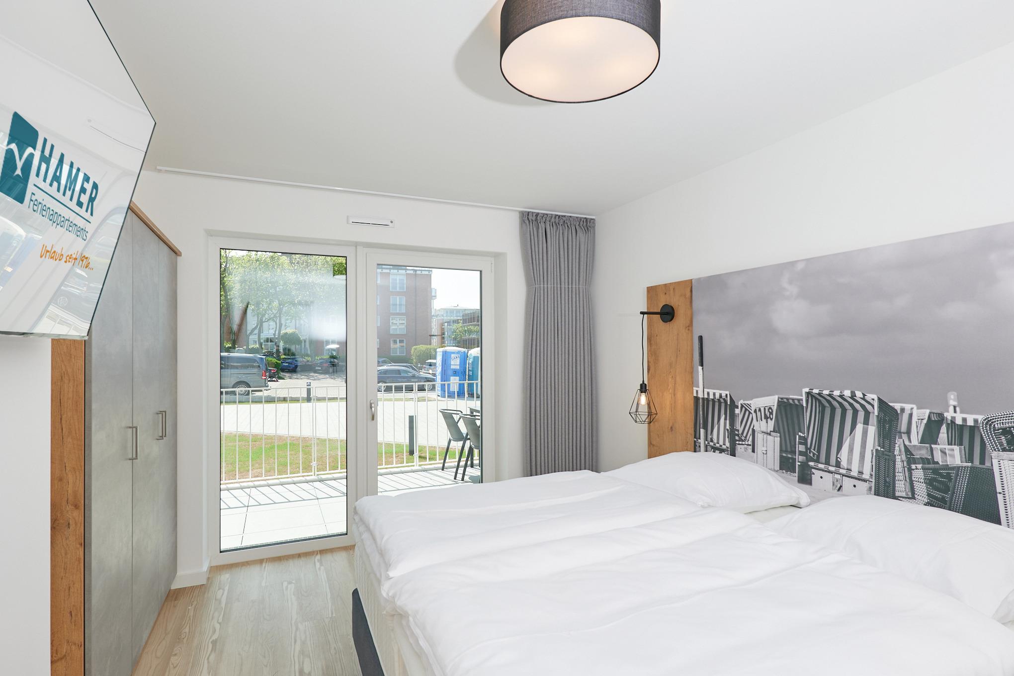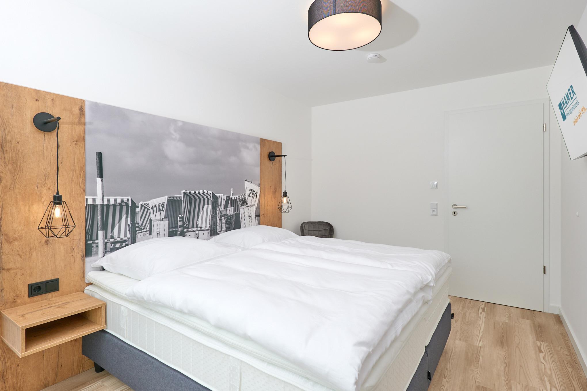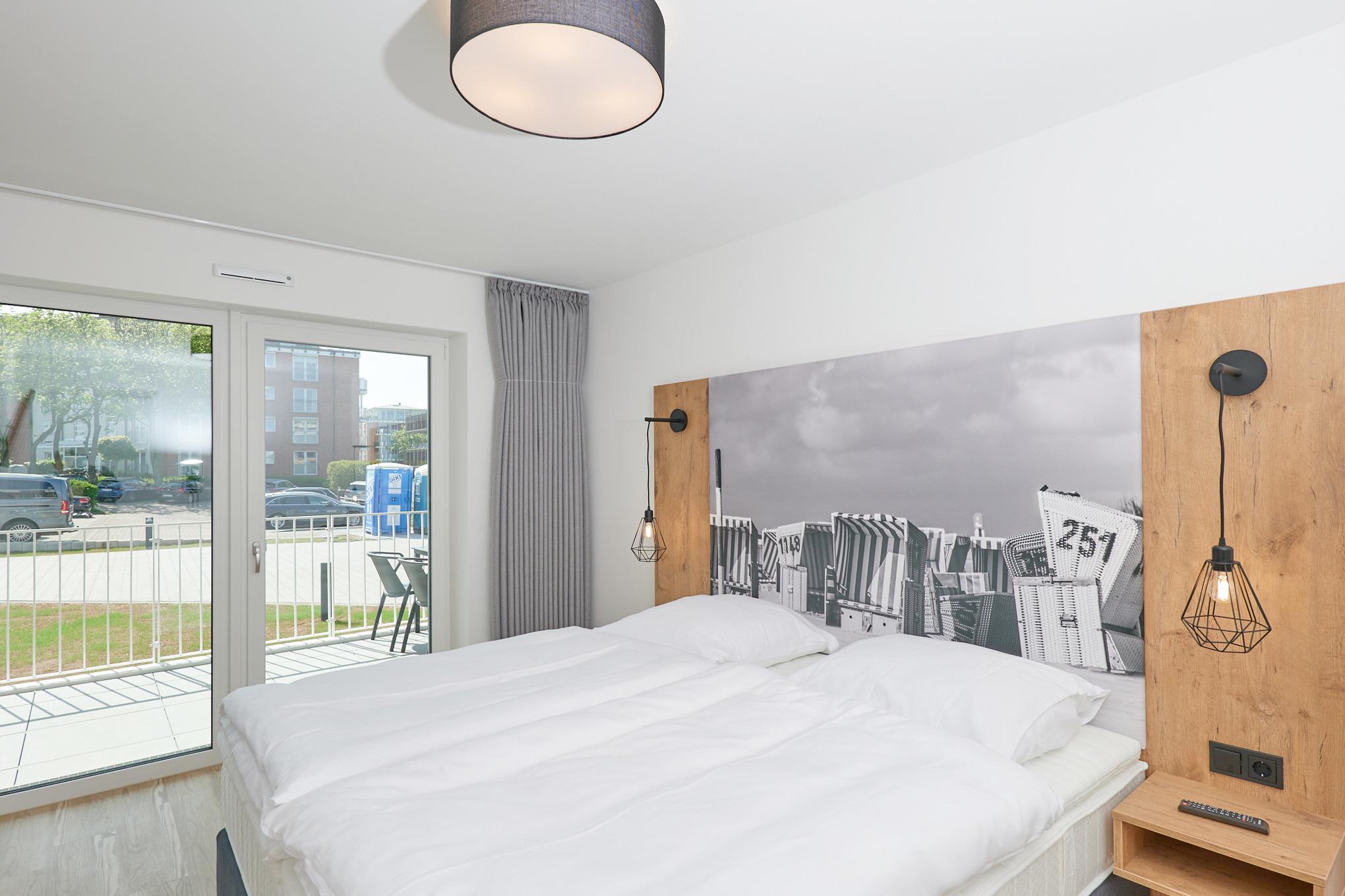 Neubau Mai 2023! Sehr schöne, moderne 3-Raum-Wohnung bis 4 Pers. voll ausgestattet auf ca. 99 m² in der 1.Etage gelegen, 2 Schlafzimmer mit komfortablen Doppelbetten (Bettwäsche inkl.) und Außenjalousien an allen Fenstern, ebenerdige Dusche/WC, Wohnzimmer mit großer Küchenzeile (Backofen, Geschirrspüler, Mikrowelle) 3x Kabel-TV, Radio, kostenfreies W-LAN-Internet, großer Balkon (west) mit Teilseesicht, Personenaufzug, reservierter Pkw-Stellplatz in der Tiefgarage inkl., es sind keine Haustiere erlaubt und natürlich Nichtraucher. Durchfahrtshöhe Tiefgarage: 2,05m.