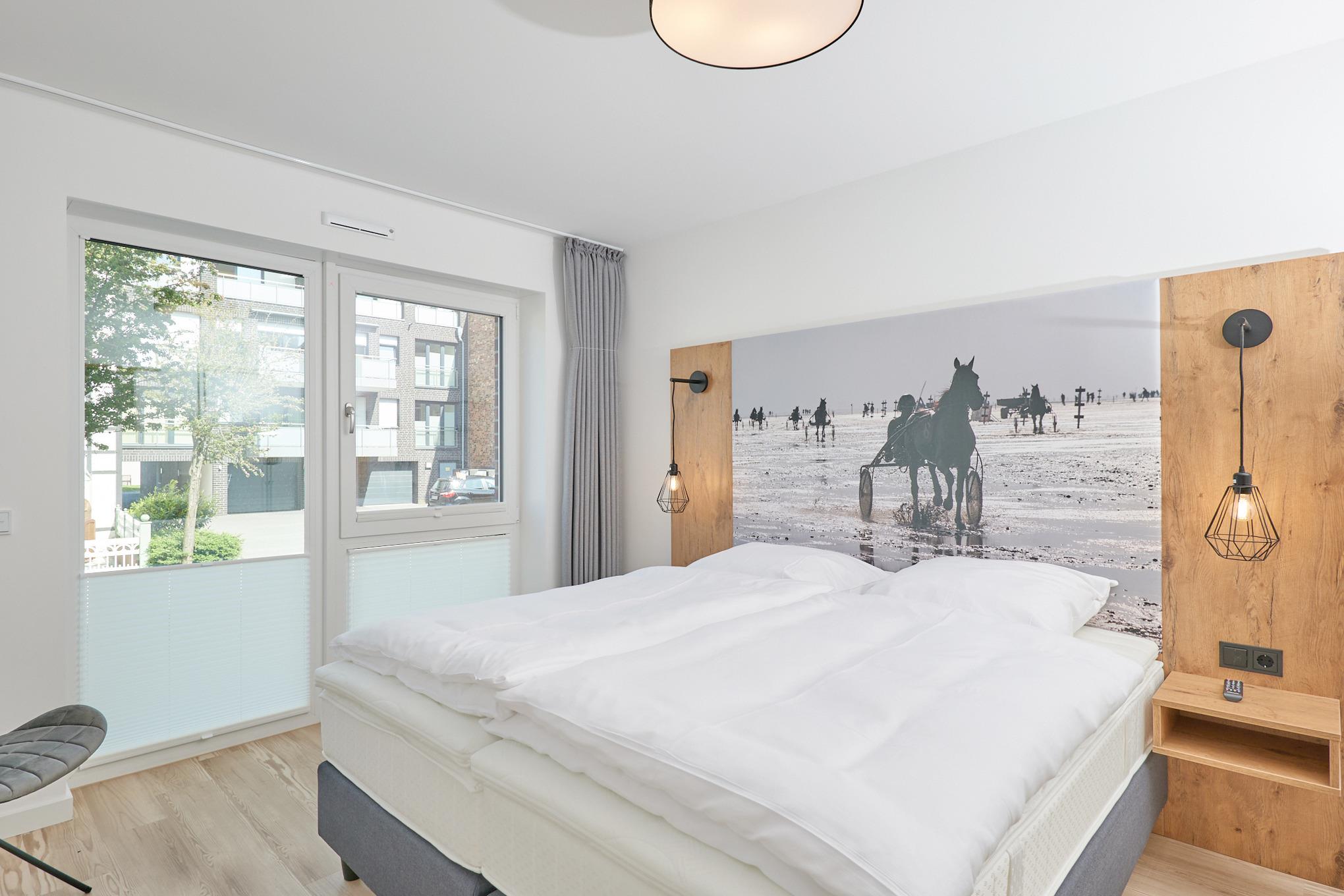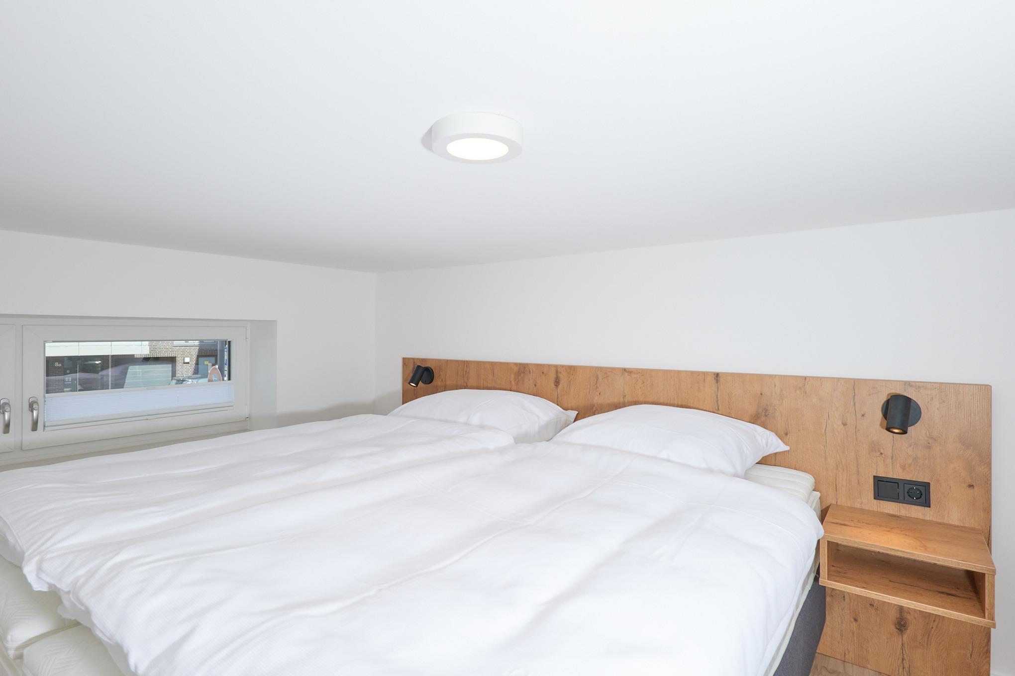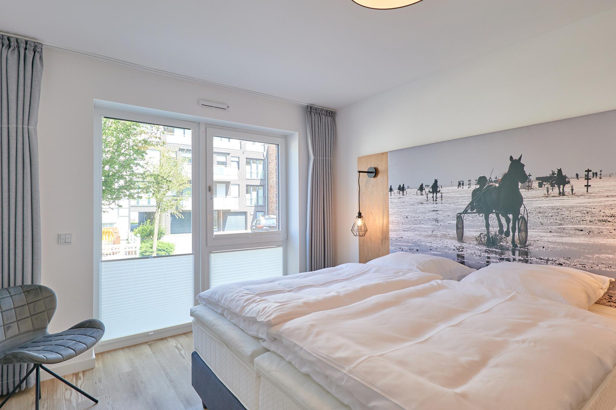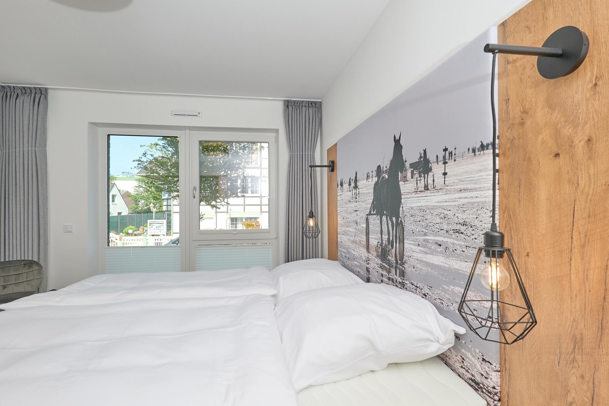 Neubau Mai 2023! Sehr schöne, moderne 3-Raum-Wohnung bis 4 Pers. voll ausgestattet auf ca. 87 m² in der 1.Etage gelegen, 2 Schlafzimmer mit komfortablen Doppelbetten (Bettwäsche inkl.) und Außenjalousien an allen Fenstern, Hinweis: Ein Schlafzimmer mit Empore für das Doppelbett - eingeschränkte Kopffreiheit, ebenerdige Dusche/WC, Wohnzimmer mit großer Küchenzeile (Backofen, Geschirrspüler, Mikrowelle) 2x Kabel-TV, Radio, kostenfreies W-LAN-Internet, kleiner Balkon (nord/ost) mit Teilseesicht, Personenaufzug, reservierter Pkw-Stellplatz in der Tiefgarage inkl., es sind keine Haustiere erlaubt und natürlich Nichtraucher. Durchfahrtshöhe Tiefgarage: 2,05m.