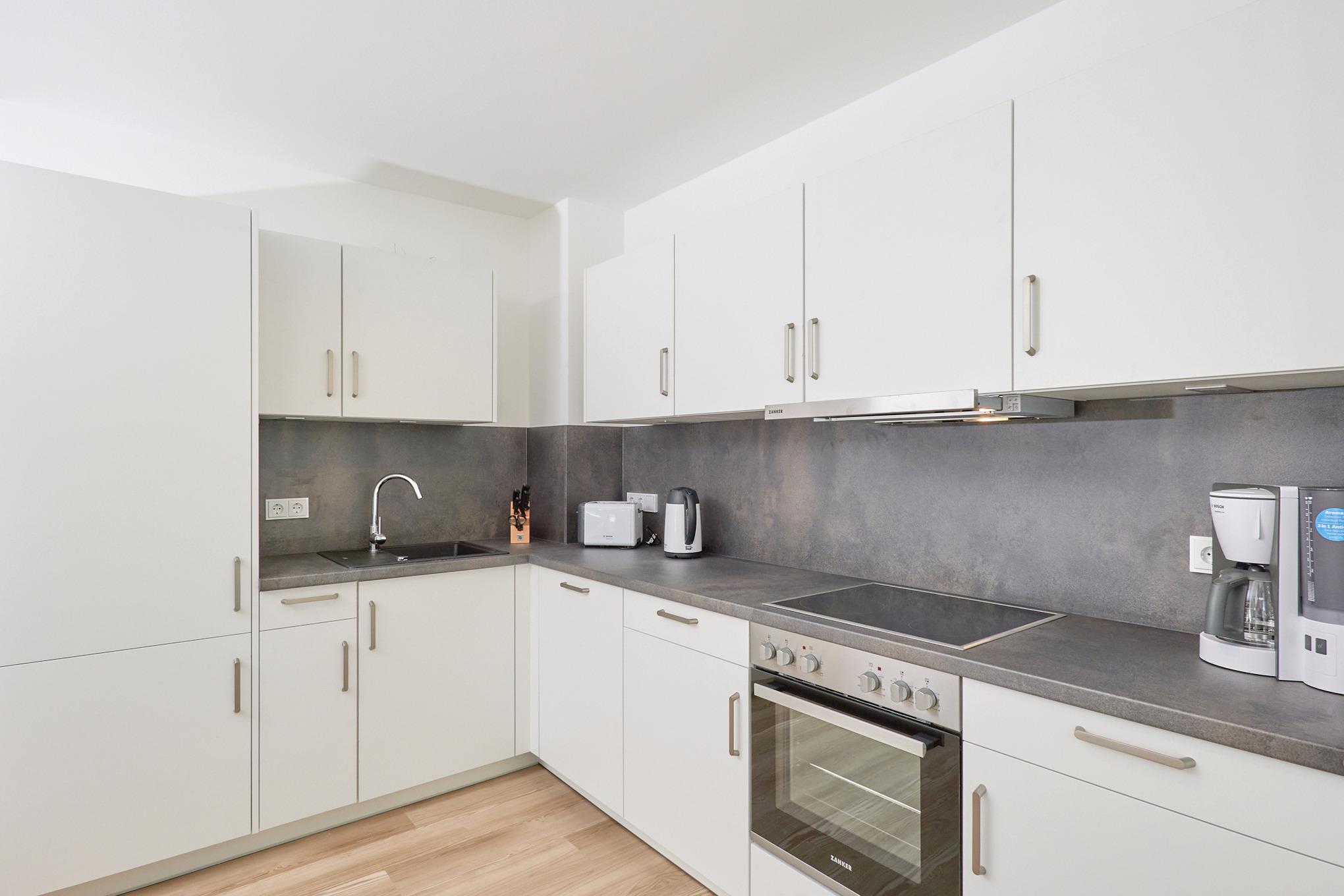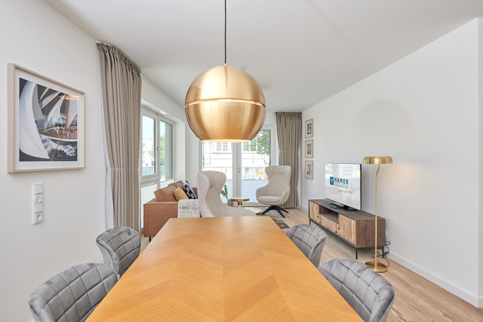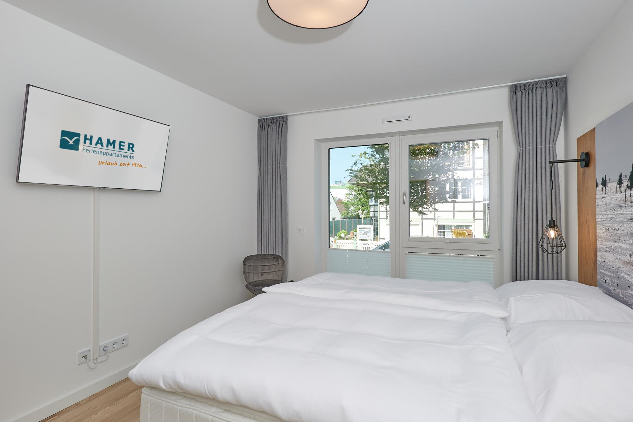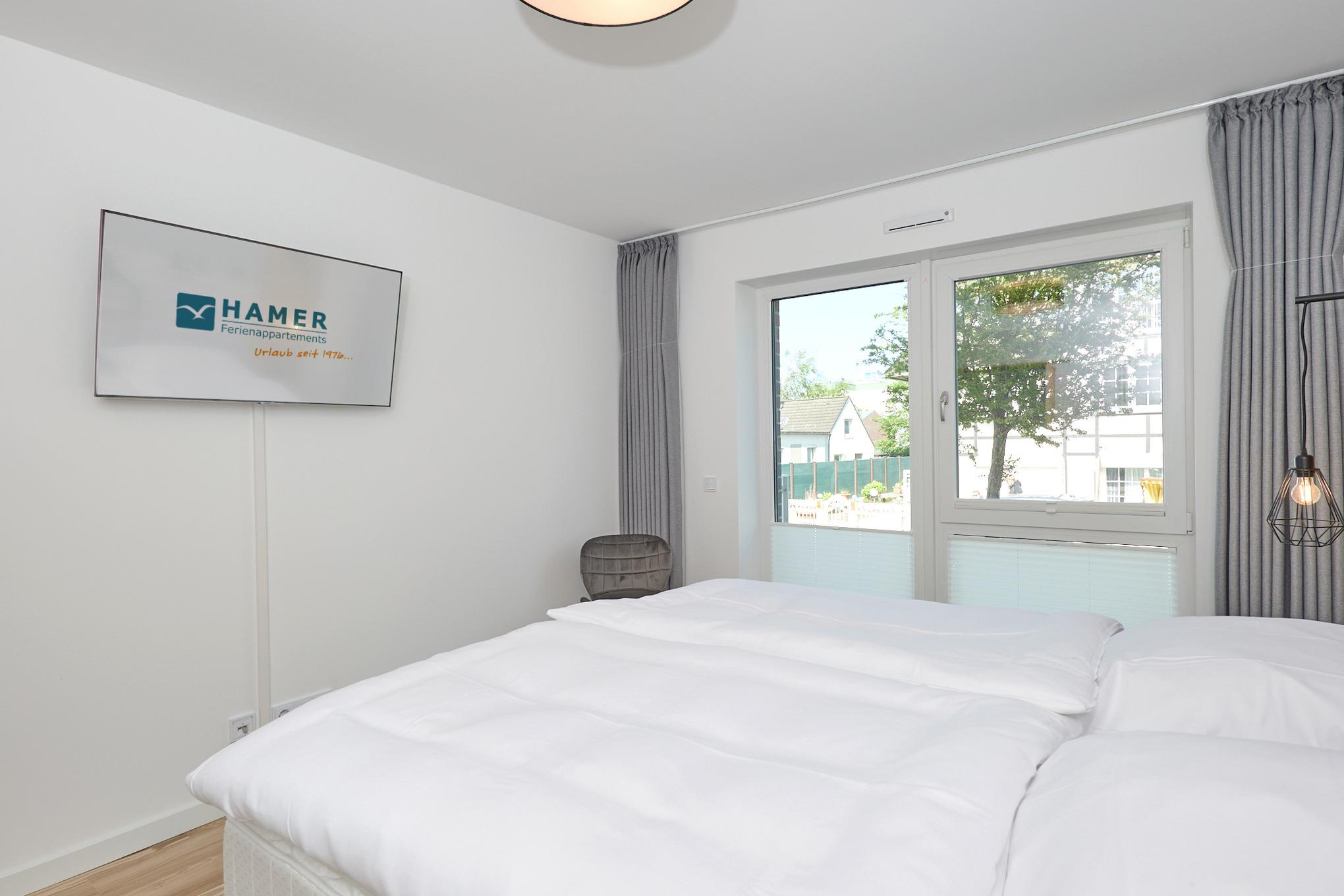 Neubau Mai 2023! Sehr schöne, moderne 3-Raum-Wohnung bis 4 Pers. voll ausgestattet auf ca. 87 m² in der 1.Etage gelegen, 2 Schlafzimmer mit komfortablen Doppelbetten (Bettwäsche inkl.) und Außenjalousien an allen Fenstern, Hinweis: Ein Schlafzimmer mit Empore für das Doppelbett - eingeschränkte Kopffreiheit, ebenerdige Dusche/WC, Wohnzimmer mit großer Küchenzeile (Backofen, Geschirrspüler, Mikrowelle) 2x Kabel-TV, Radio, kostenfreies W-LAN-Internet, kleiner Balkon (nord/ost) mit Teilseesicht, Personenaufzug, reservierter Pkw-Stellplatz in der Tiefgarage inkl., es sind keine Haustiere erlaubt und natürlich Nichtraucher. Durchfahrtshöhe Tiefgarage: 2,05m.