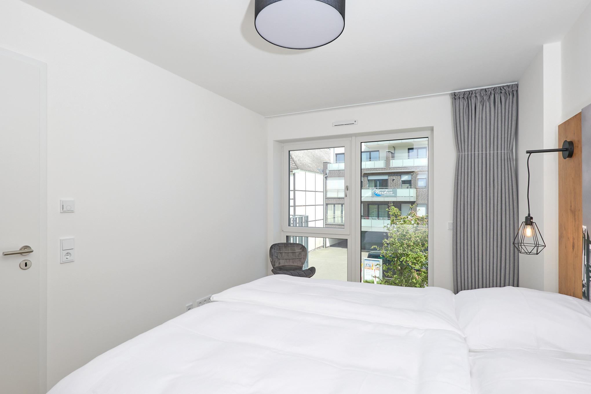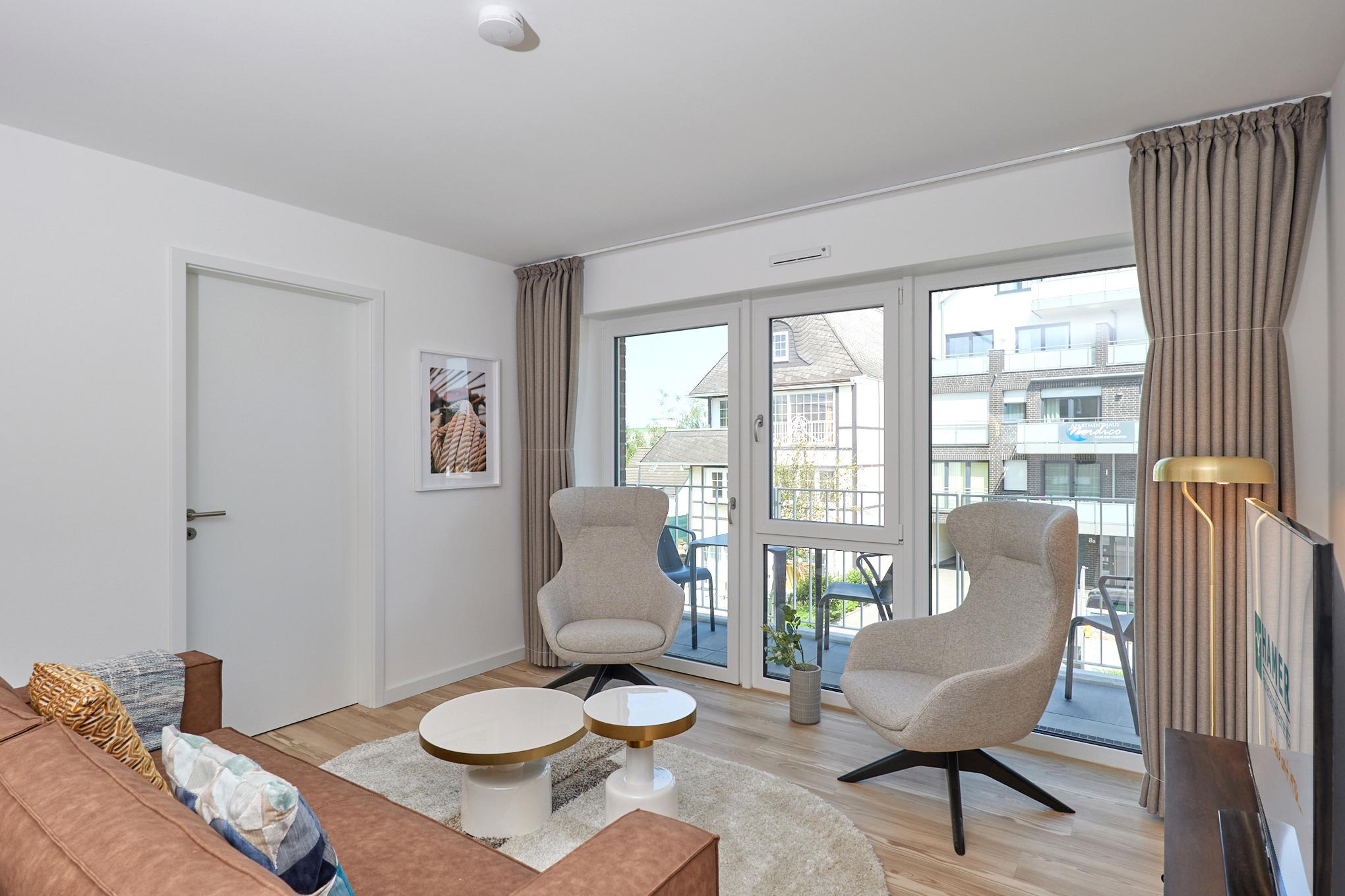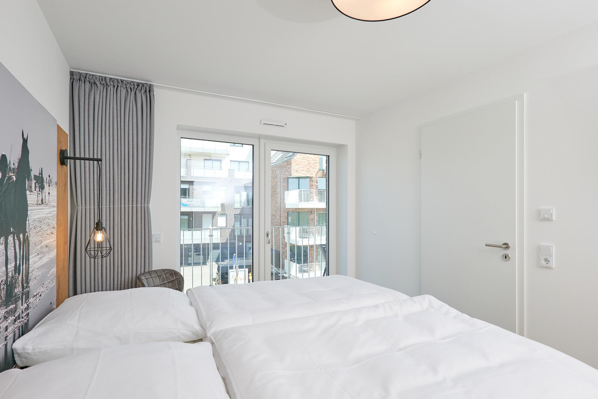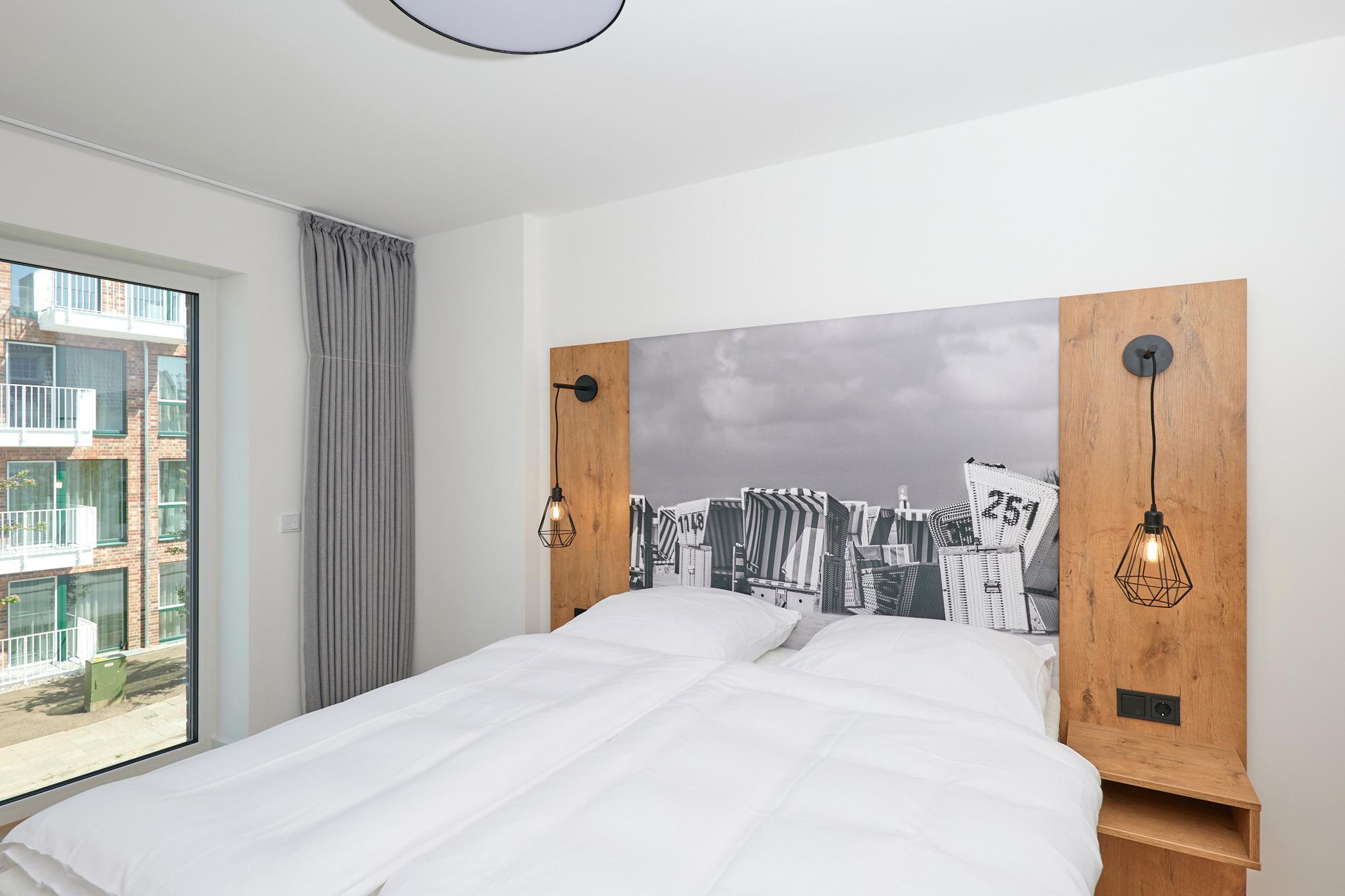 Neubau Mai 2023! Sehr schöne, moderne 3-Raum-Wohnung bis 4 Pers. voll ausgestattet auf ca. 73 m² in der 2.Etage gelegen, 2 Schlafzimmer mit komfortablen Doppelbetten (Bettwäsche inkl.) und Außenjalousien an allen Fenstern, ebenerdige Dusche/WC, Wohnzimmer mit großer Küchenzeile (Backofen, Geschirrspüler, Mikrowelle), 3x Kabel-TV, Radio, kostenfreies W-LAN-Internet, kleiner Balkon (ost) mit Teilseesicht, Personenaufzug, reservierter Pkw-Stellplatz in der Tiefgarage inkl., es sind keine Haustiere erlaubt und natürlich Nichtraucher. Durchfahrtshöhe Tiefgarage: 2,05m.