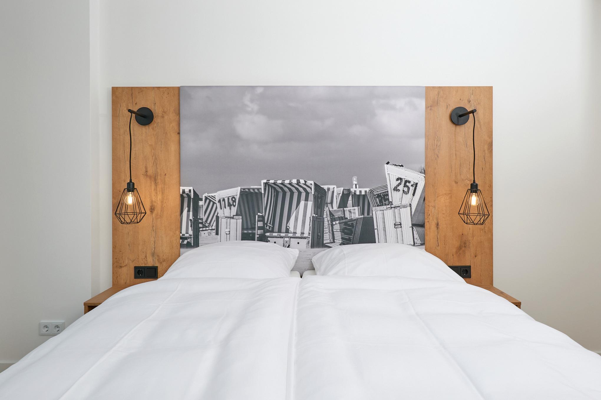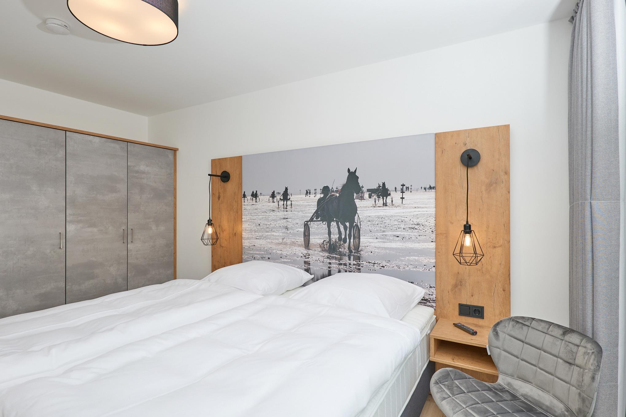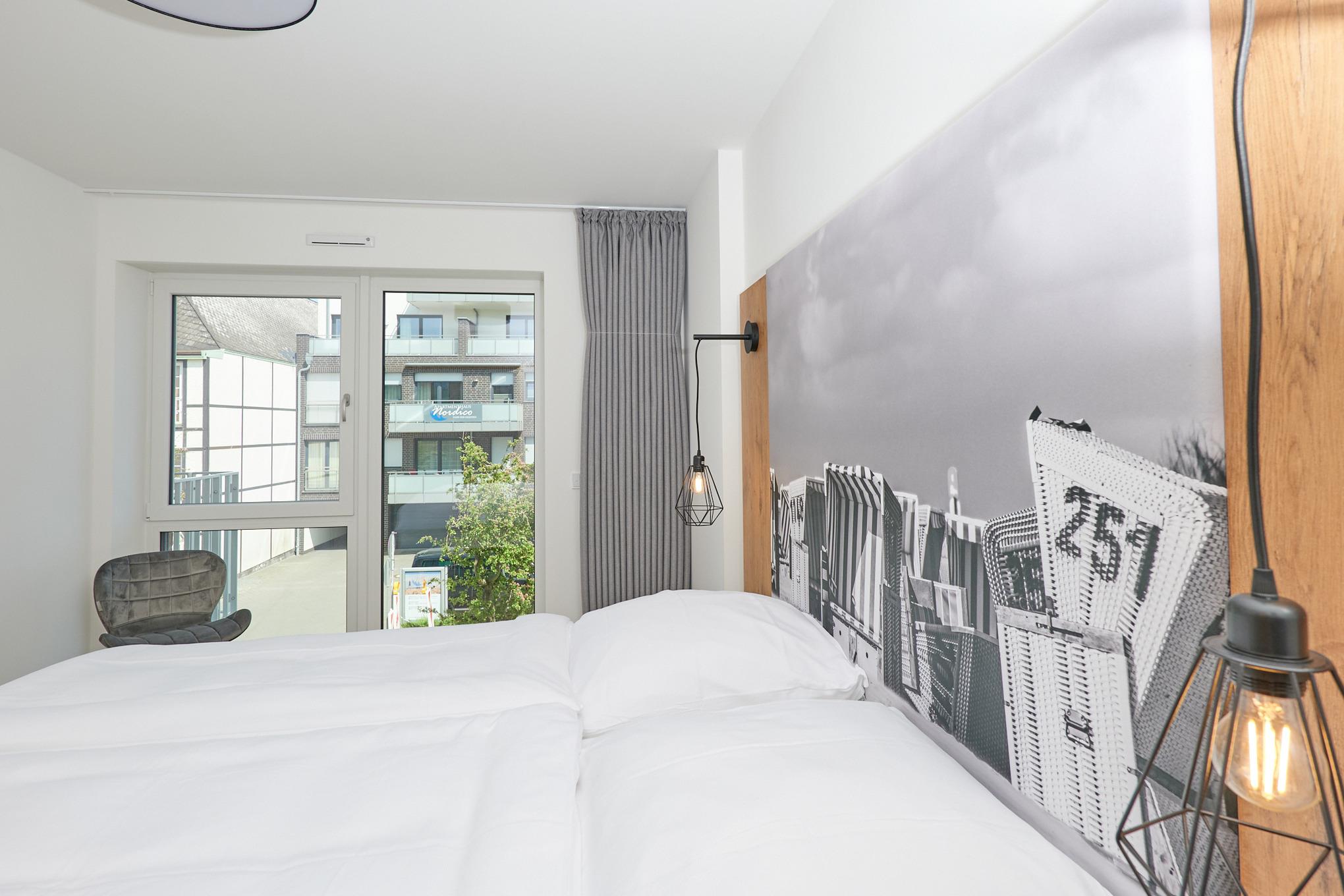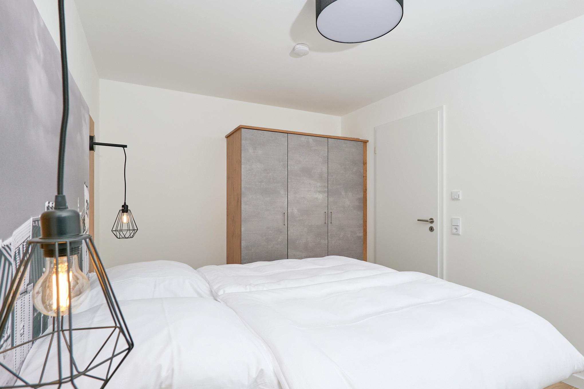 Neubau Mai 2023! Sehr schöne, moderne 3-Raum-Wohnung bis 4 Pers. voll ausgestattet auf ca. 73 m² in der 2.Etage gelegen, 2 Schlafzimmer mit komfortablen Doppelbetten (Bettwäsche inkl.) und Außenjalousien an allen Fenstern, ebenerdige Dusche/WC, Wohnzimmer mit großer Küchenzeile (Backofen, Geschirrspüler, Mikrowelle), 3x Kabel-TV, Radio, kostenfreies W-LAN-Internet, kleiner Balkon (ost) mit Teilseesicht, Personenaufzug, reservierter Pkw-Stellplatz in der Tiefgarage inkl., es sind keine Haustiere erlaubt und natürlich Nichtraucher. Durchfahrtshöhe Tiefgarage: 2,05m.