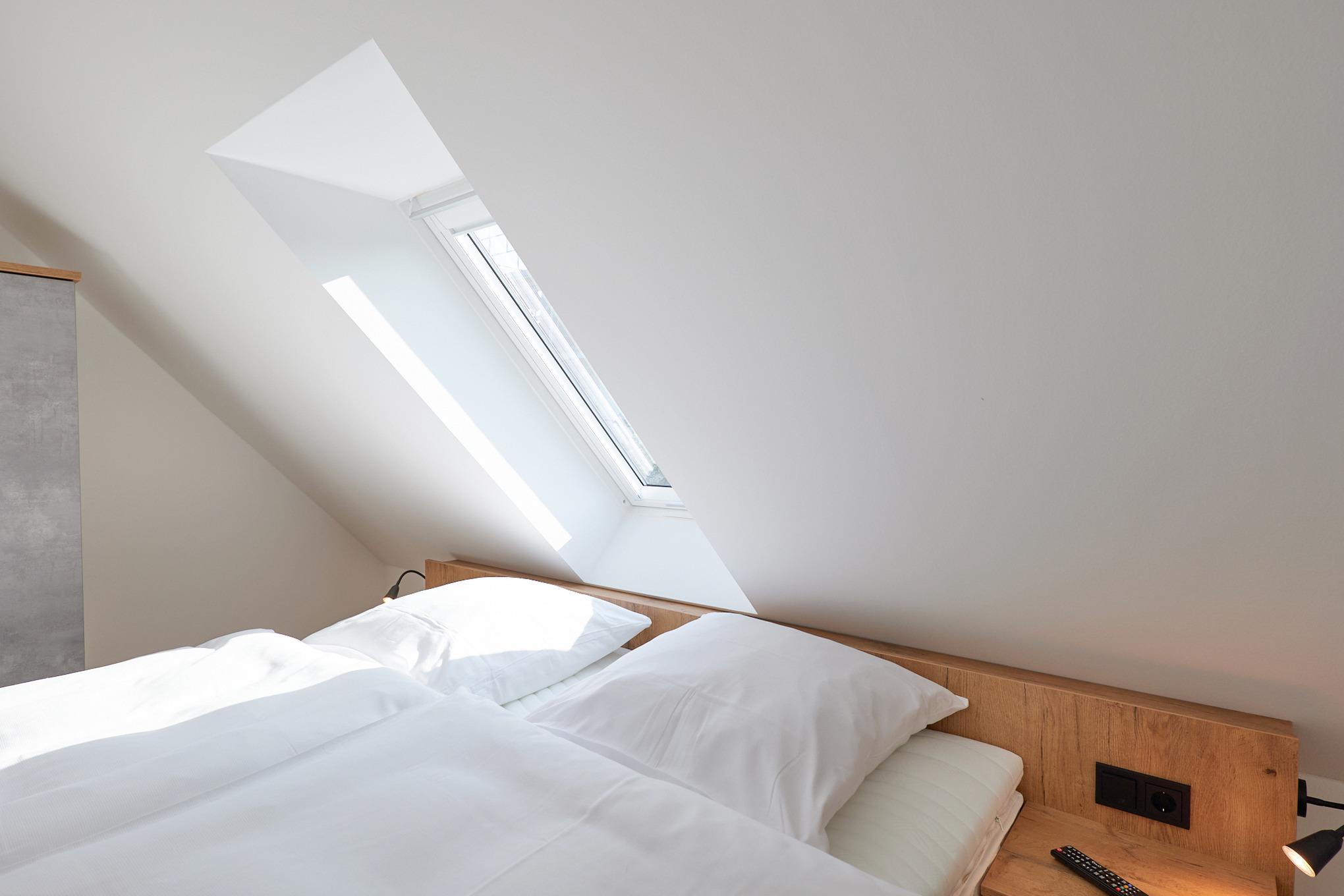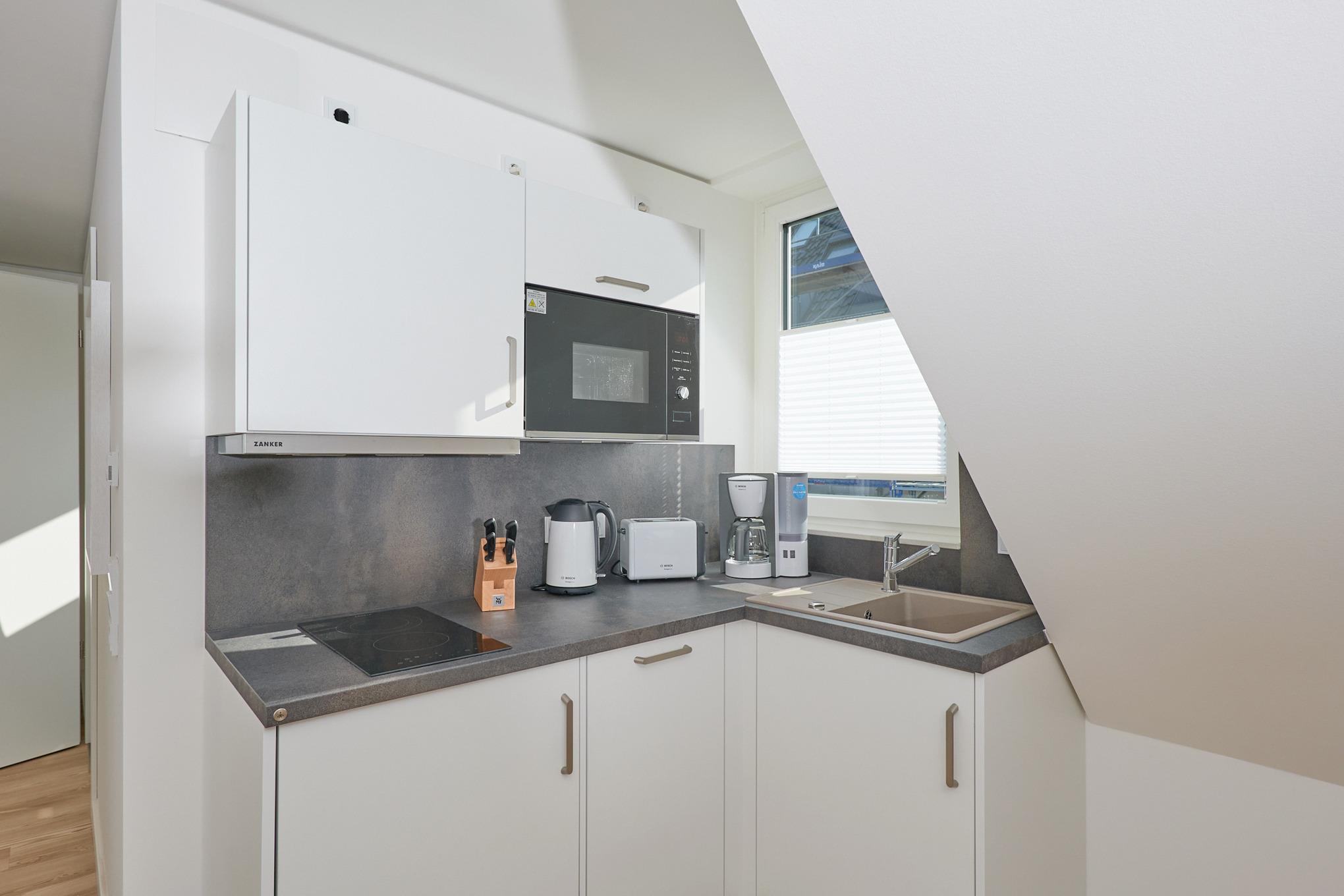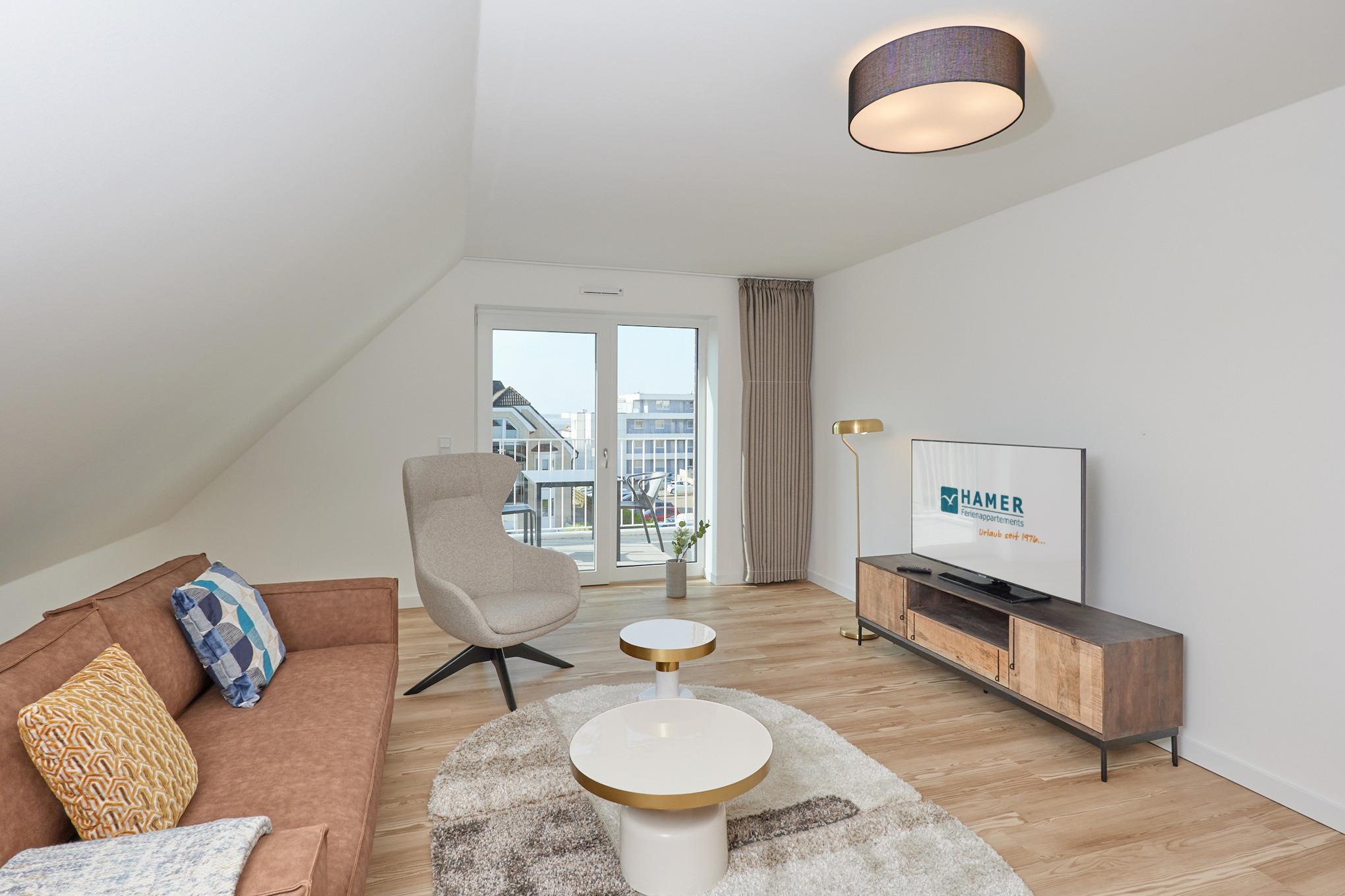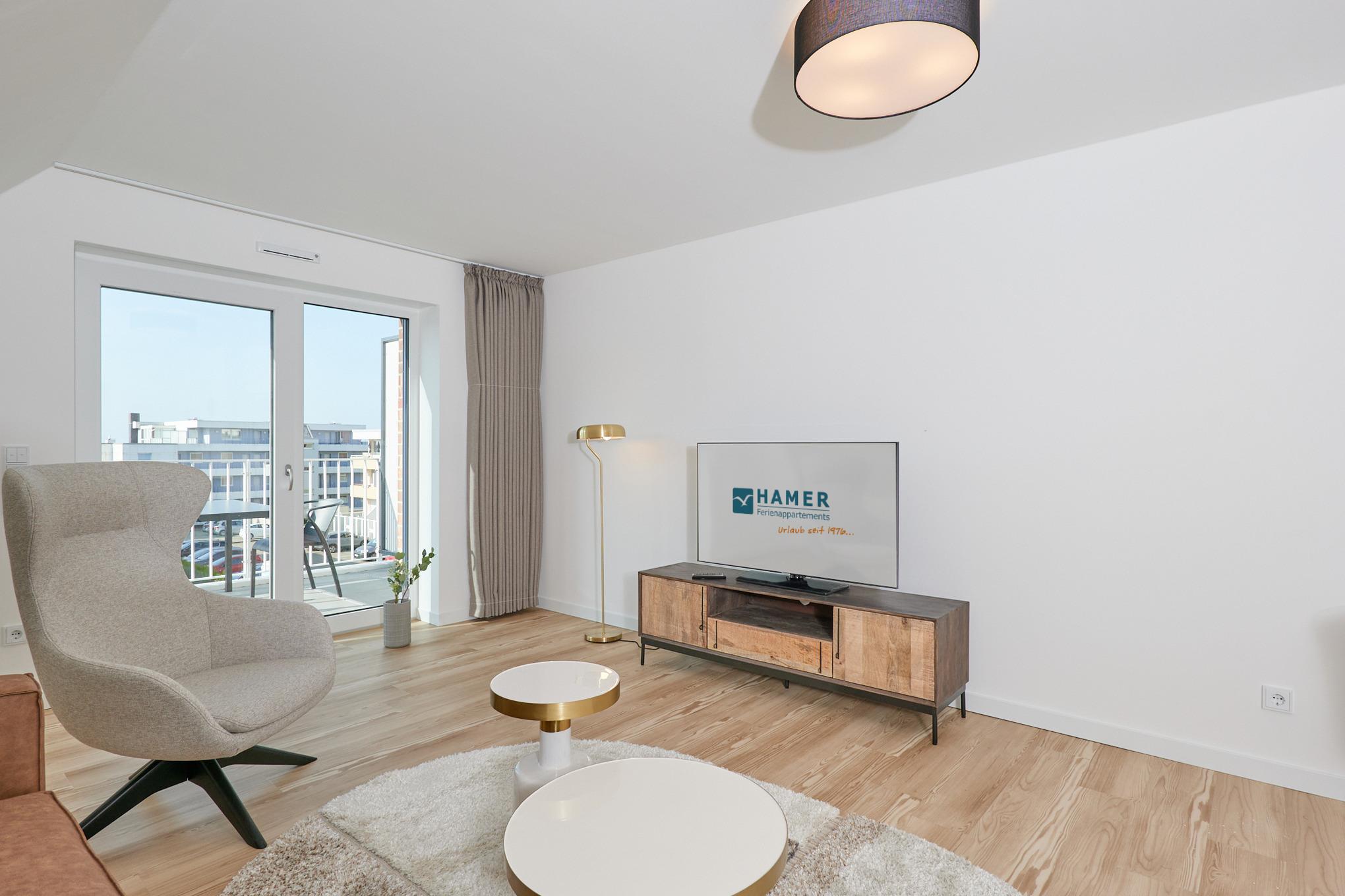 Neubau Mai 2023! Sehr schöne, moderne 2-Raum-Wohnung bis 2 Pers. voll ausgestattet auf ca. 49 m² in der 3.Etage gelegen, 1 Schlafzimmer mit komfortablen Doppelbett (Bettwäsche inkl.) und Außenjalousien an allen Fenstern (Veluxfenster mit Rollo innen), ebenerdige Dusche/WC, Wohnzimmer mit Küchenzeile (2 Platte, Mikrowelle/Backkombi, Geschirrspüler) 2x Kabel-TV, Radio, kostenfreies W-LAN-Internet, großer Balkon mit Teilseesicht (nord/west), beide Zimmer mit Dachschrägen, Personenaufzug, die Wohnung ist barrierefrei erreichbar, reservierter Pkw-Stellplatz in der Tiefgarage inkl., es sind keine Haustiere erlaubt und natürlich Nichtraucher. Durchfahrtshöhe Tiefgarage: 2,05m.