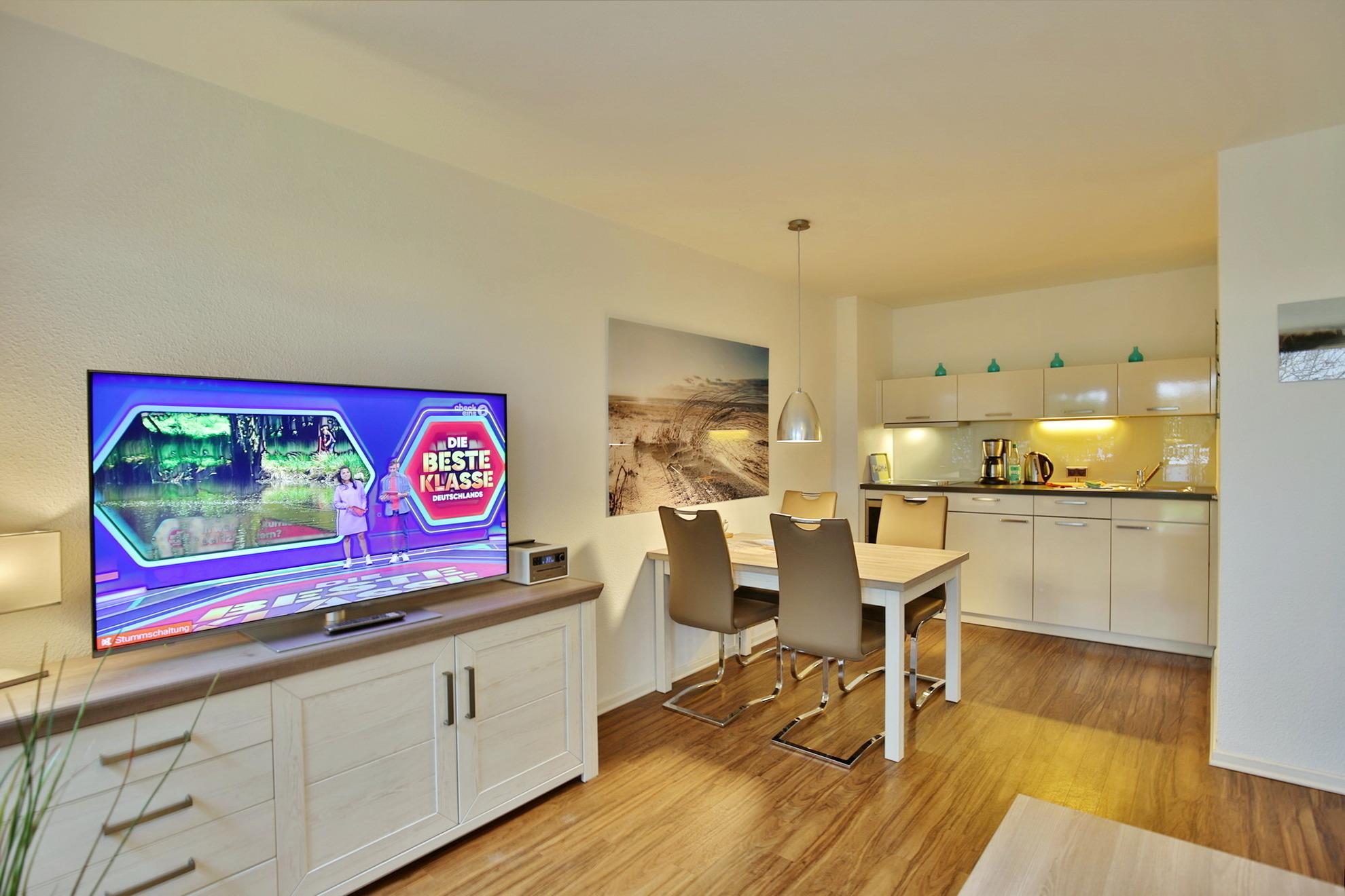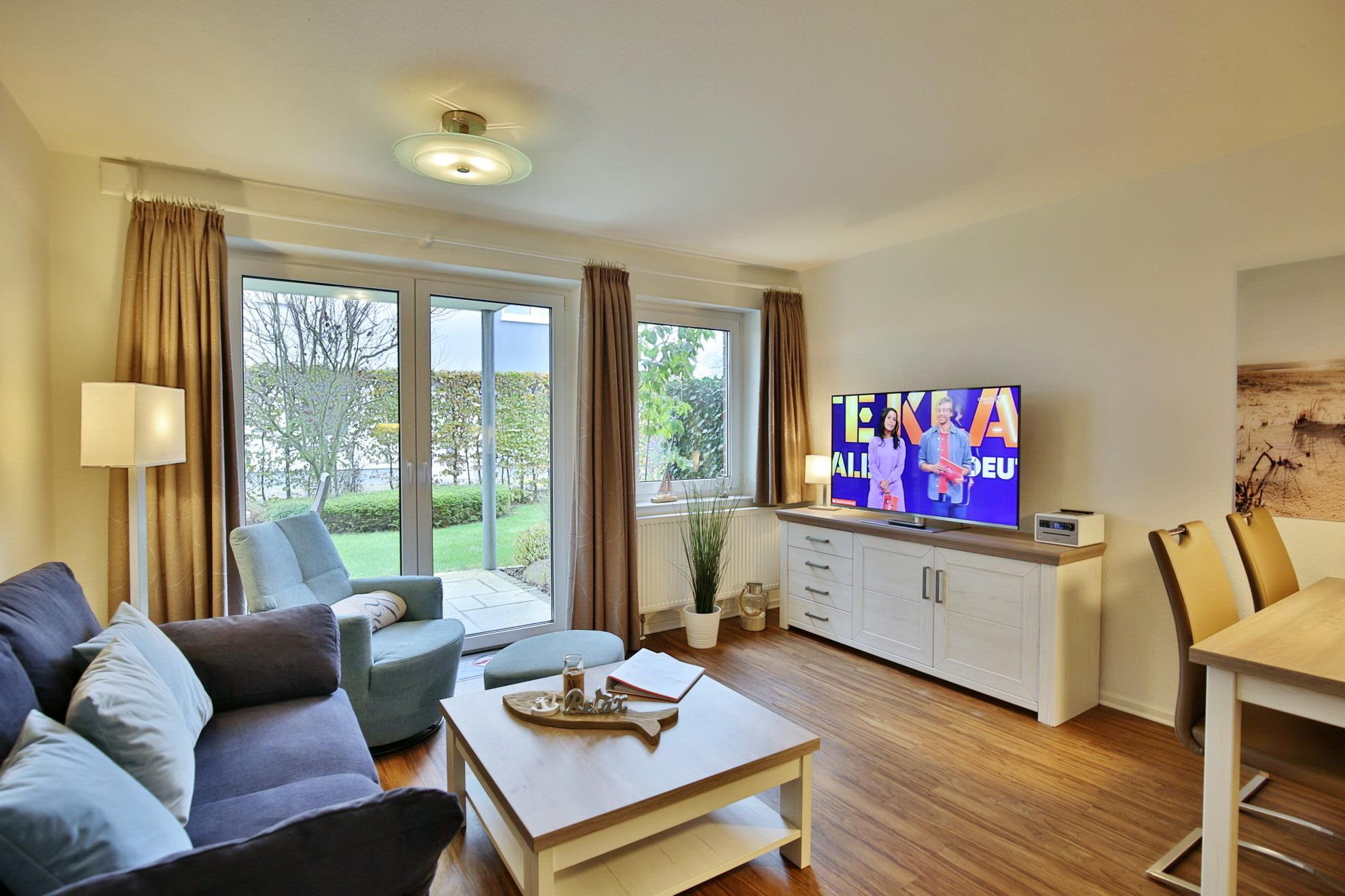 Sehr schöne u. vollständig ausgestattete Wohnung auf ca. 46m² bis 3 Pers., parterre mit großer Terrasse und Rasenanteil (süd), 1 Schlafzimmer mit Doppelbett u. TV, Wohn-/Schlafzimmer mit Schlafcouch, 2x SAT-TV, W-LAN kostenlos., vollständige Küchenzeile mit Geschirrspüler, Mikrowelle-Backofen Kombigerät, Gefrierfach, Dusche/Wc, alle Räume mit Rollladen, Pkw-Stellplatz #2, Nichtraucher, keine Haustiere gestattet.