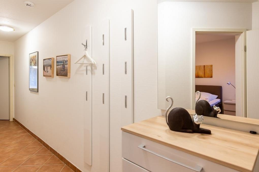 2-Raum-Parterrewohnung mit ca. 52m². Komplett ausgestattet bis 4 Pers. Wohnzimmer mit Küchenzeile vollausgestatter Küchenzeile (Geschirrspüler, Backofen etc.), Doppelbettcouch und Zugang zur Terrasse (west), Kabel-TV, W-Lan kostenfrei. 1 Schlafzimmer mit Doppelbett [&] TV, Du/WC, keine Haustiere, Nichtraucher, reservierter Pkw-Stellplatz #13 vor dem Haus.