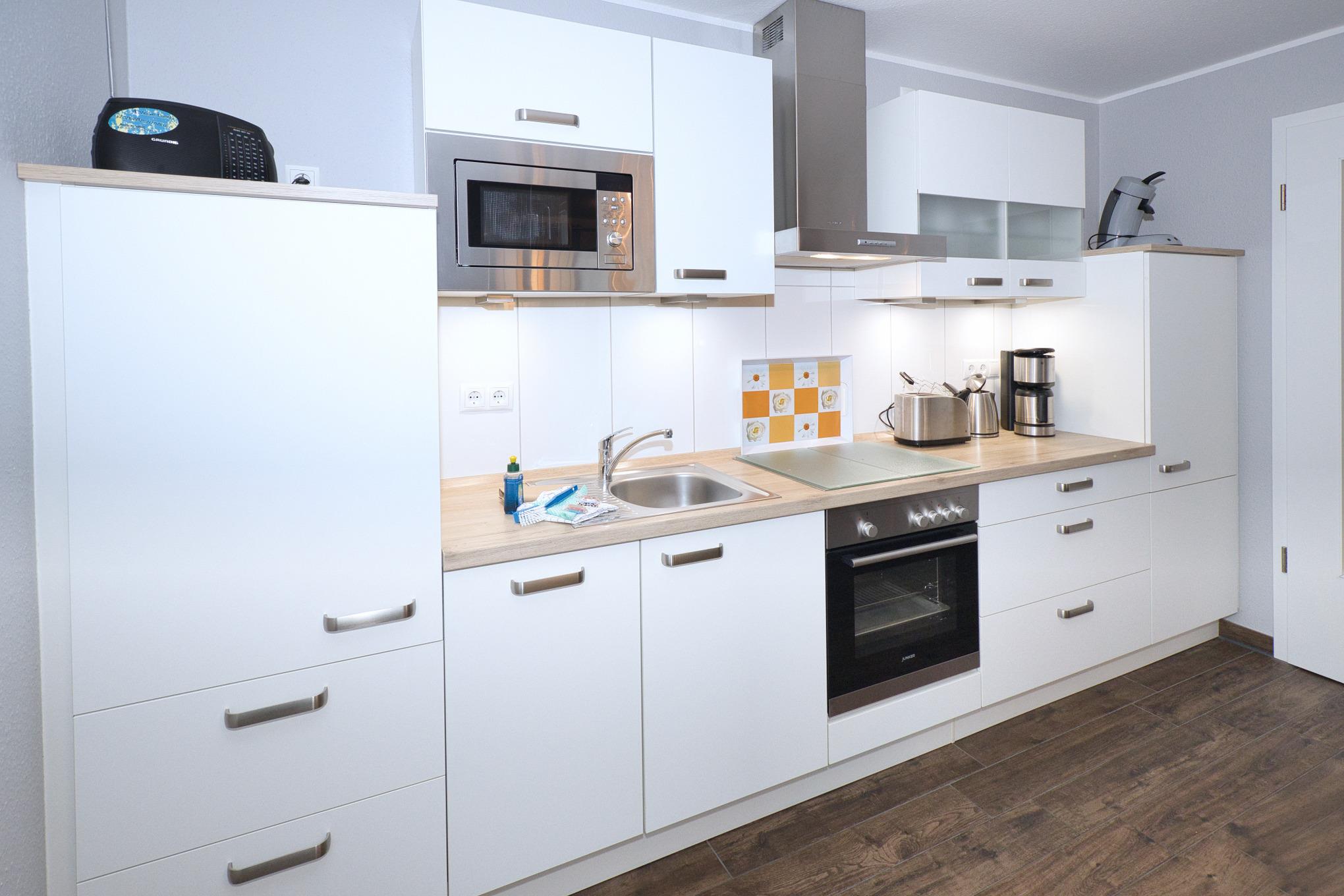 In der komfortablen, vollausgestatteten Einbauküche, die sich direkt am Fenster mit Seeblick im Wohnzimmer befindet, können Sie Ihre kulinarischen Fähigkeiten entfalten. Ein Esstisch lädt zum gemütlichen Beisammensein ein. Im Wohnbereich können Sie in einem Relaxsessel entspannen und sich von Radio, DVD-Player und Flachbildfernseher unterhalten lassen.