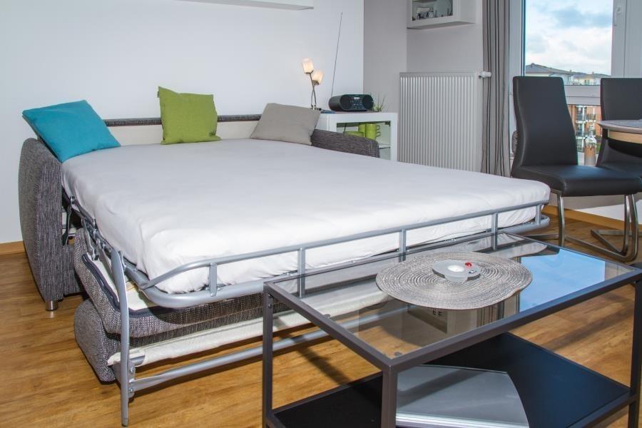 Das lichtdurchflutete Wohnzimmer lädt zum Entspannen ein und verfügt über eine gemütliche Couch mit einem Funktionssofa, das sich bei Bedarf zu einem komfortablen Bett mit Lattenrost und Matratze (140x200) verwandeln lässt. Hier finden Sie auch einen bequemen Sessel und einen Essplatz, von dem aus Sie die Aussicht genießen können. Die offene Küchenzeile ist mit einem Geschirrspüler ausgestattet und bietet Ihnen alles, was Sie für die Zubereitung Ihrer Lieblingsspeisen benötigen.