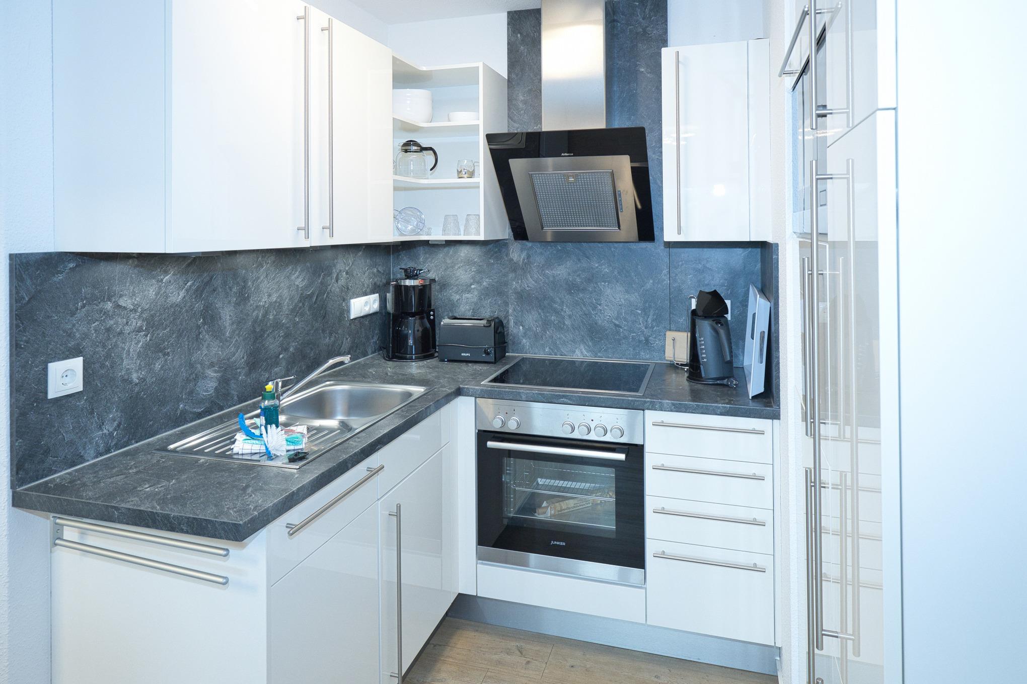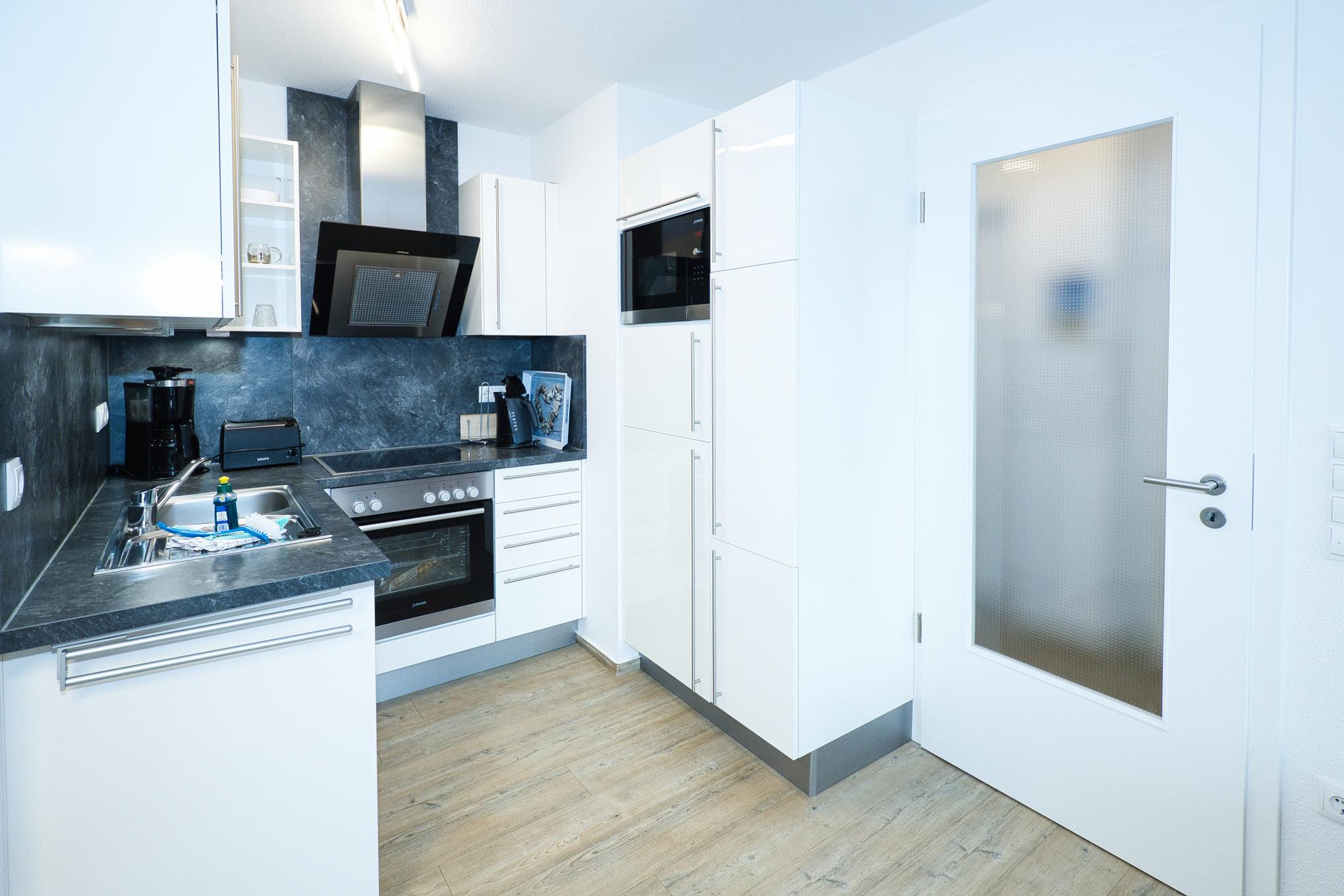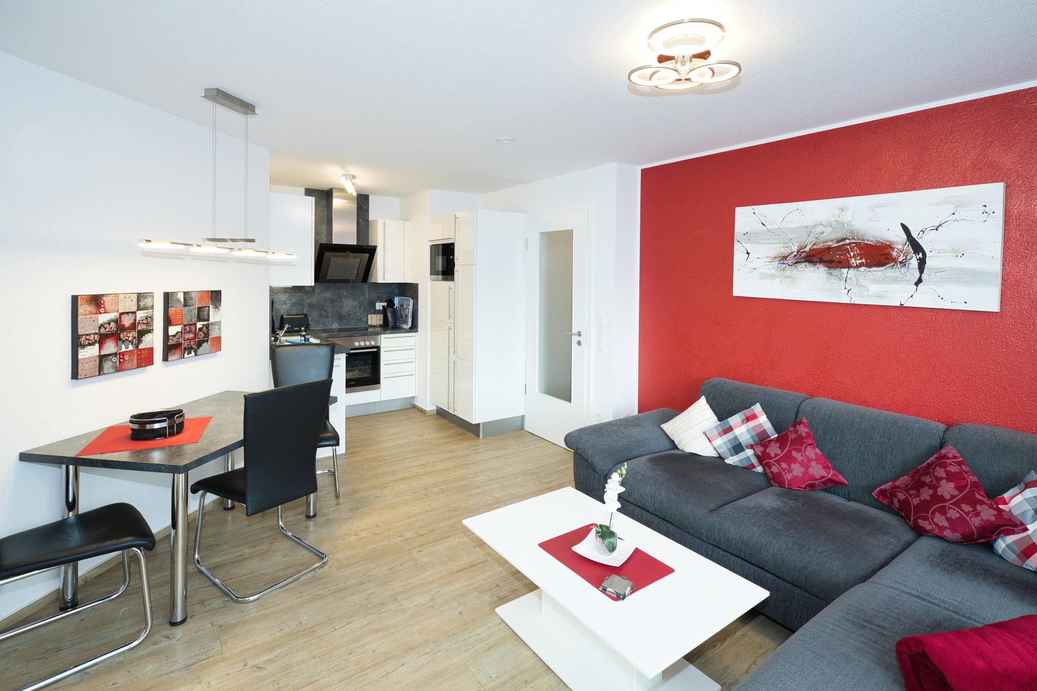 Mit einer Größe von 45m² bietet das 2-Zimmer Appartement ausreichend Platz für erholsame Ferien. Das komfortable Wohnzimmer lädt zum Verweilen ein und verfügt über einen offenen Küchenbereich. Die Küche ist mit modernen Annehmlichkeiten wie Geschirrspüler, Backofen, Ceran-Kochfeld, Mikrowelle, Kaffeemaschine und allen notwendigen Küchenutensilien ausgestattet. Hier können Sie sich problemlos selbst versorgen. Eine Essecke ist ebenfalls vorhanden. Für zusätzliche Schlafmöglichkeiten steht eine Schlafcouch für eine Person zur Verfügung.