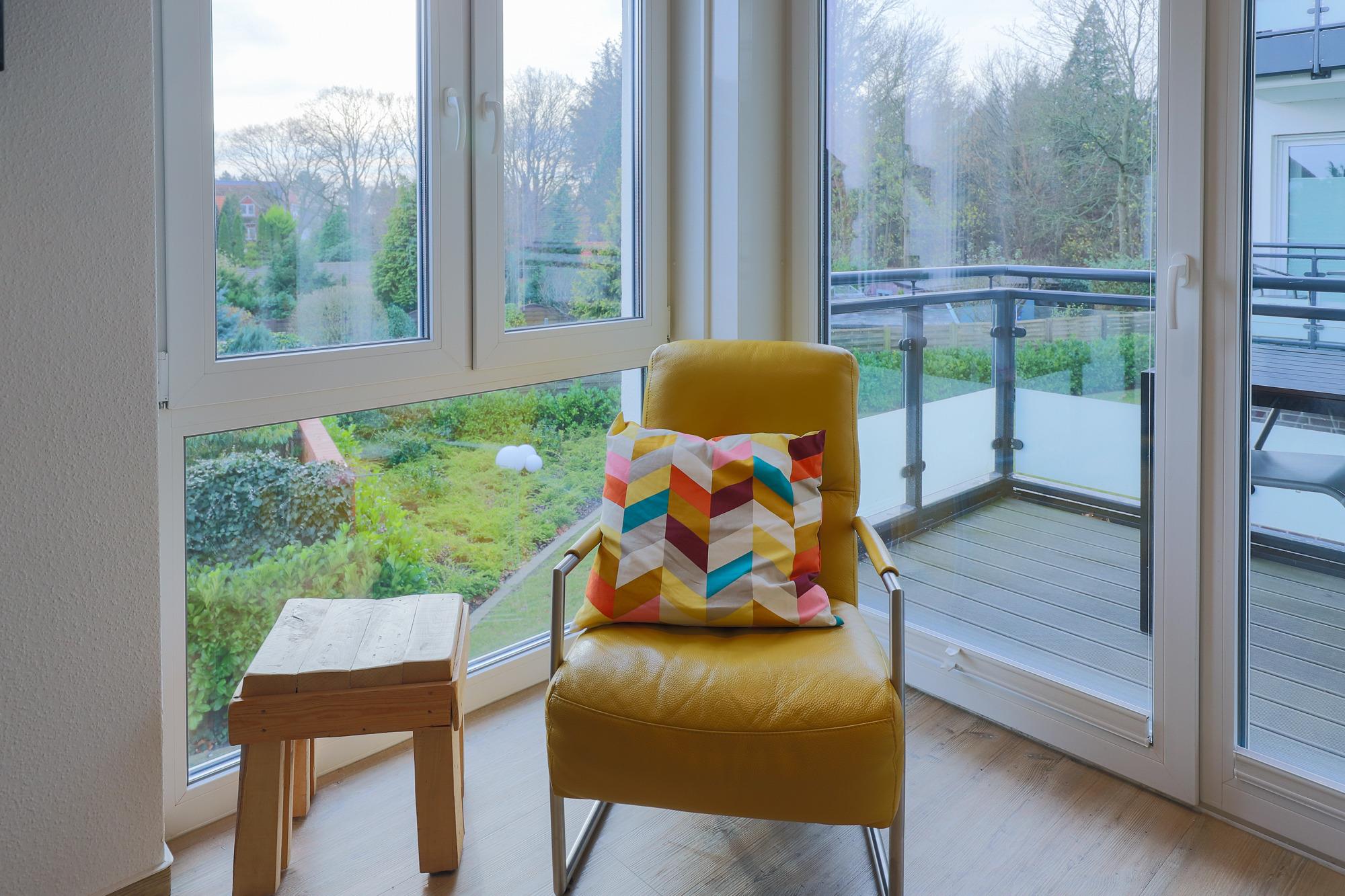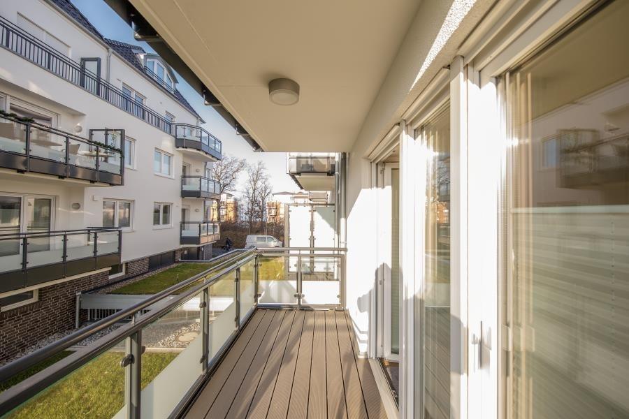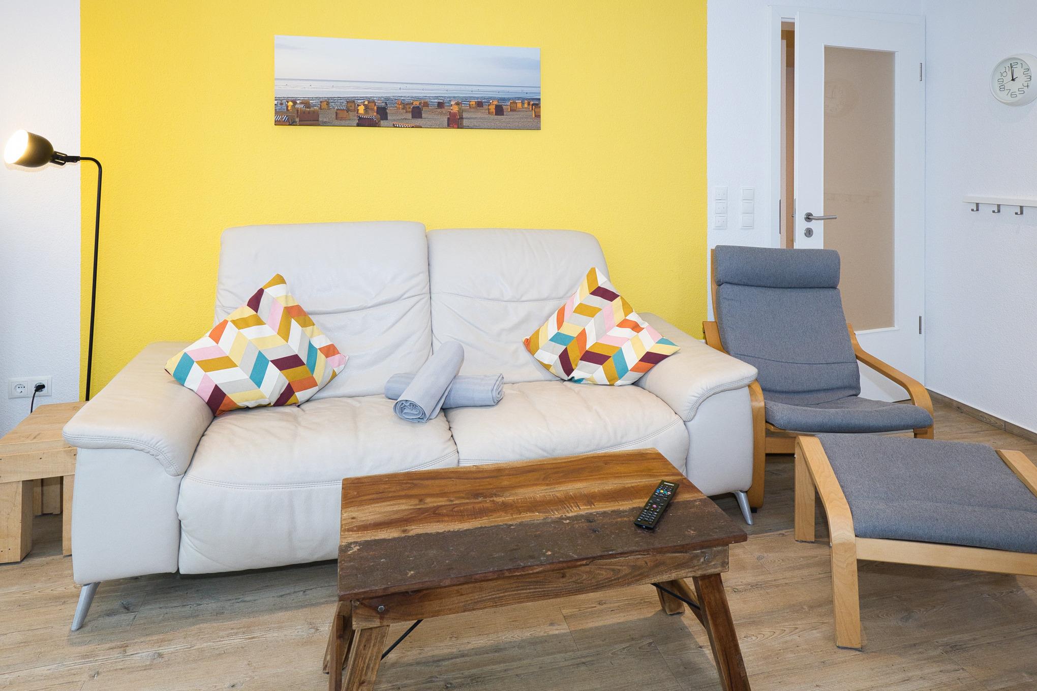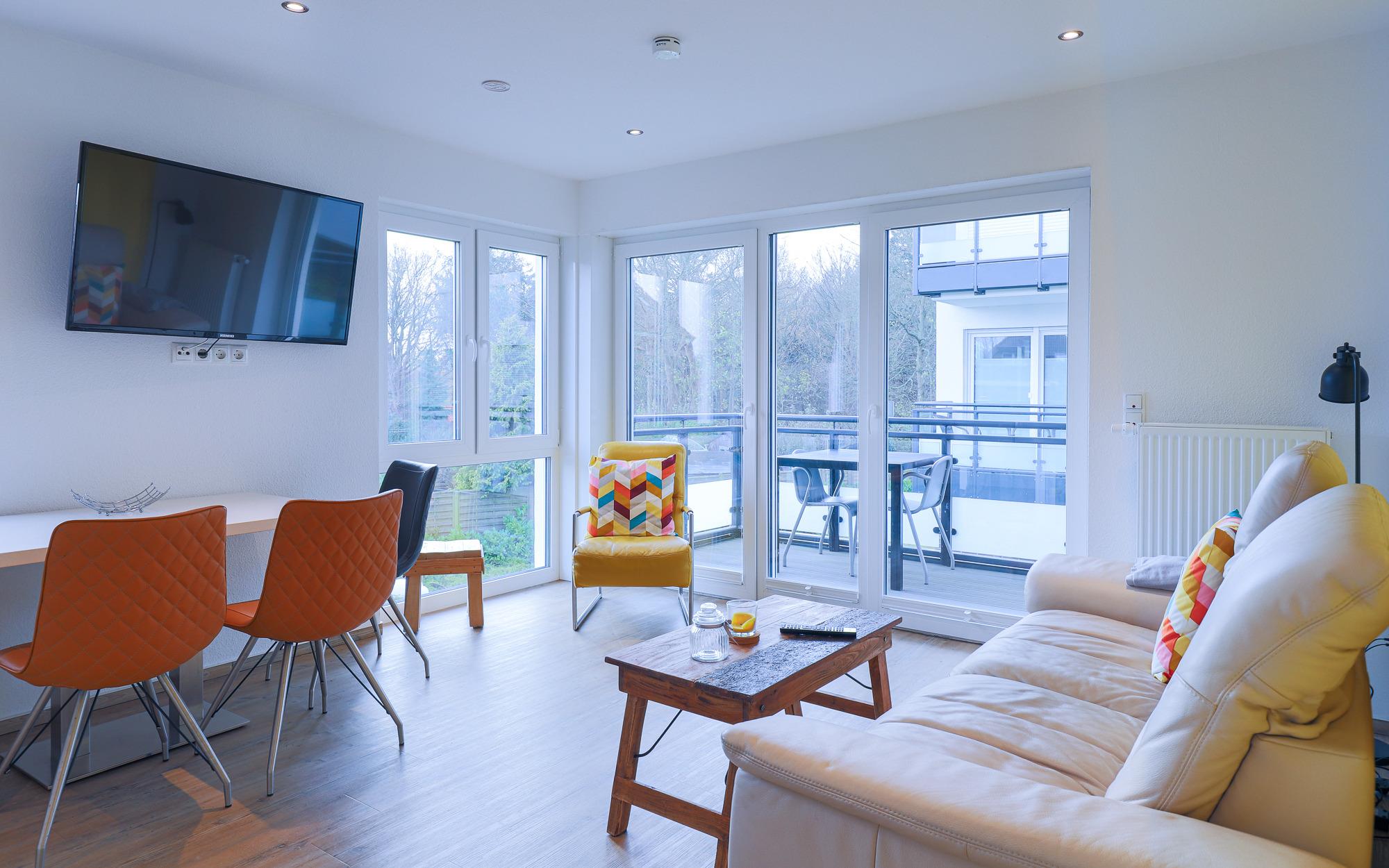 Der Wohn-, Ess- und Küchenbereich der Wohnung ist nicht nur hell, sondern auch gemütlich und geschmackvoll eingerichtet. Hier können Sie sich nach einem ereignisreichen Tag am Strand oder bei Ausflügen wunderbar entspannen. Vom Wohnbereich gelangen Sie zudem auf den großartigen Balkon, der mit komfortablen Sitzmöbeln ausgestattet ist. Genießen Sie hier die frische Nordseeluft und lassen Sie Ihre Seele baumeln.