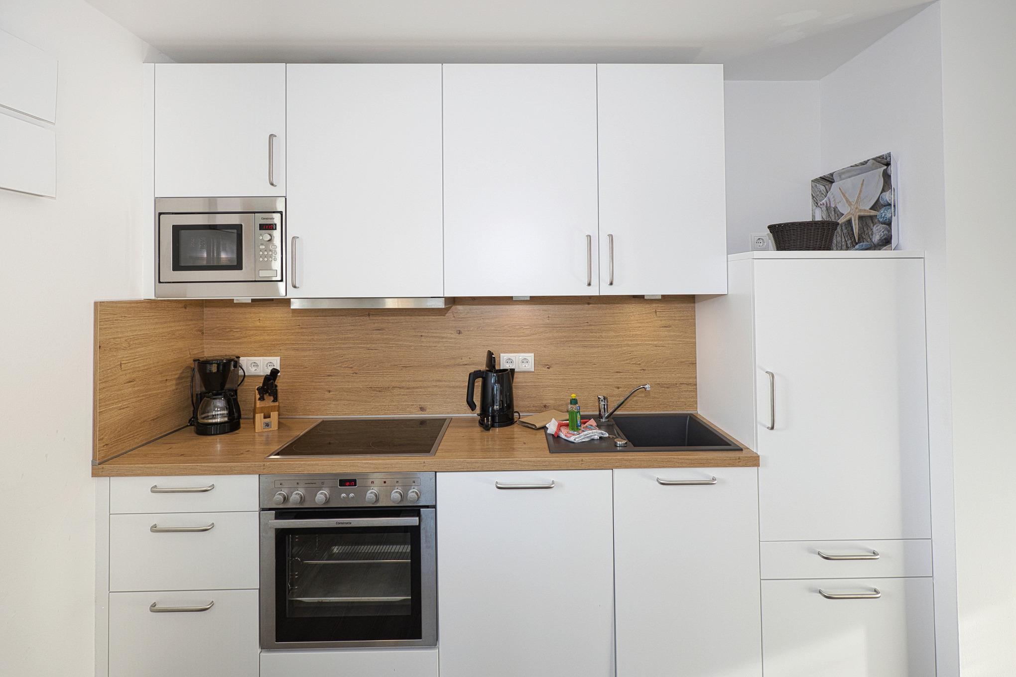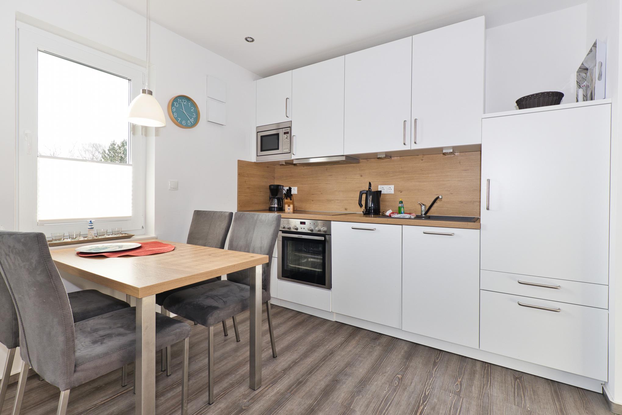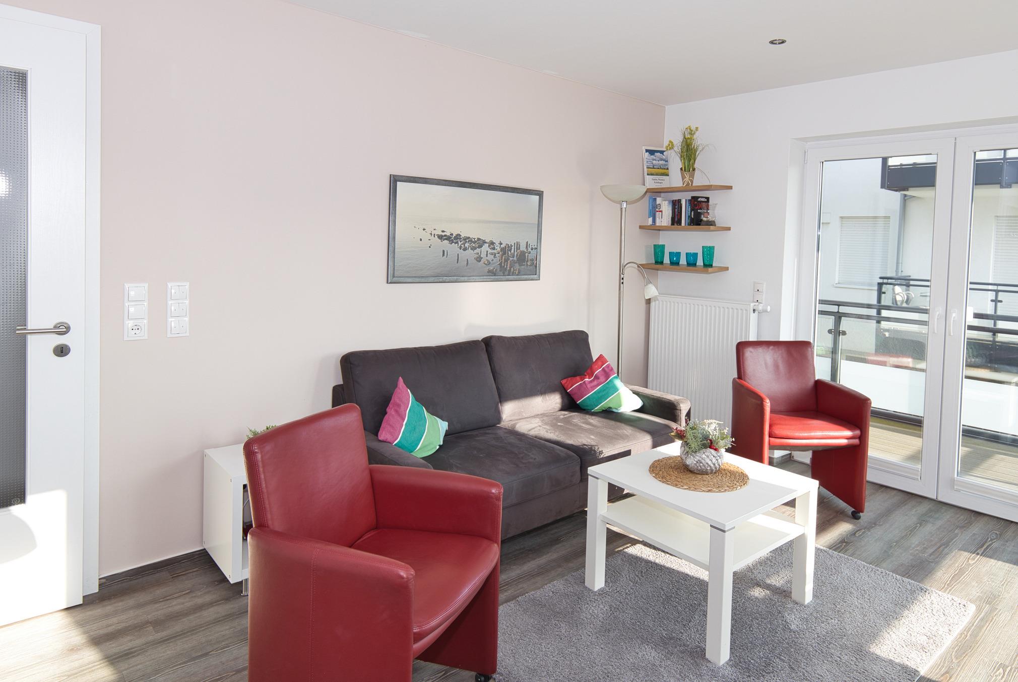 Die Wohnung befindet sich in der 1. Etage des Hauses Steuerbord und ist bequem mit dem Fahrstuhl erreichbar. Barrierefreiheit ist bei uns selbstverständlich. Der Wohn-, Ess- und Küchenbereich erwartet Sie mit einer hellen, gemütlichen Atmosphäre und stilvollen Möbeln. Von hier aus gelangen Sie auf den großzügigen Balkon, der mit bequemen Sitzmöbeln ausgestattet ist und Ihnen einen entspannten Platz im Freien bietet.
