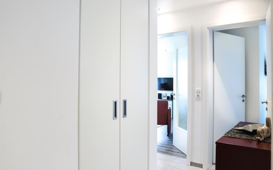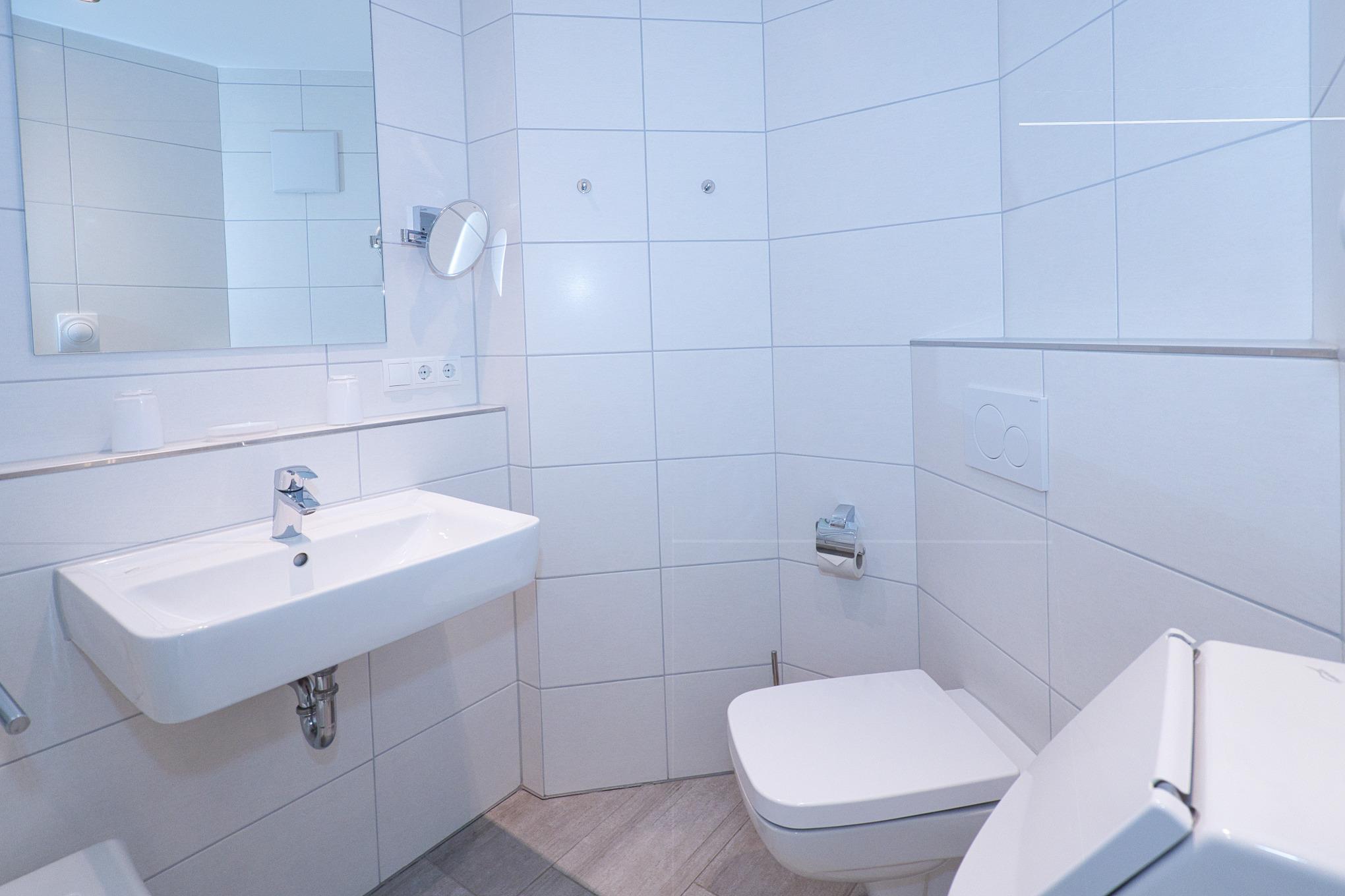 Das Badezimmer verfügt über eine Dusche, ein WC und ein Urinal. Ein ebenerdiger Doppelgaragenstellplatz mit großzügigen Maßen von 2,75 m Breite und 190 cm Höhe gehört zur Wohnung. Des Weiteren stehen Ihnen ein abschließbarer Fahrradabstellplatz im Keller sowie weitere im Außenbereich zur Verfügung.