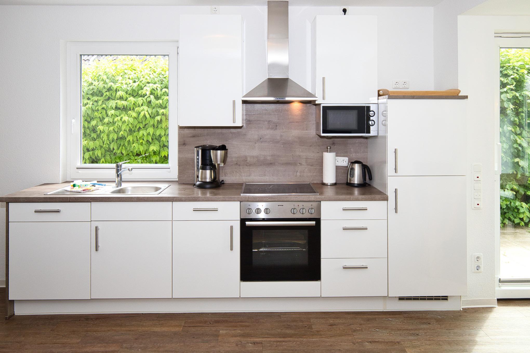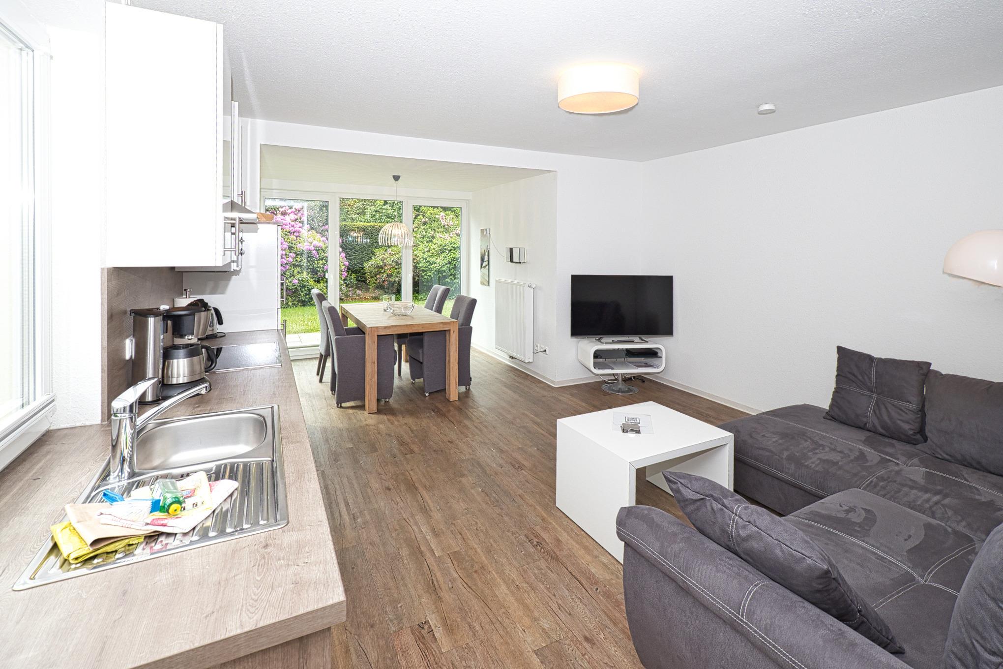 2 Zimmer Ferienwohnung am Grooten Steen 14 in Cuxhaven-Duhnen. Es erwartet Sie hier eine geschmackvolle, moderne und barrierefreie 2-Raum Ferienwohnung im Erdgeschoss mit Süd-Terrasse und Gartenanteil. Auf die Terrasse gelangen sie über den Wohn-/ Ess- und Küchenbereich. Dieser ist großzügig aufgeteilt und bietet Platz für bis zu 4 Personen. Eine große Glasfront am Essplatz zum Garten hin bietet Wintergartenatmosphäre. Eine 3. und 4. Person finden Platz auf der Schlafcouch. Die Küche ist komplett ausgestattet. Das ebenfalls geräumige Schlafzimmer ist mit einem komfortablen Boxspring Doppelbett und genügend Stauraum ausgestattet. Ein Wasch- und Trockenraum, mit Waschmaschine und Trockner steht Ihnen ebenfalls zur Verfügung.