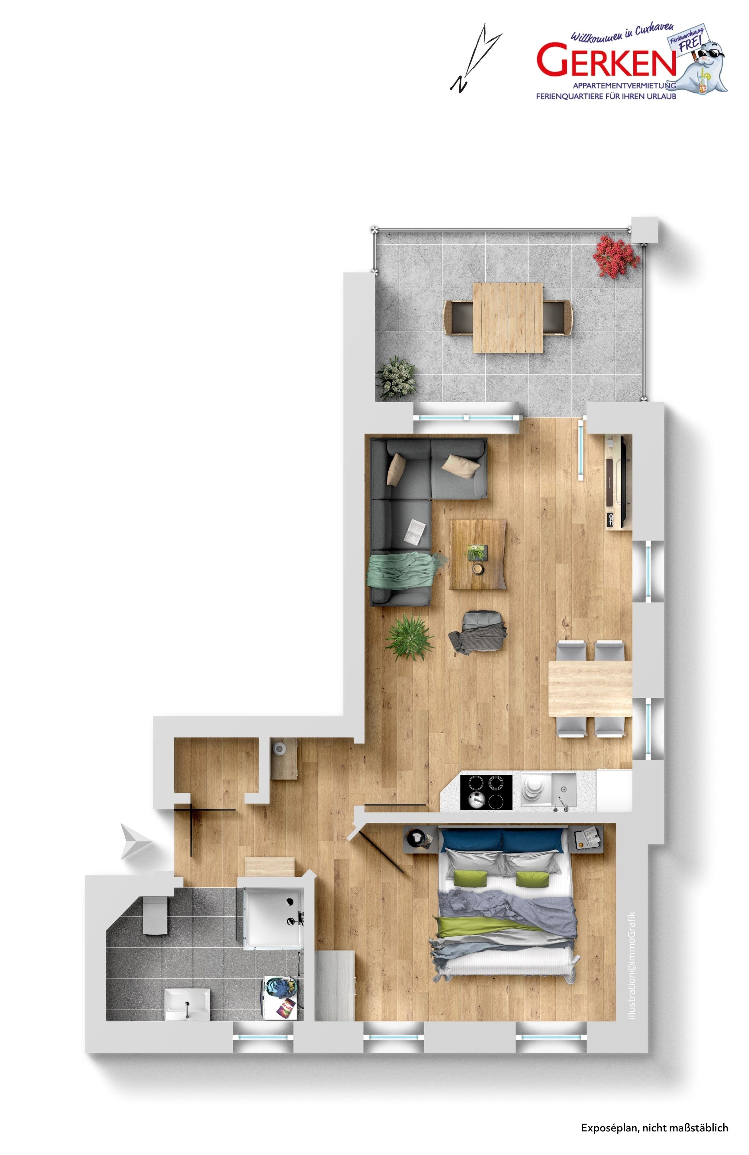 Die Terrasse lädt zum Verweilen ein, während Sie die frische Nordseeluft genießen. Der Name Ankerplatz ist hier Programm: Liebevolle Dekoration und beeindruckende Außenaufnahmen von Duhnen bringen das maritime Lebensgefühl direkt in Ihr Feriendomizil.