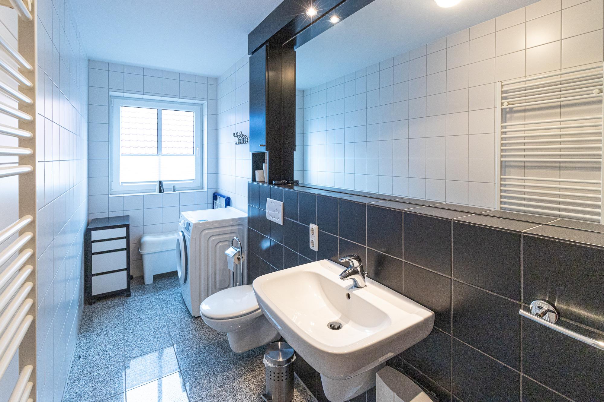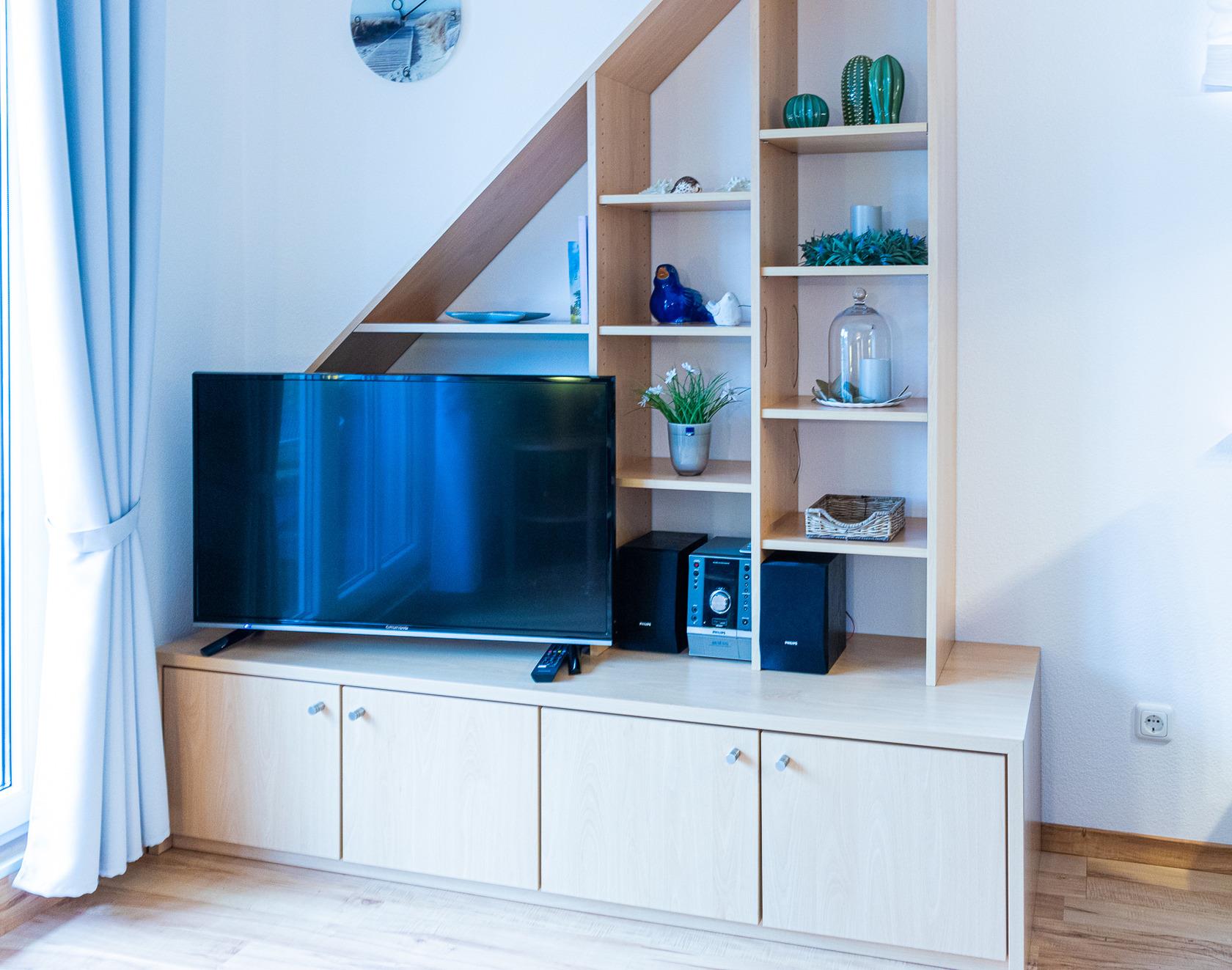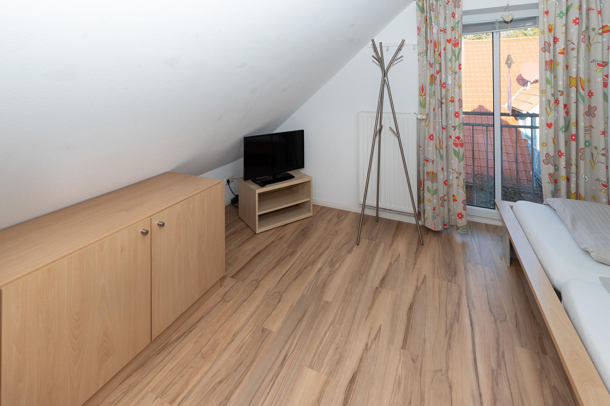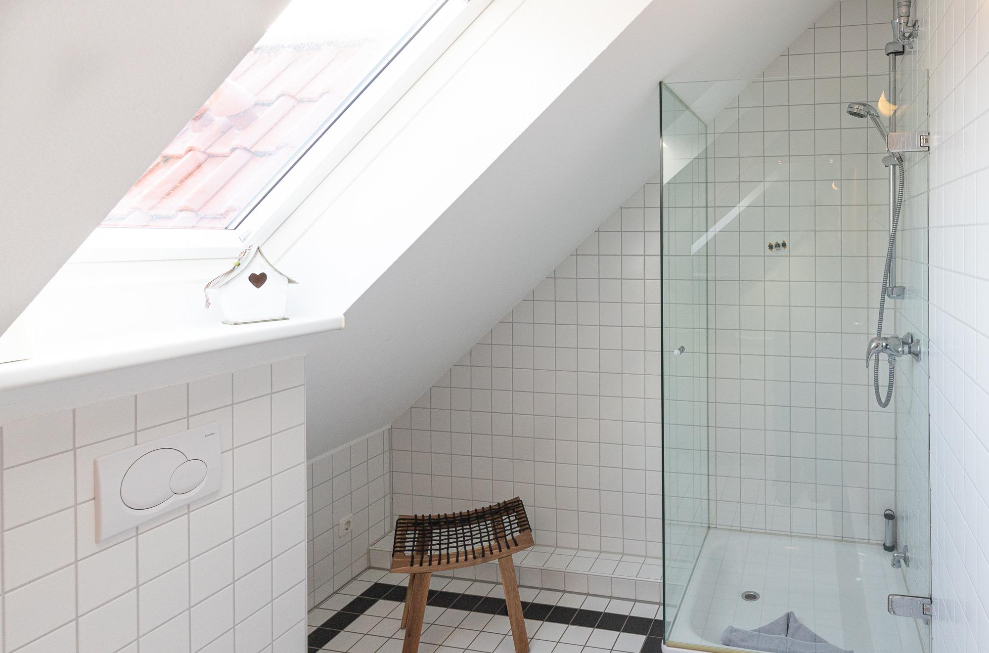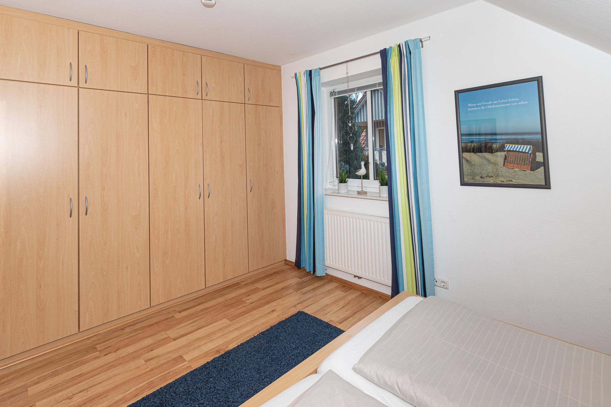 Im 1. OG kommen Sie über den Flur direkt in den hellen Wohn- und Essbereich mit einer gut ausgestatteten Einbauküche, einem Essbereich für 4 Personen und dem Zugang zum Balkon. Eine mobile Tischleuchte, mit WiFi Speaker und Bluetooth Lautsprecher lässt Sie Ihre eigenen Musiklisten abspielen. Vom Flur aus gelangen Sie in das große Duschbad mit WC und Waschmaschine, sowie ins Schlafzimmer mit Doppelbett und einem großen Kleiderschrank. Vom Wohnbereich, mit einer gemütlichen und hochwertigen Eckcouch und einem TV Sessel, führt Sie eine gut begehbare Holztreppe ins Dachgeschoss. Hier befindet sich ein kleineres Schlafzimmer mit einem Doppelbett. Ebenfalls befindet sich auf dieser Etage ein 2. Duschbad mit WC. Wir wünschen Ihnen einen schönen Urlaub.