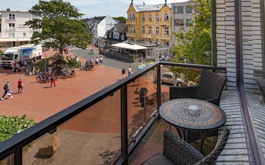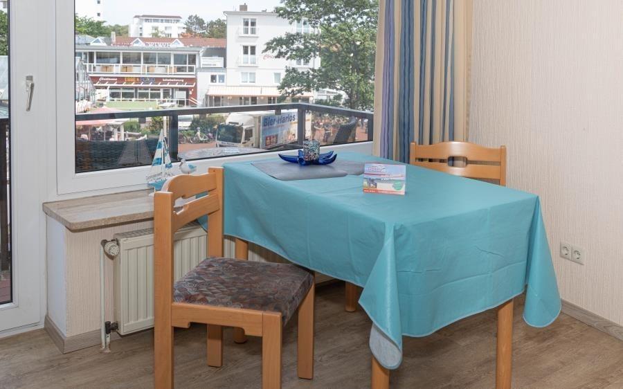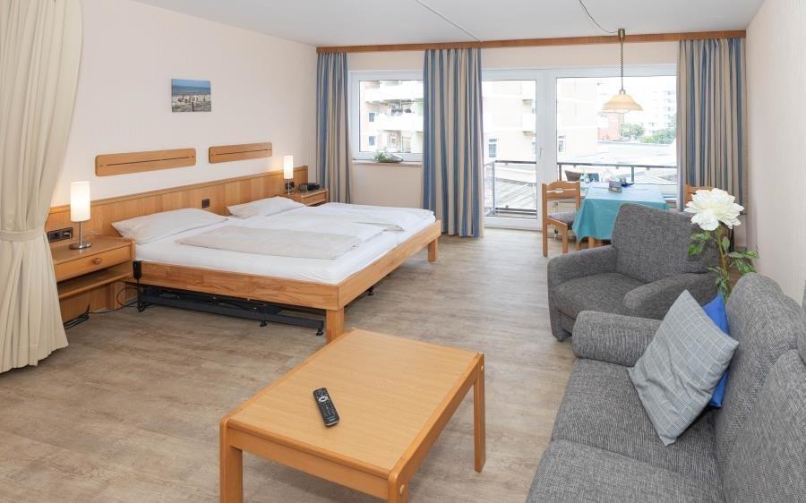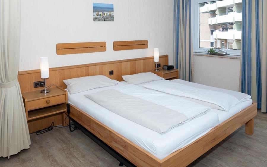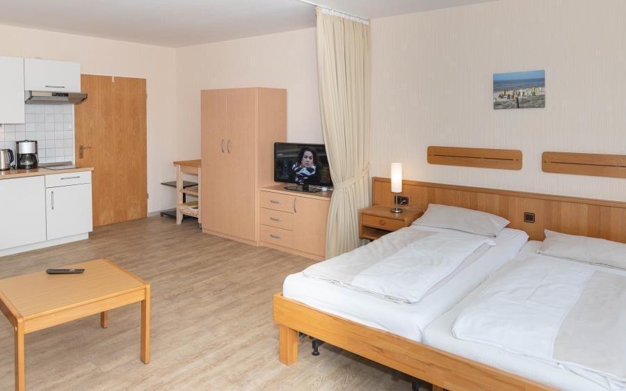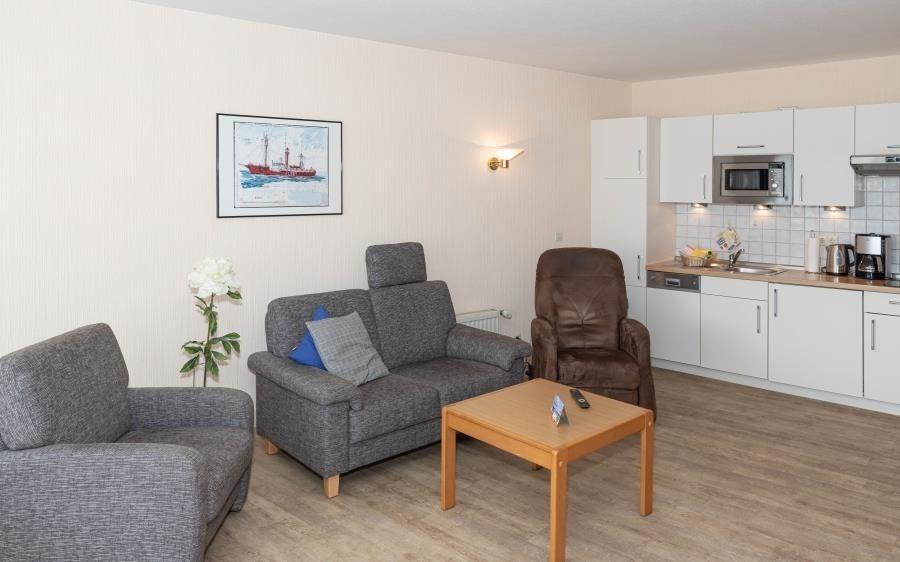 1 Raum Ferienwohnung im Appartementhaus Düne mit Seeblick für bis zu 2 Personen. Barrierefrei und rollstuhlfreundlich: Das Bad ist rollstuhlgerecht und das Haus hat ein Fahrstuhl. Hier erwartet Sie eine gepflegte 1 Zimmer Ferienwohnung mit einem Wohn- (mit Flachbildfernseher und Radio), Ess- und Schlafbereich (die linke Seite vom Doppelbett verfügt über ein Bettenlift, welche bis zu einer Höhe von ca. 68cm plus Matratzenstärke hochgefahren werden kann!). Das Rollstuhlfreundliche Duschbad hat neben der ebenerdigen Dusche, verschiedene Haltegriffe und ein höhenverstellbares Waschbecken. Um mal ein kleines Abendessen zu zaubern, oder um am Morgen gemütlich zu Frühstücken bietet Ihnen de Küchenzeile genügend Ablagefläche und ist ausgestattet mit einem Geschirrspüler, 2 Ceranfeld-Kochplatten, Mikrowelle und einem Kühlschrank mit Gefrierfach. Der Bodenbelag der gesamten Wohnung ist Allergiker freundlich. Vom Balkon (Osten) aus dem 2.OG des Hauses "Appartementhaus Düne" haben Sie eine schöne Sicht auf den Dorfbrunnenplatz und die Nordsee.