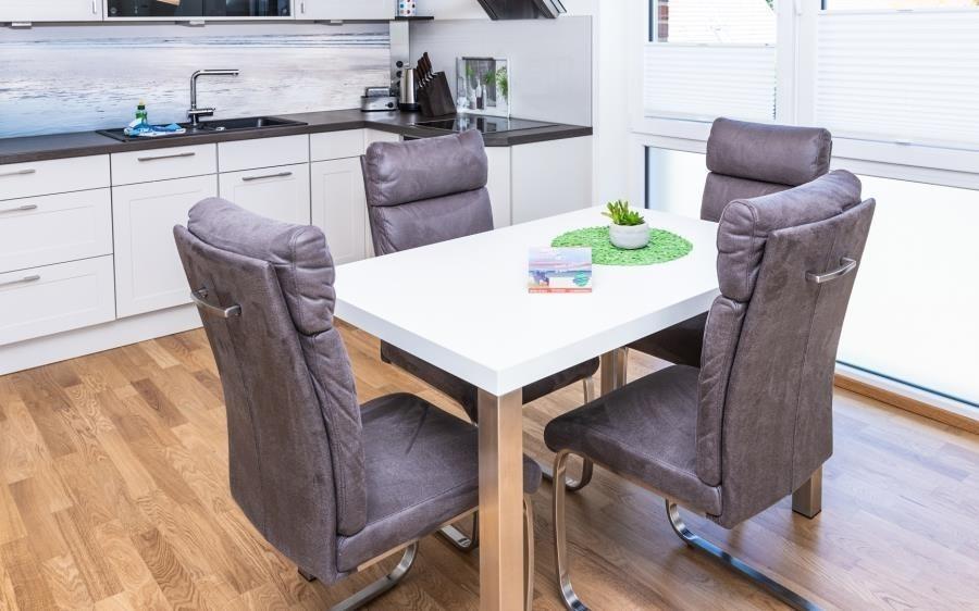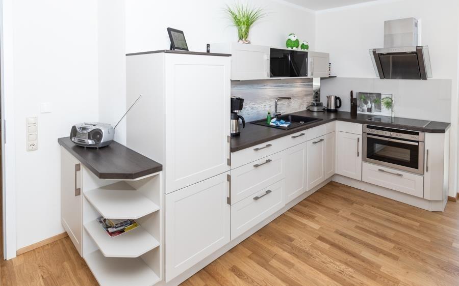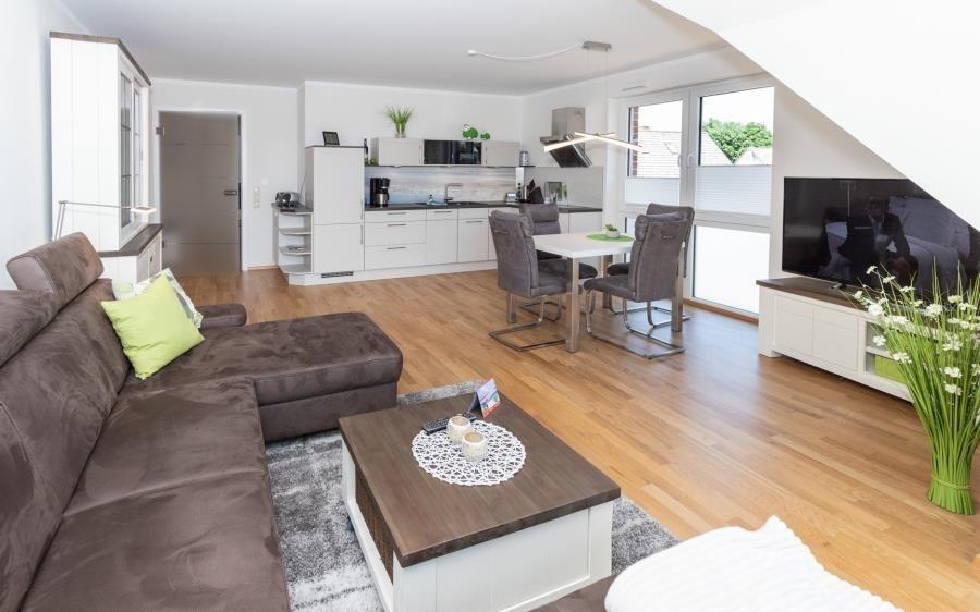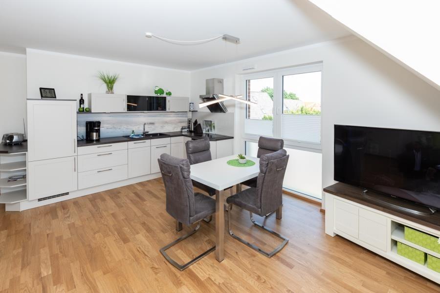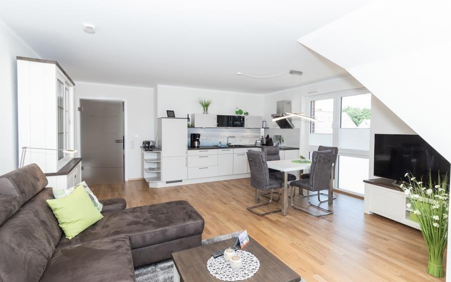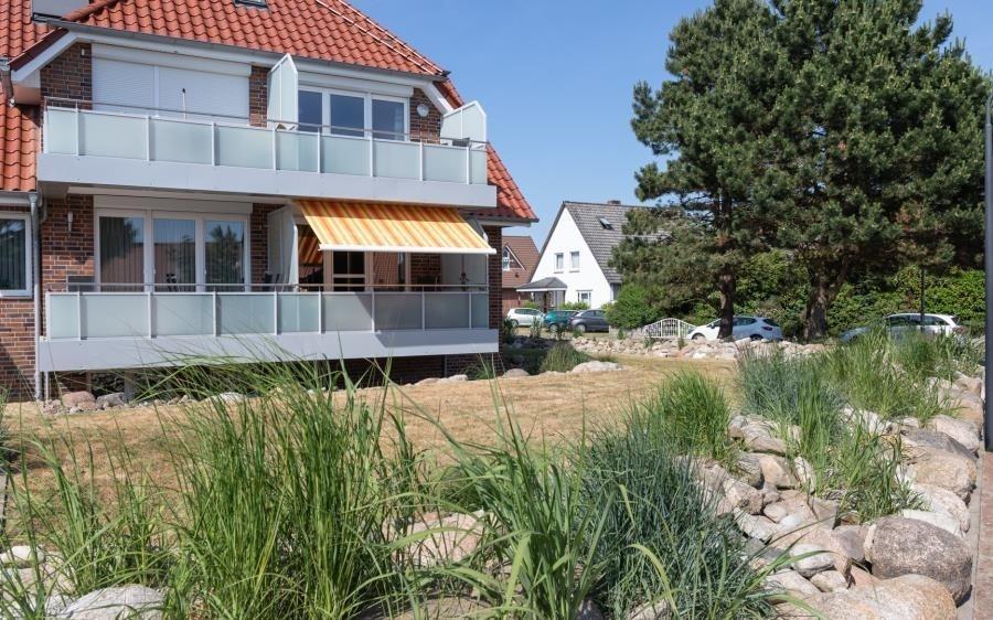 Der Flur führt Sie zu einem elegant gestalteten Badezimmer mit Doppelwaschtisch und Dusche, während die 2 Schlafzimmer Platz für bis zu 4 Personen bieten. Der offene Flur öffnet sich in einen lichtdurchfluteten Wohn- und Essbereich mit traumhaftem Ausblick auf Felder und Wiesen. Der großzügige Südbalkon mit eleganten Balkonmöbeln wird Ihr Herz höher schlagen lassen. Die hochwertige und komplett ausgestattete Einbauküche lädt dazu ein, kulinarische Köstlichkeiten zu zaubern. Die großzügige Gartenanlage, die dem Haus den Namen Dünenflair verleiht, bietet zusätzliche Freiräume für entspannte Stunden. Hier erleben Sie Urlaub in stilvollem Ambiente und können sich auf unvergessliche Tage freuen. Entdecken Sie das Dünenflair und genießen Sie eine Auszeit vom Alltag in dieser großartigen Ferienwohnung. Wir freuen uns darauf, Sie als unsere Gäste begrüßen zu dürfen!