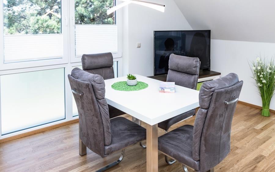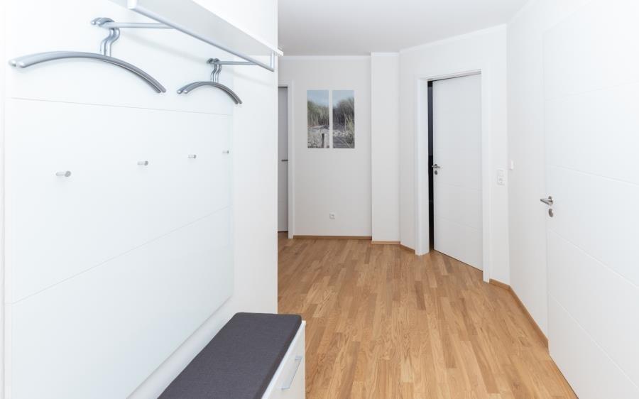 Willkommen im Dünenflair! Hier erwartet Sie eine exklusive 3-Raum Ferienwohnung, Wohnung 5, die mit 81m² großzügigen Komfort bietet. In einem wunderschönen Haus gelegen, betreten Sie die Wohnung im 1. Obergeschoss durch einen geräumigen Eingangsbereich mit Garderobe und einem praktischen Abstellraum.