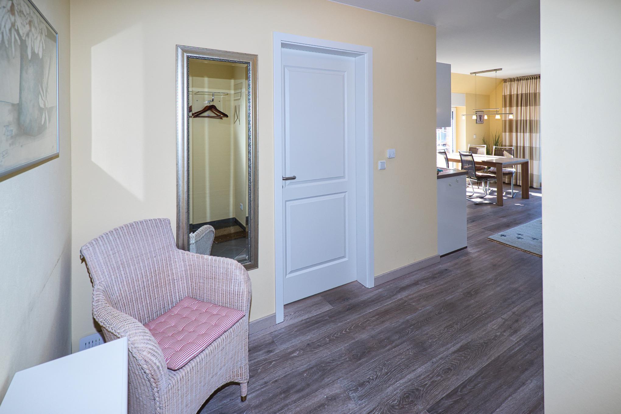 Dünenflair. FeWo 7. Eine luxuriöse 2-Raum Ferienwohnung auf 58m² erwartet Sie hier. Ein wunderschöner Neubau wurde hier geschaffen. Die Wohnung, welche großzügig geschnitten ist befindet sich im 1.OG und erstreckt sich auf ein geräumigen Eingangsbereich mit Garderobe und einem kleinen Abstellraum. Vom Flur aus kommen Sie ebenso ins Badezimmer mit einer tollen Runddusche, sowie in das geräumige Schlafzimmer mit einem großen Kleiderschrank und einem Abstellbereich für Ihre Koffer, sowie einer Sitzbank. Der offene Flur führt direkt in den hellen Wohn- und Essbereich mit Blick auf Felder und Wiesen. Der große Westbalkon mit Balkonmöbeln wird Sie begeistern. Die Einbauküche ist hochwertig und komplett ausgestattet. Die großzügige Gartenanlage, die dem Haus ihren Namen -Dünenflair- gab, verschafft zusätzliche Freiräume. Hier wurde auch eine Grillecke angelegt. Urlaub erleben.
