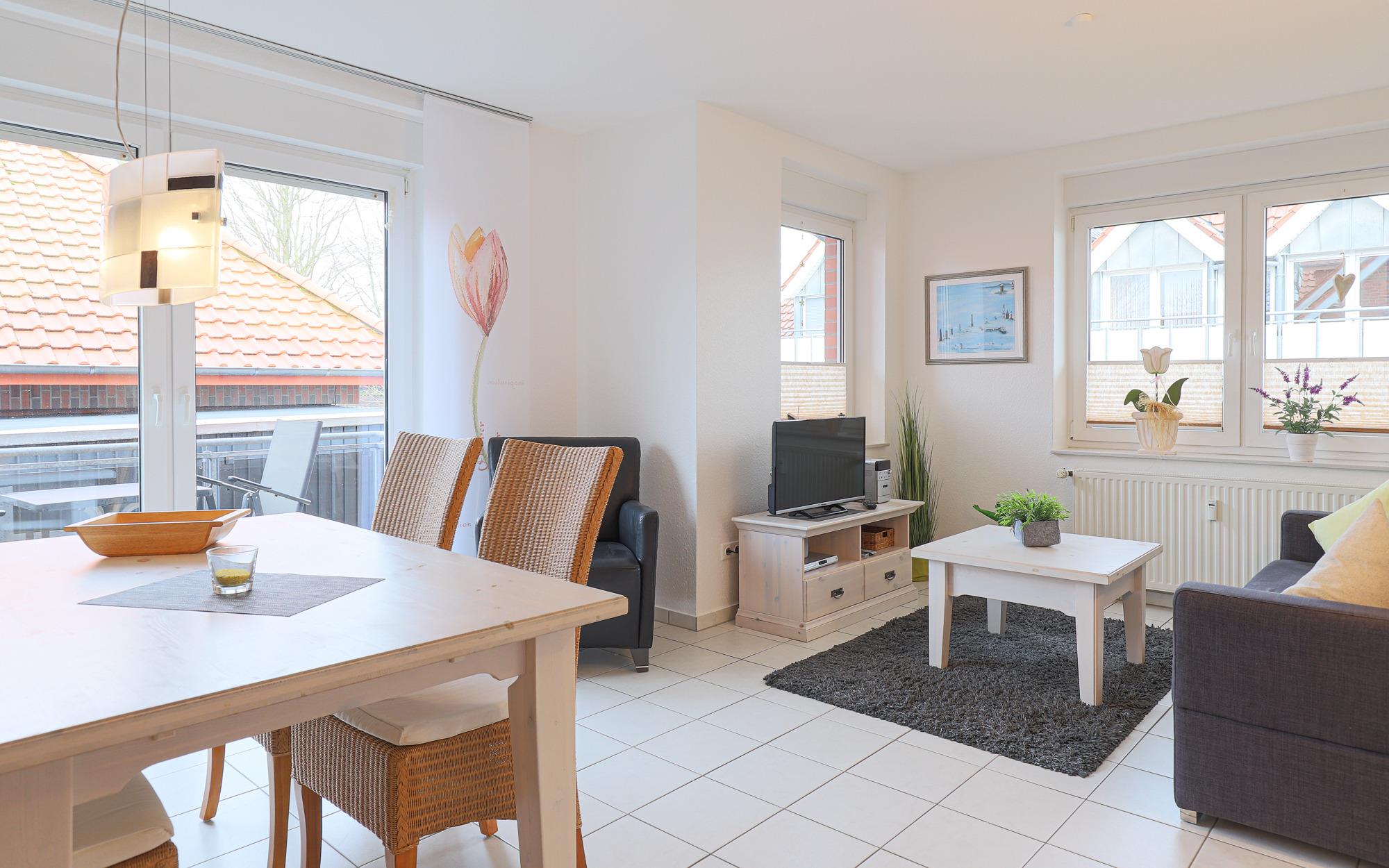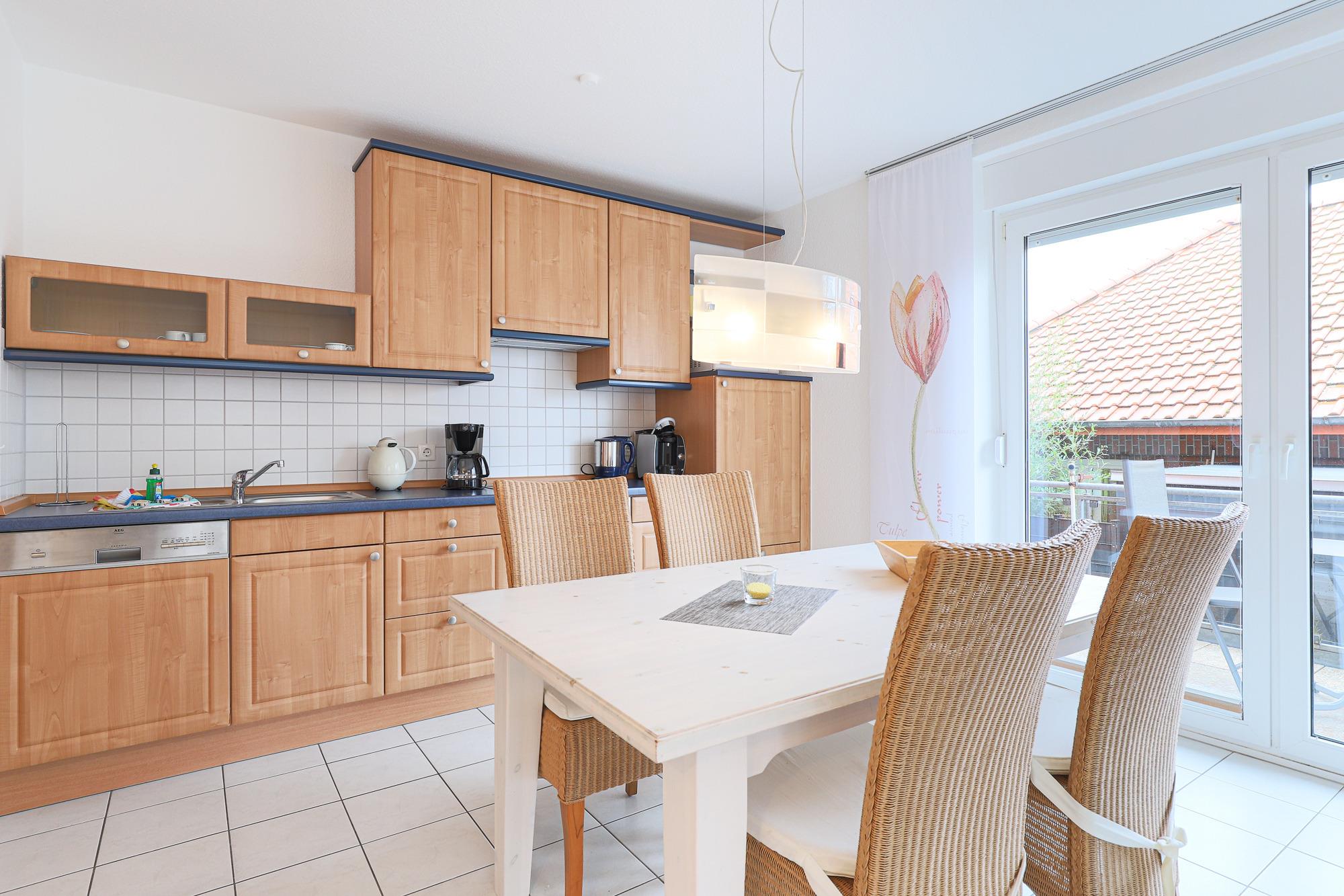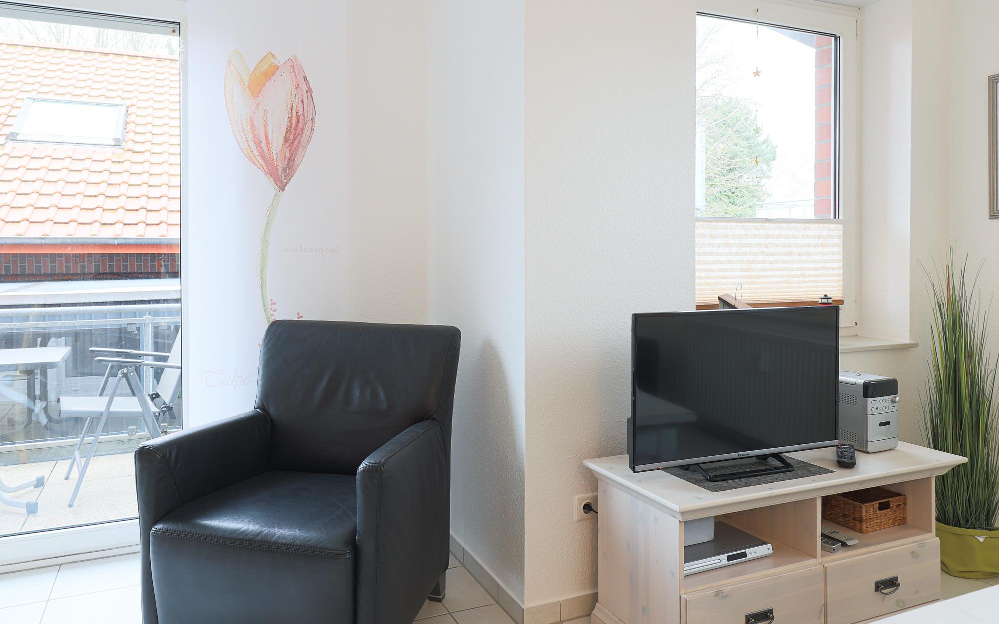 Besonders einladend ist der große Balkon, der zur Nachmittags- und Abendsonne ausgerichtet ist – ein idealer Ort zum Ausspannen. Für das gewisse Extra sorgt ein eigener Strandkorb auf dem Balkon – ein echtes Highlight für entspannte Stunden.