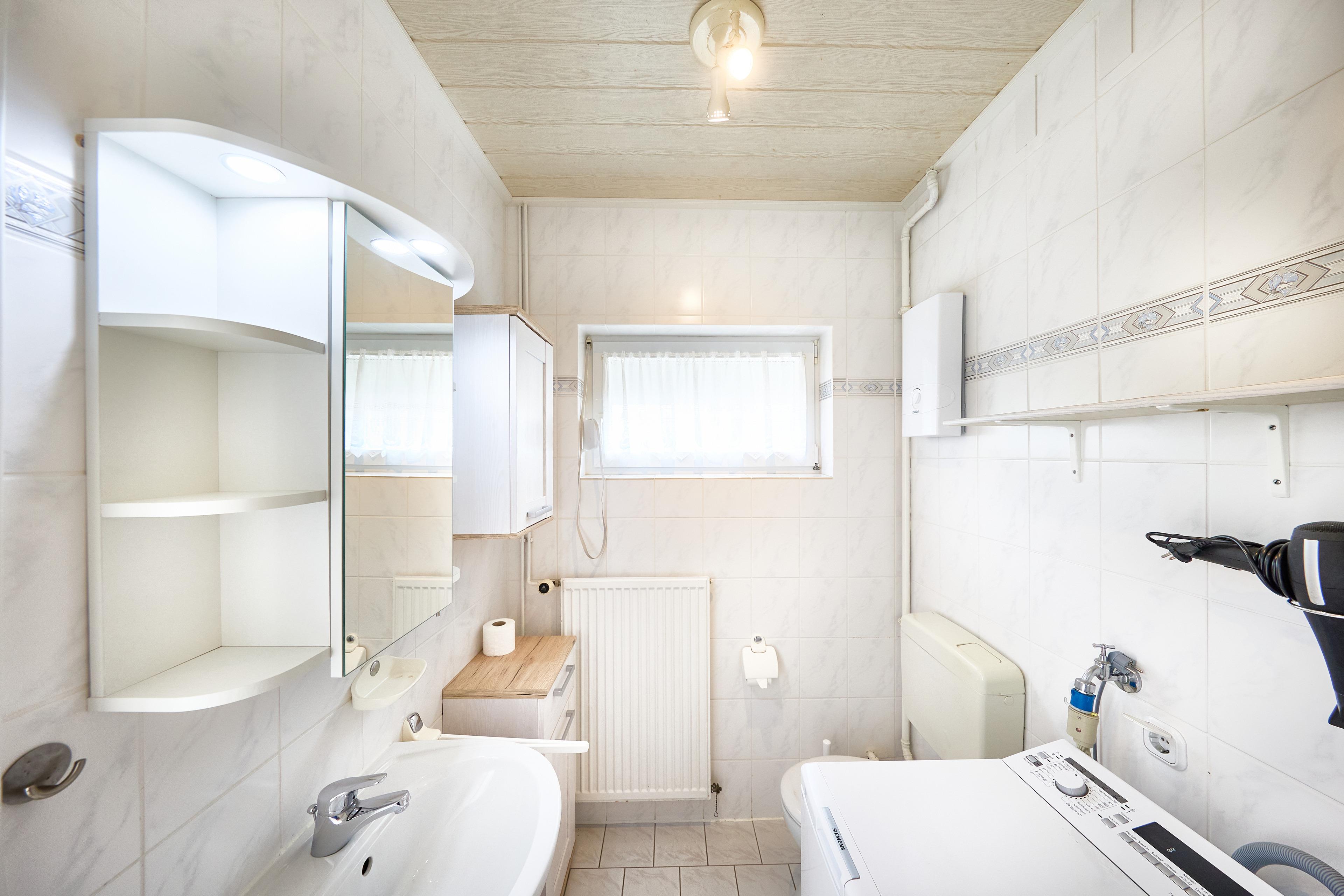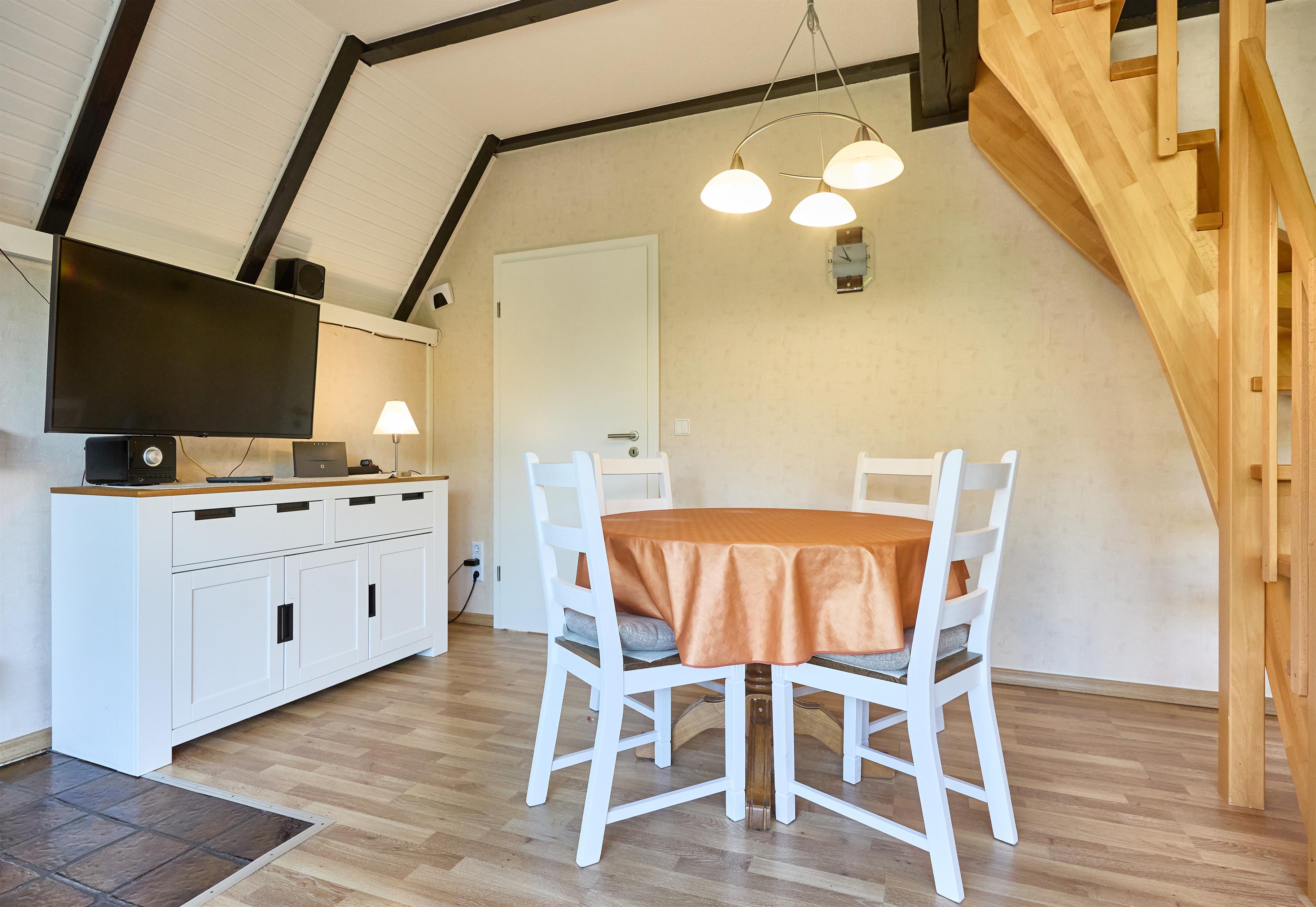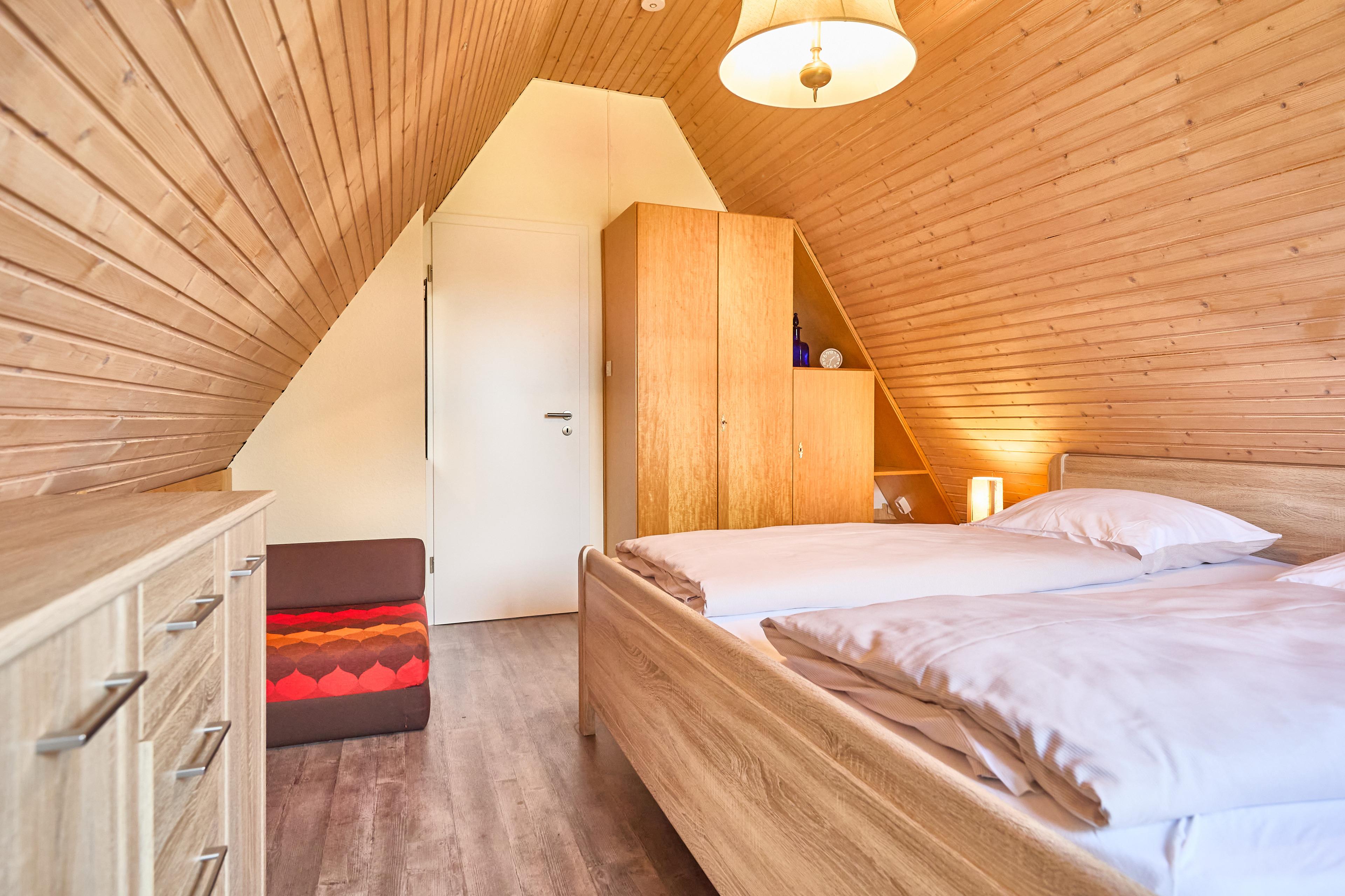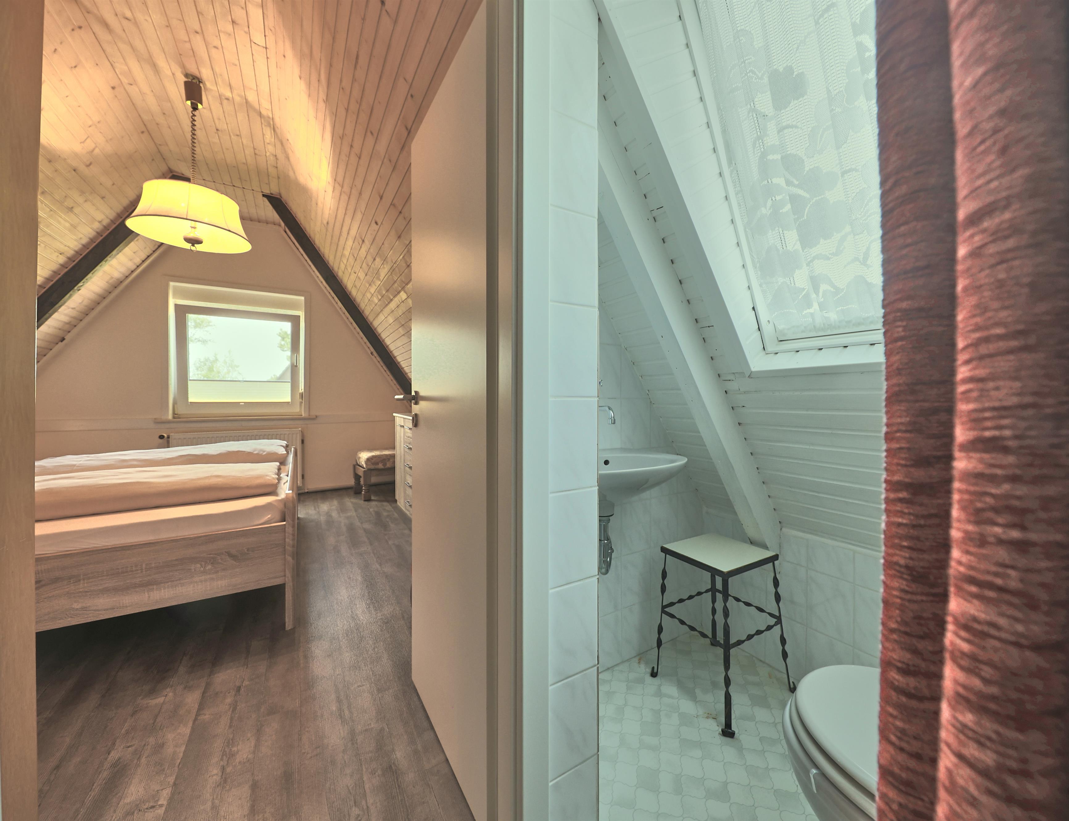 Im Obergeschoss befindet sich neben dem Duschbad mit WC[nbsp] im Erdgeschoss (ausgestattet mit einer Waschmaschine) ein weiteres WC, das vom kleinen Treppenflur zugänglich ist und mit einem Vorhang abgetrennt werden kann. Im 1. Obergeschoss erwarten Sie die beiden Schlafbereiche für bis zu 4 Personen. Bei Ihrer Ankunft sind die Betten bereits frisch bezogen, und eine kostenlose Abstellmöglichkeit für Ihren PKW steht auf der Auffahrt bereit.