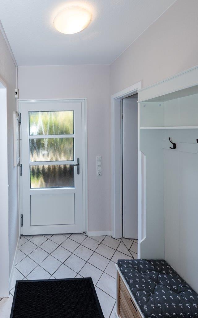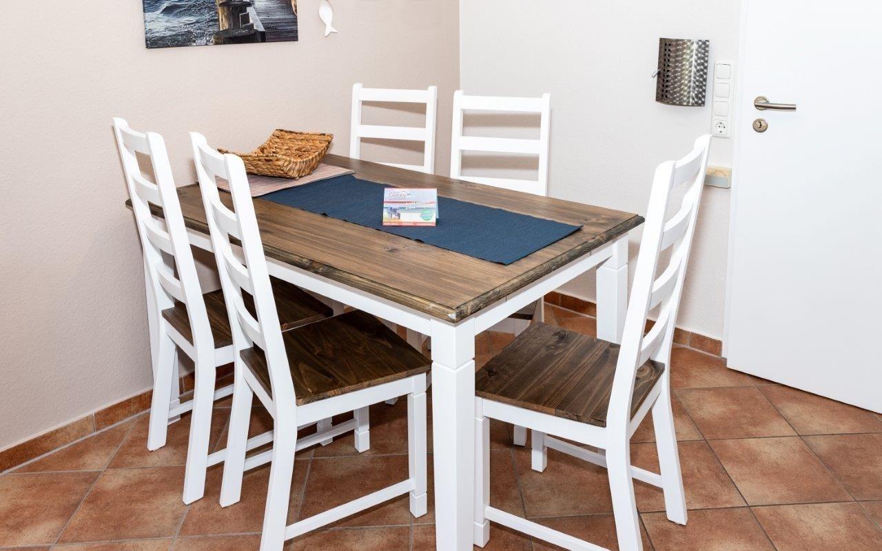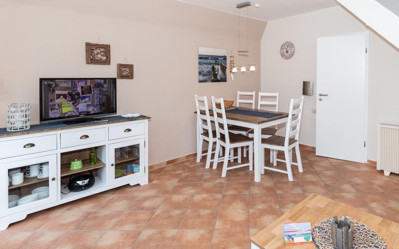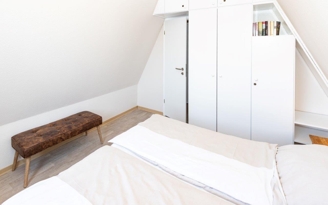 Das Haus verfügt über 2 Schlafzimmer – eins mit einem behaglichen Doppelbett und ein kleines Kinderzimmer mit 2 Einzelbetten. Im Erdgeschoss erwartet Sie ein modernes Duschbad mit WC, während der Wohn- und Essbereich mit einer großzügigen Fensterfront zur Westterrasse gemütlich eingerichtet ist. Die Treppe ins Obergeschoss ist mit normalen Stufen ausgestattet, jedoch ist ihre Nutzung für sehr kleine Kinder (bis 3 Jahre) ohne Aufsicht nicht empfohlen.