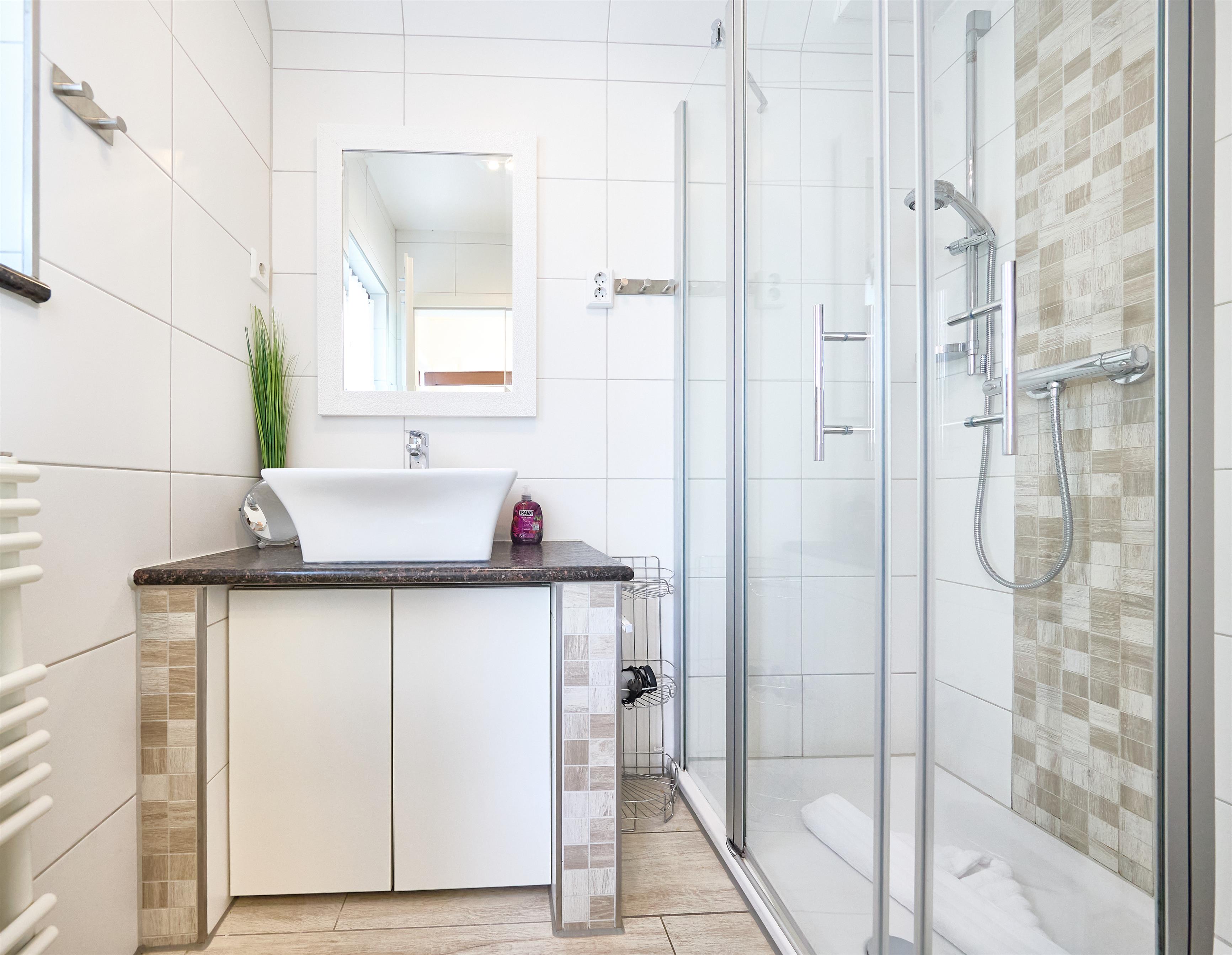 ein Fewo-Starterpaket steht für Sie bereit. Dieses beinhaltet praktische Utensilien wie Duschvorleger, Geschirrtuch, Geschirrspültabs, Spülmittel, Spülbürste, Spültuch, Toilettenrolle und Müllbeutel, damit Sie sich gleich wie zu Hause fühlen können.